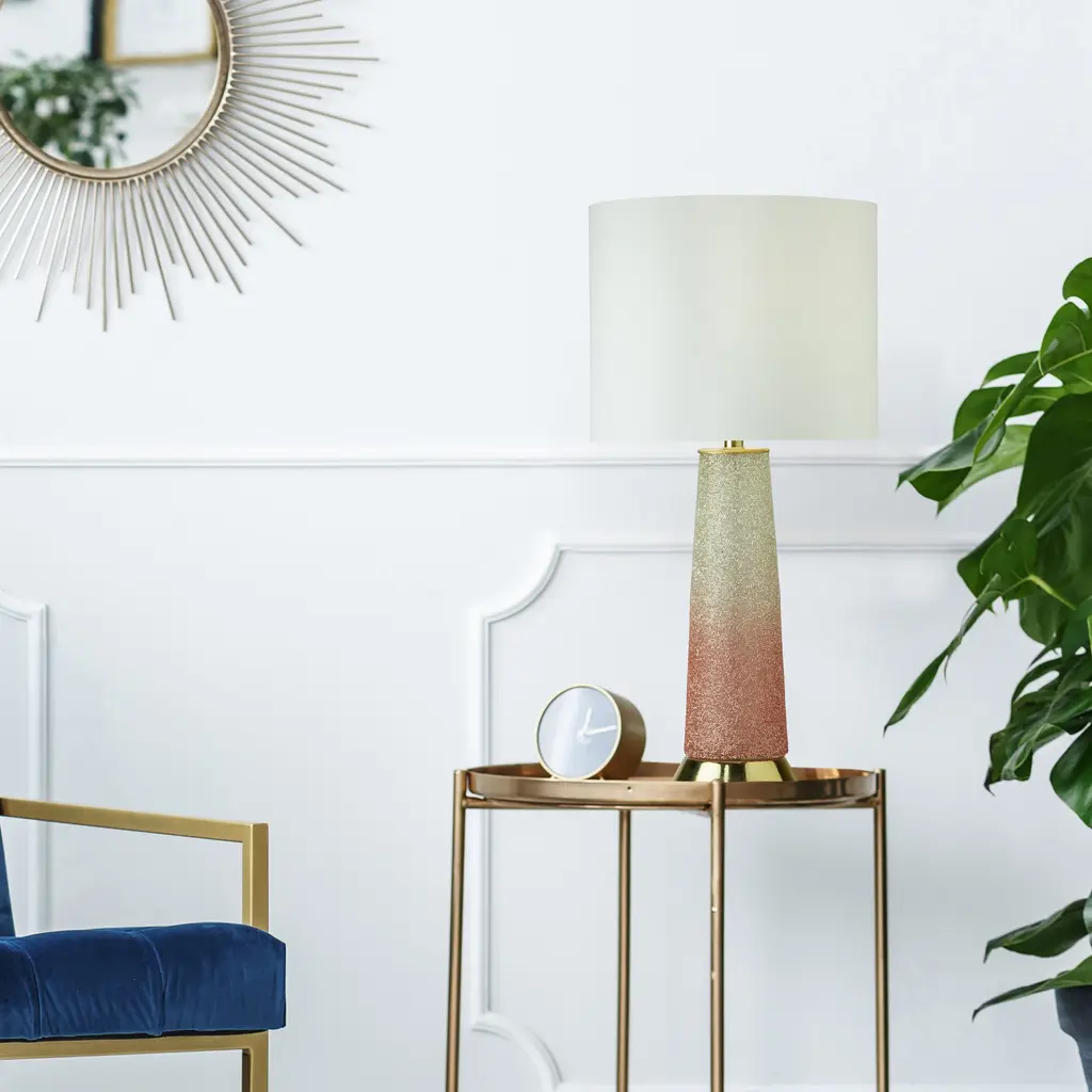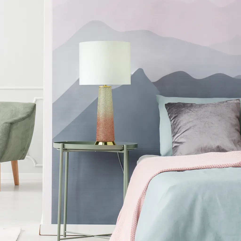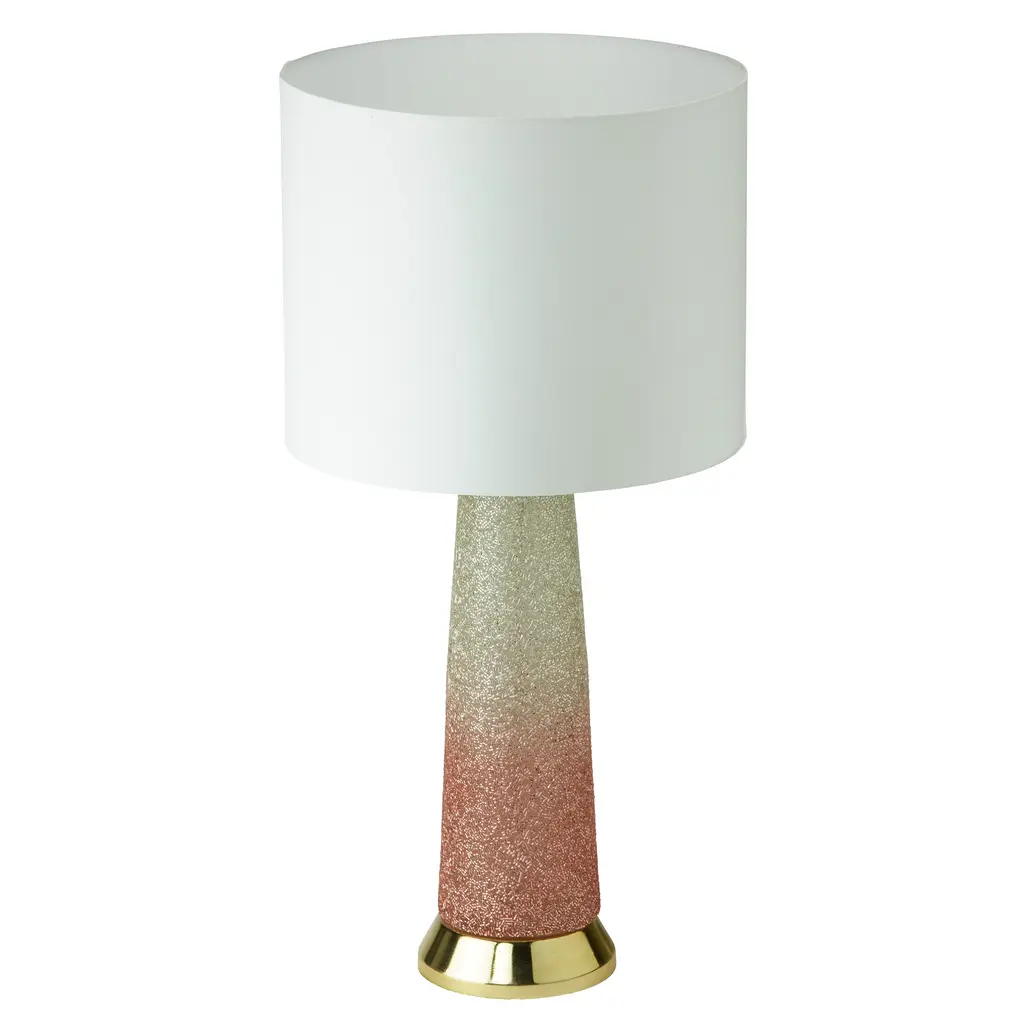 Give the lighting in your living room, bedroom or foyer a stylish update with this mixed-material table lamp. A perfect addition to glam or modern decor, this lamp showcases a cylinder base made from pink/silver ombre beaded glass with a gold-tone metal piece in the center supporting the eggshell white fabric drum shade. This lamp lights up with one 60-watt Type A bulb (not included) and thanks to the 65-inch power cord with an in-line switch, it can easily be placed on any side, console or bedside table.