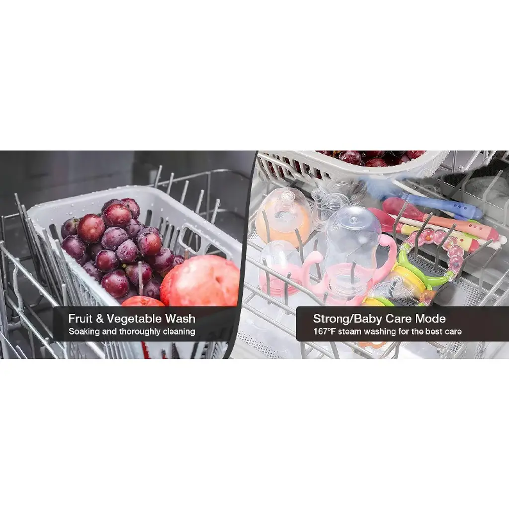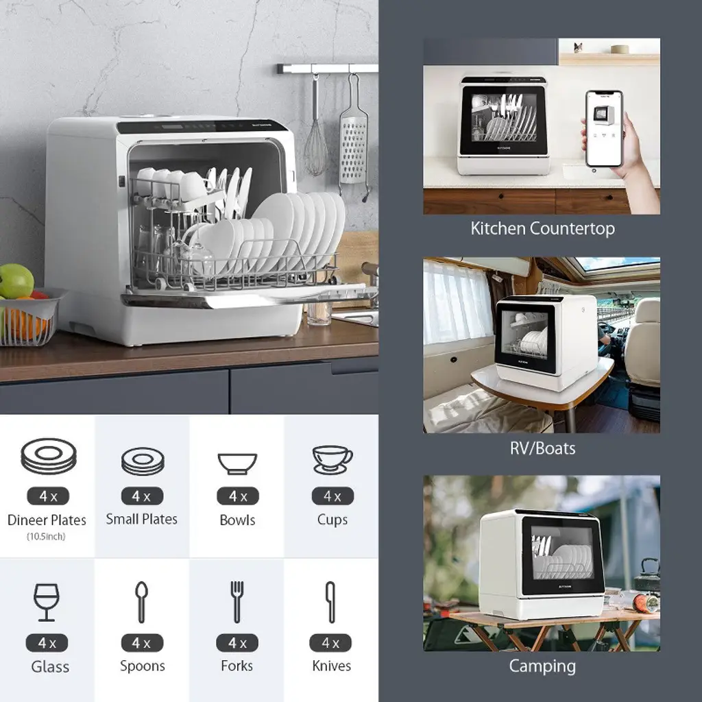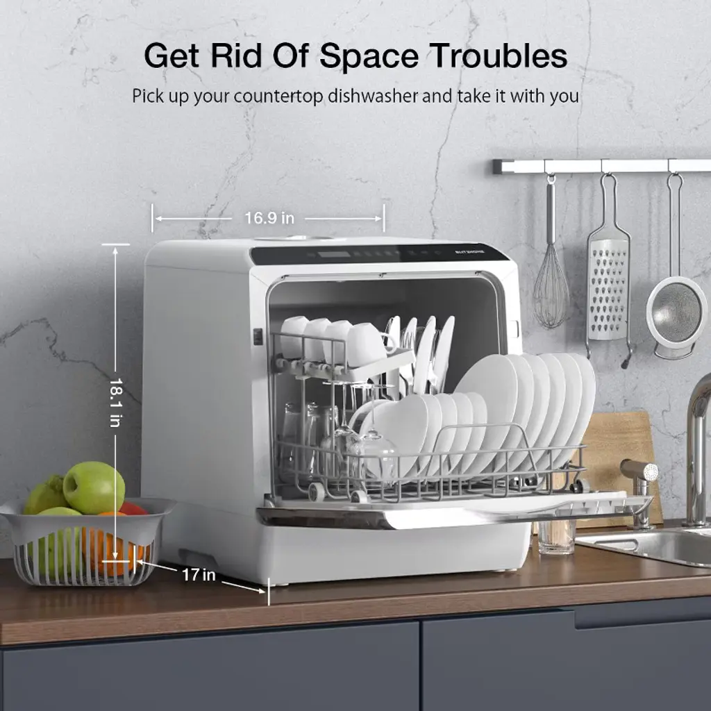 Introducing the Blitzhome Compact Dishwasher, a must-have for small-space living! Designed for dorms, apartments, RVs, or cozy kitchens, this portable powerhouse delivers big cleaning in a slim 17"W frame. Tackle grease and germs with 360° dual spray arms and 167°F high-temp drying, ensuring dishes are spotless and baby-safe.Control cycles via smart app or touch panel, and pick from 5 modes, like Quick Wash, ECO, or Fruit Clean (yes, it washes veggies too!). No plumbing? No problem! Switch between 5L tank or faucet hookup.Holds 4 place settings and fits 12" dishes, with racks and baskets for fuss-free organization. Lightweight, stylish, and ready to upgrade your routine.Target Tip: Measure your space first - this compact gem is as practical as it is cute!110V/900W, 18.1" H, Includes drain hose, fruit basket & more.SPECIFICATIONSPower: 900WVoltage: 110VDry: Hot WindWater Tank Capacity: 5LInnet Pressure: 0.3-1MPaControl Method: Touch Control, APP ControlProduct Weight: 12 kgProduct Assembled Size: 18.89"L x 20.07"W x 20.47"HMaterial: Stainless Steel, PlasticNoise Level: 58 dBPACKAGING INCLUDES1x Countertop Dishwasher1x Manual1x Water Cup1x Adjustable Clamp1x Drain Pipe1x Bowl Basket SetCONTACT USIf you have any problems with our items or services, please feel free to contact us any time.We are always online and do our best to solve your problems and provide you with the best customer services.