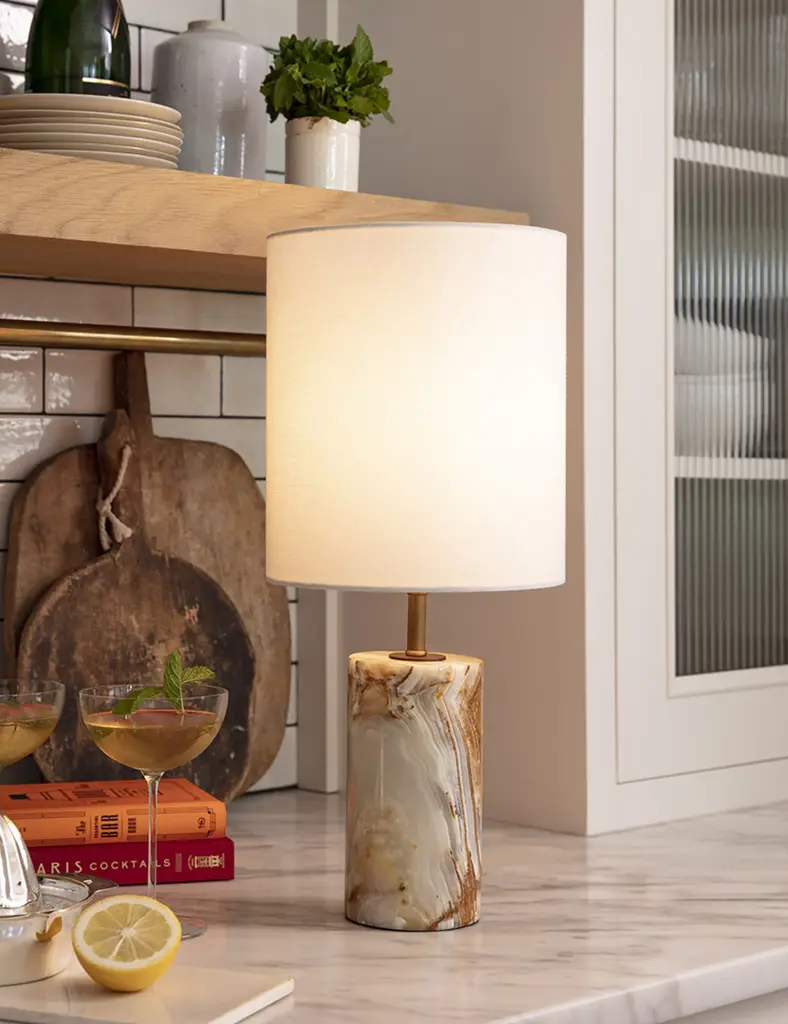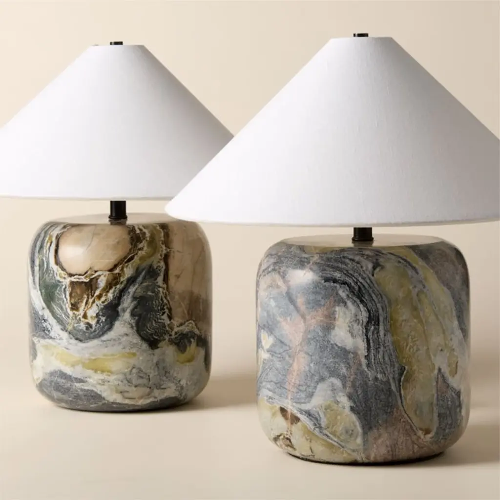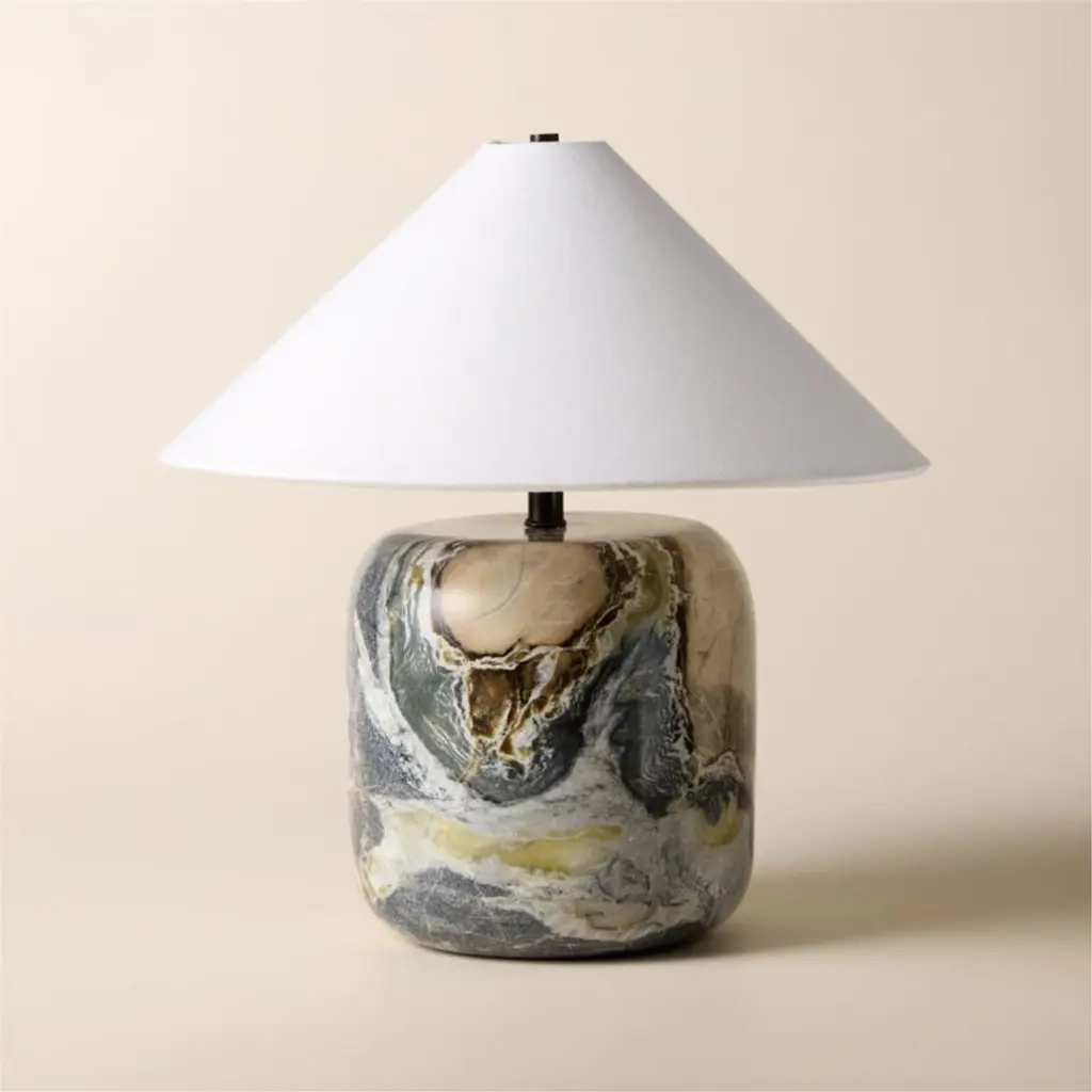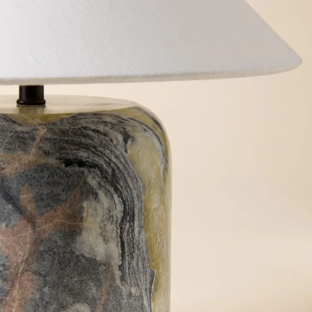 Mini marble table lamp by Melbourne-based design studio VUUE pairs clean lines with an elevated mix of materials. Carved from a solid piece of floral jade marble, the base is topped with a crisp white linen shade to cast a soft glow. The marble's bold veining means no two lamps are exactly alike. CB2 exclusive.