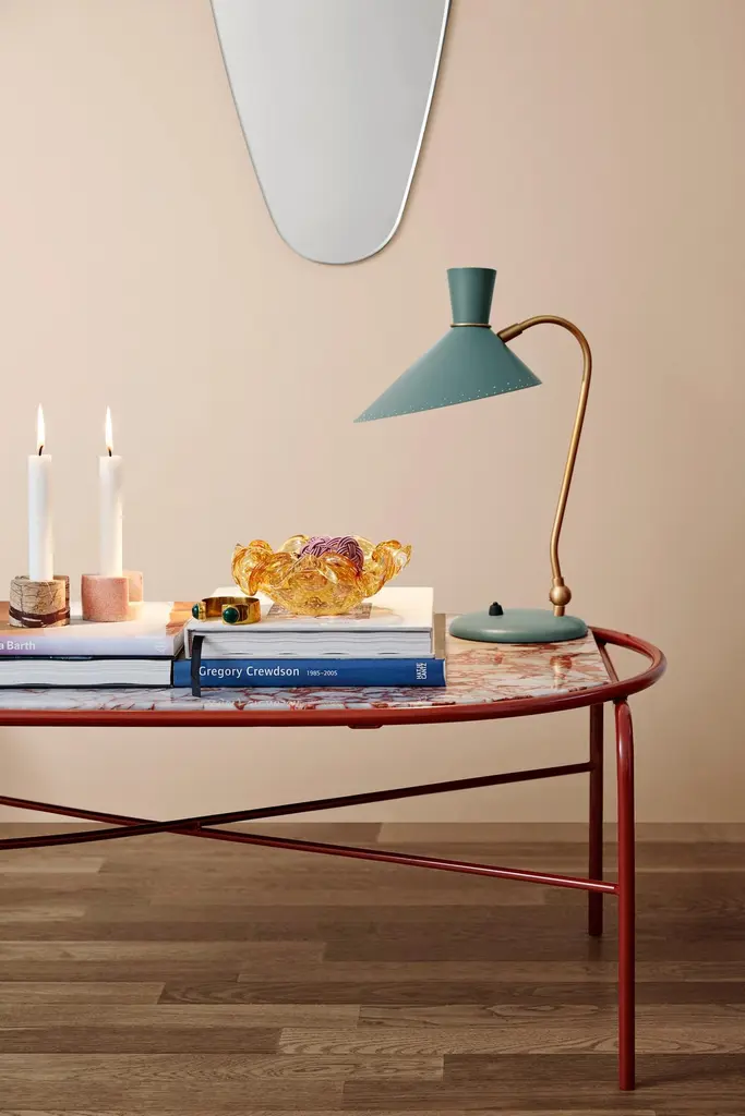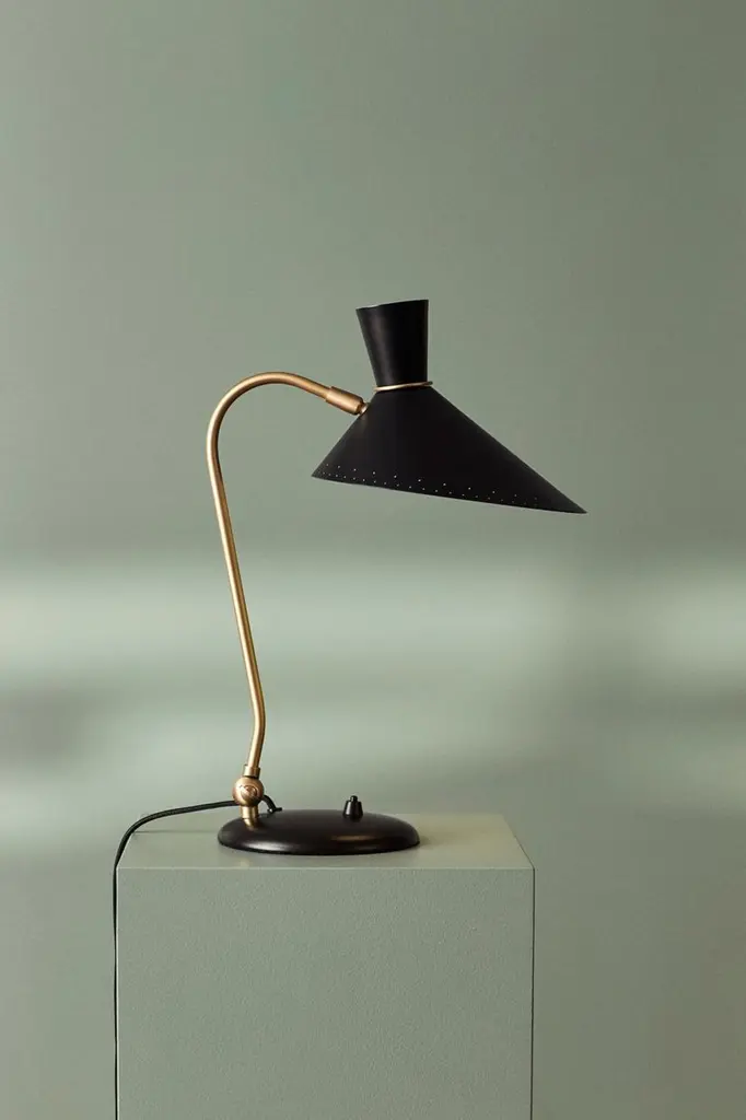 Bloom black noir table lamp by Warm NordicDimensions: D 20 x W 29 x H 42 cmMaterial: Lacquered steel, brassWeight: 2 kgAlso available in different colours.A little table lamp with great personality, designed in the 1950s by the grand master of Danish lighting design, Svend Aage Holm-Sørensen, who is internationally acclaimed. The Bloom table lamp is one of the designer's most iconic lamps and familiar in the vintage community. The combination of playfulness and sharp lines makes the table lamp a beautiful item on a desktop or window ledge. A nice touch is Holm-Sørensen's signature: the characteristic holes in a simple pattern along the edge of the metal shade, which add an extra dimension to the lighting effect. Warm Nordic is an ambitious design brand anchored in Nordic design history and with a timeless, aesthetic style that inspires you to appreciate the little things in life. The company is the result of several years’ intense work on developing a new design brand with design history, quality and personality at its core. Warm Nordic boasts a colourful and charming universe of furniture, lamps and accessories full of personality. Our designs encapsulate the Nordic spirit, which in its essence is timeless, inclusive and warm.
