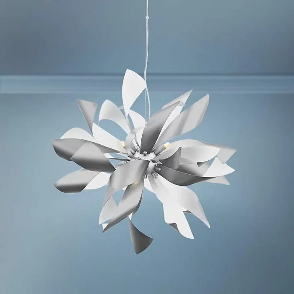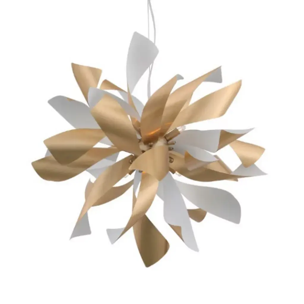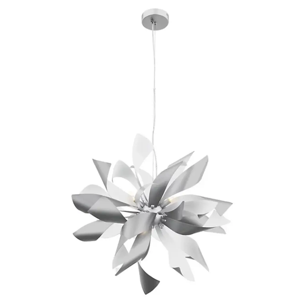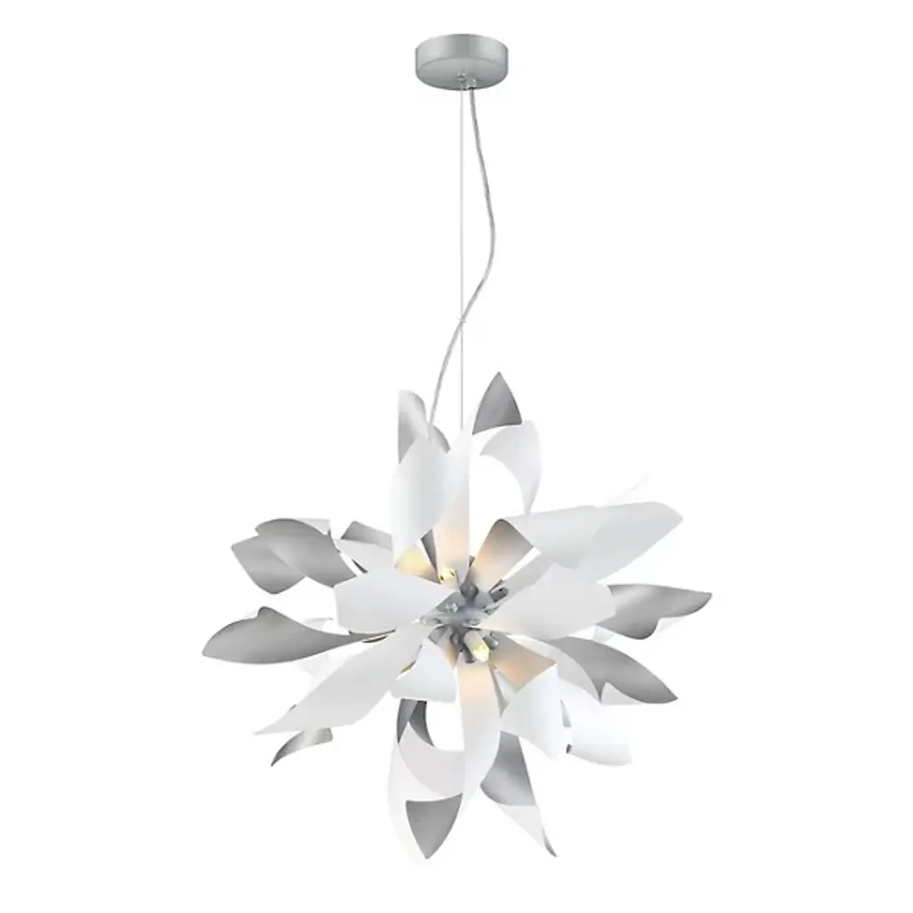 Bring a balanced, natural shape to your indoor spaces with the Bloom Chandelier from Zeev Lighting. This elegant transitional fixture starts with a disc ceiling mount that drops a round hub studded with small open sockets and metal pegs. These small pegs are then split down the middle to hold aluminum strips that curve out to form natural petal shapes, creating a flowering blossom accentuated by cleverly situated, partially obscured lamping.