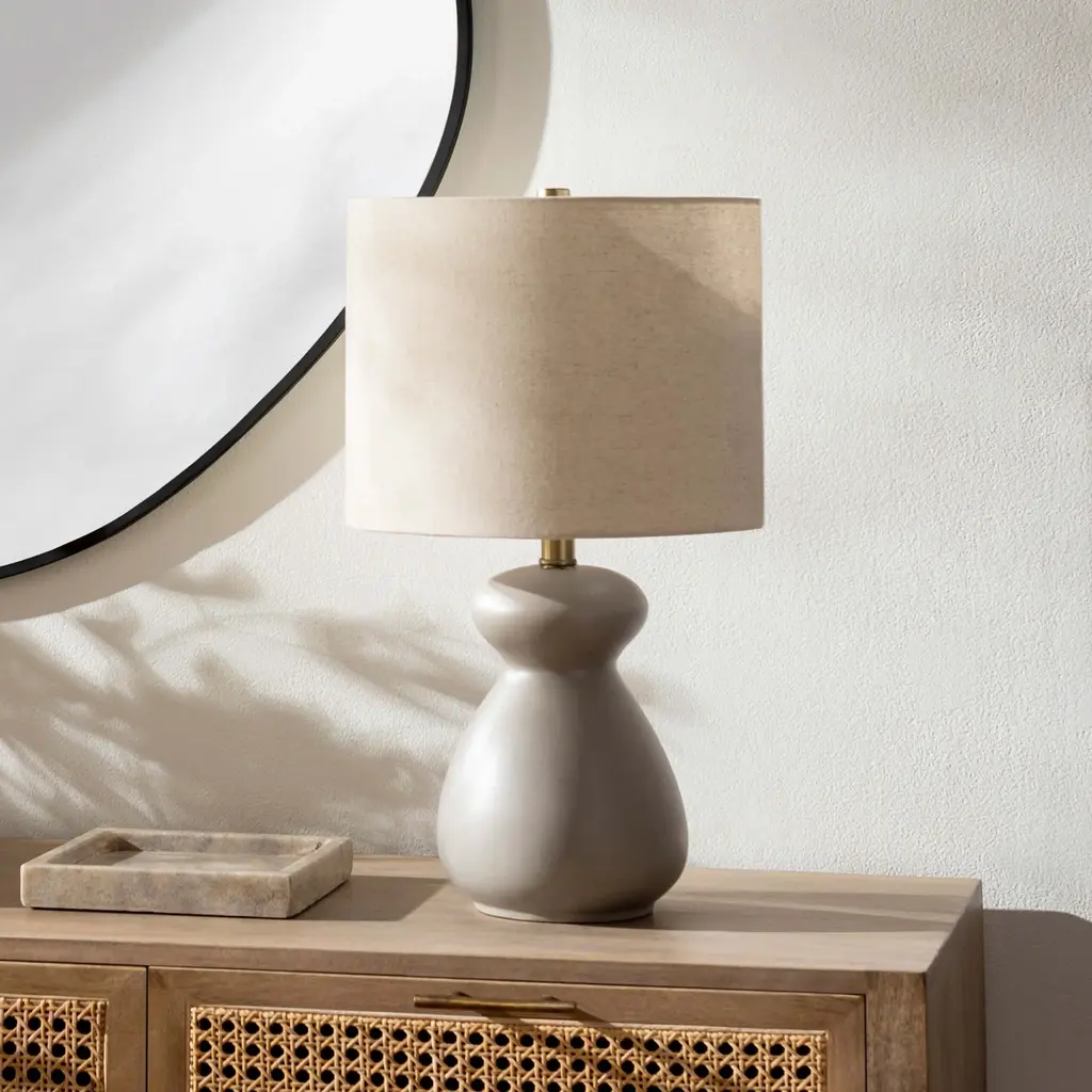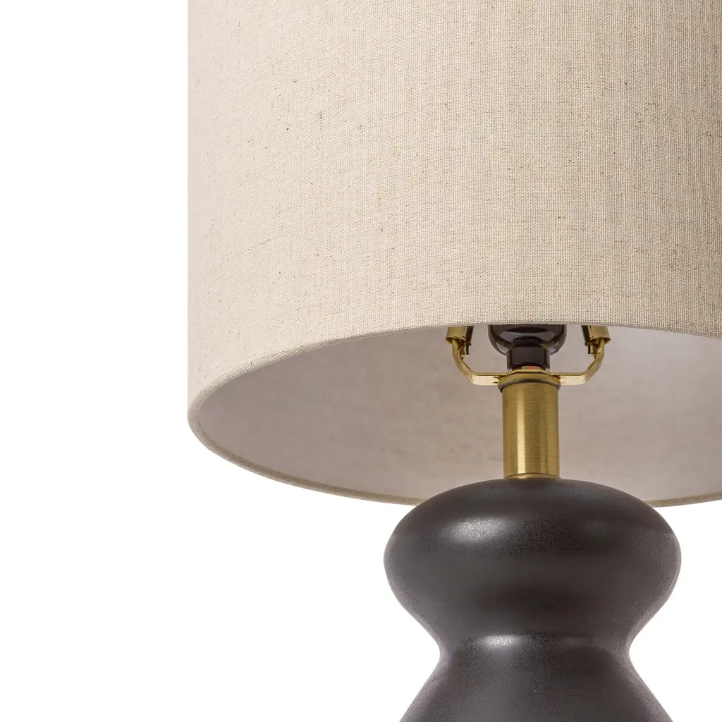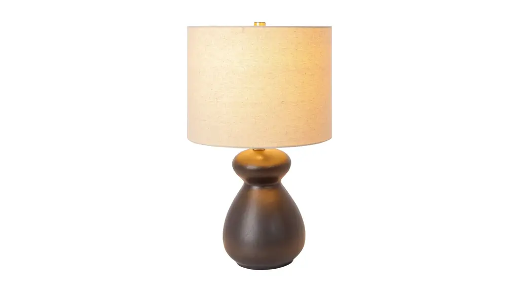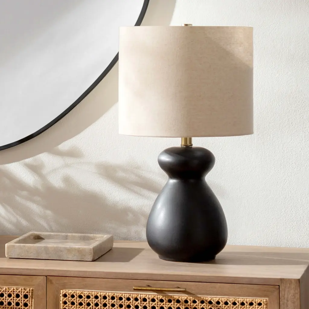The Bloom Table Lamp features a gracefully curved ceramic base, available in crisp black or creamy beige. Designed to capture a feeling of organic modernism, the Bloom Table Lamp delivers softly diffused light, perfect for creating warmth and ambient lighting in your space. Features - Ceramic base with light beige linen shade - 6-ft. cord - Rotary on / off switch - Use with E-26 base bulb up to 100W (not included)