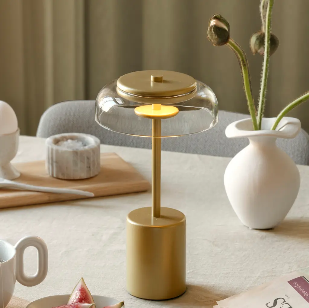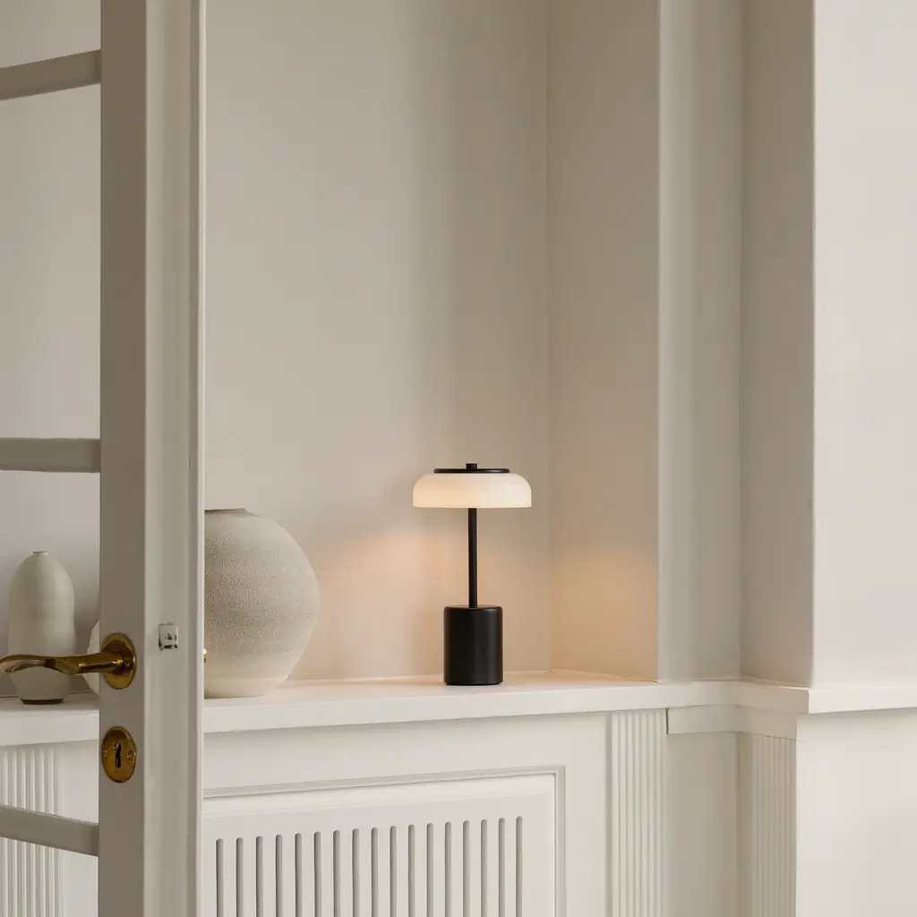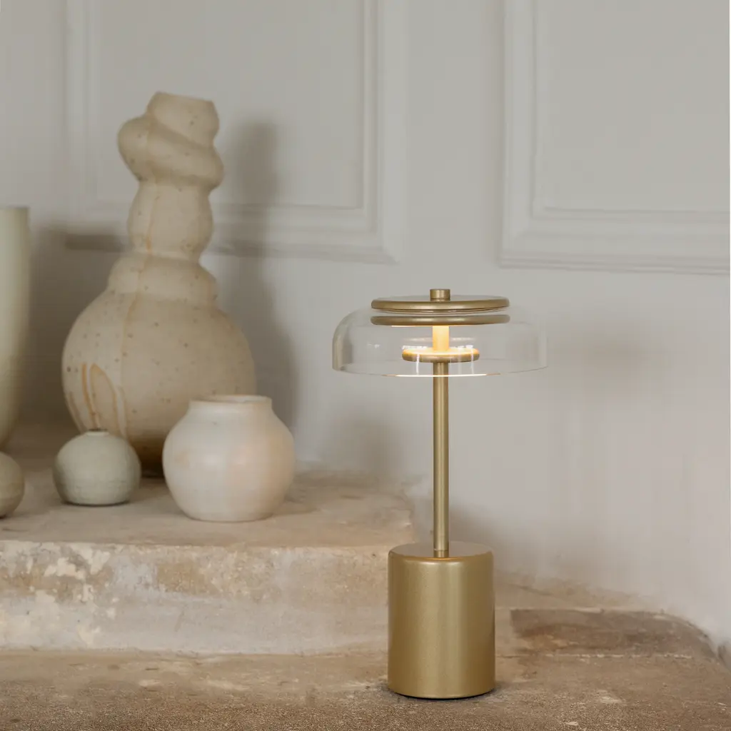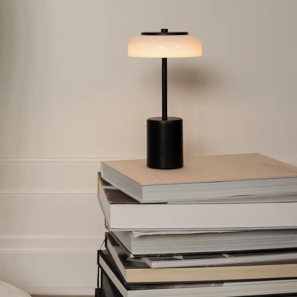 The Mini Table Lamp blends simplicity and practicality in a compact, portable design. It features a round metal base in either gold or black, paired with an opal or clear glass shade that gently diffuses light for a warm, ambient glow. Powered by energy-efficient LED technology, this rechargeable lamp uses a USB-C connection and offers up to 10 hours of adjustable lighting with three brightness settings. With an IP65 rating, the Blossi Mini is suitable for both indoor and outdoor use, combining style with adaptability.