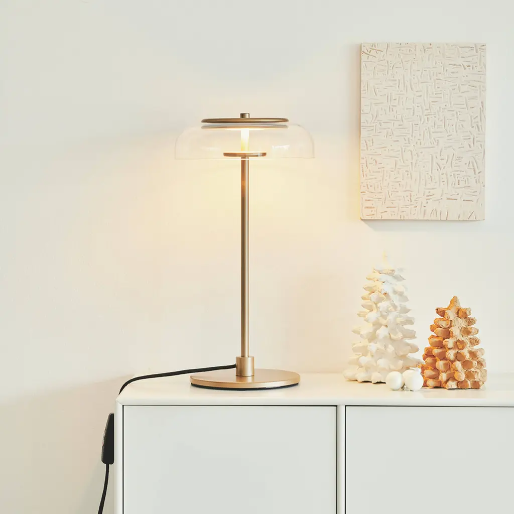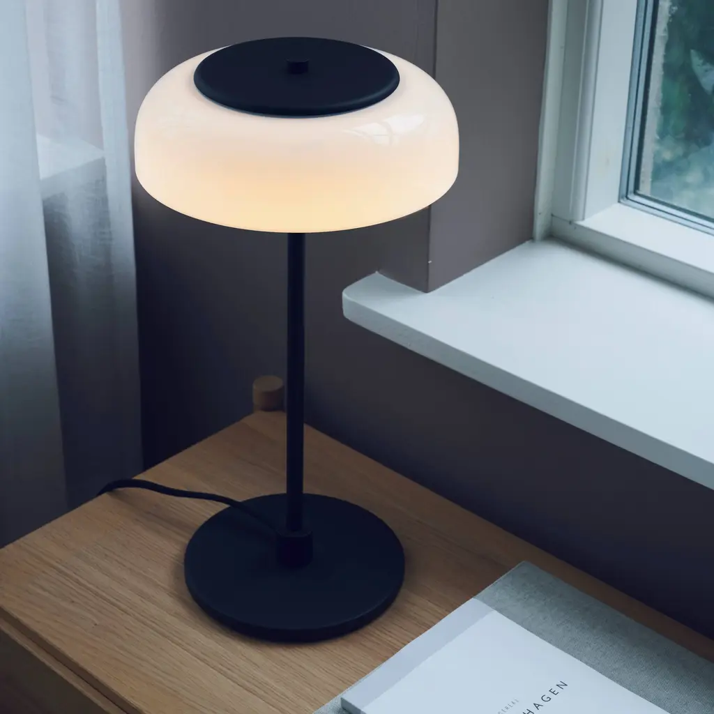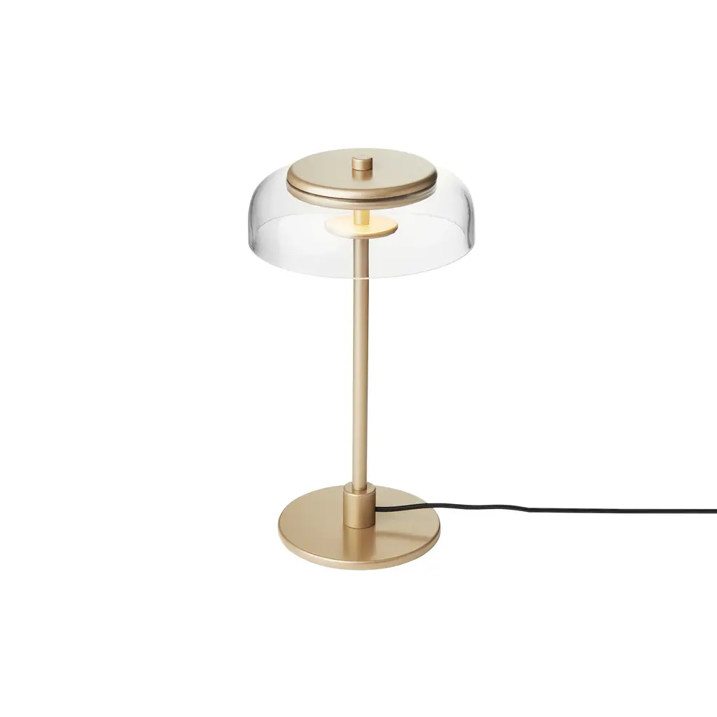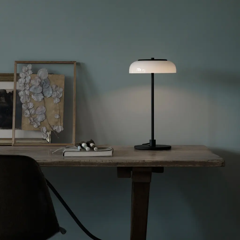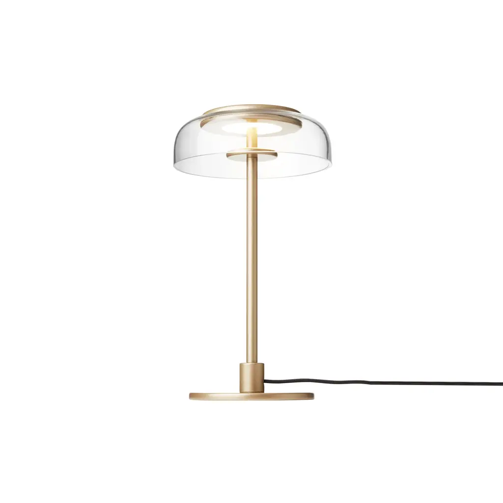 As a high-style desk accoutrement or simply for general illumination in a room, this table lamp is a sophisticated melange of romantic Nordic inspiration and high-tech lighting technology. Danish designer Sofie Refer found her touchstone in the warm light of a Scandinavian autumn and fashioned Blossi to give off a transporting warm, even illumination. Reflected in the lamp's beautifully rounded, mouth-blown glass shade, the light emanates from a specially developed LED disc rated to function for 50,000 hours. With its slimly elegant gold-tone base or the new black finish, the table model adds a discreet finishing note to any setting.
