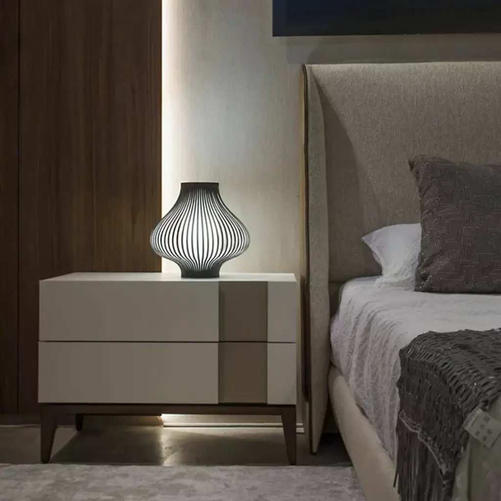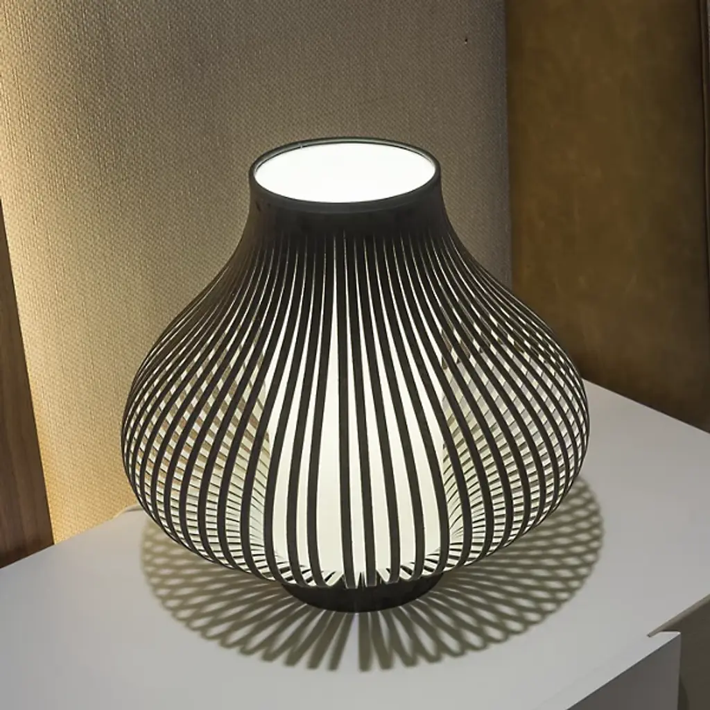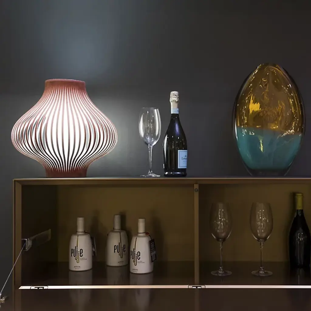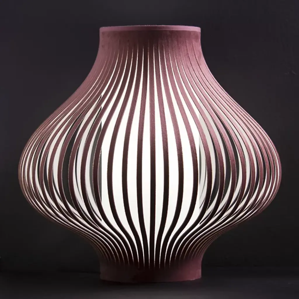 The Blossom Small Table Lamp from Uplight Group Essentials is a flourishing element in the home, balancing sculptural, floral form with invigorating light. The Uplight Group creates contemporary designs that stress accessibility, accuracy, and reliability. This contemporary design tops the table like a free-standing sculpture. French velvet strips flow up and curve out from the base, evoking the soft, bulbous silhouette of a ready-to-blossom flower. The strips and the internal diffuser create a soft, glare-free light while producing a decorative graphic image. The light flows up the diffuser and sifts through the airy form to create a calm, moody glow.