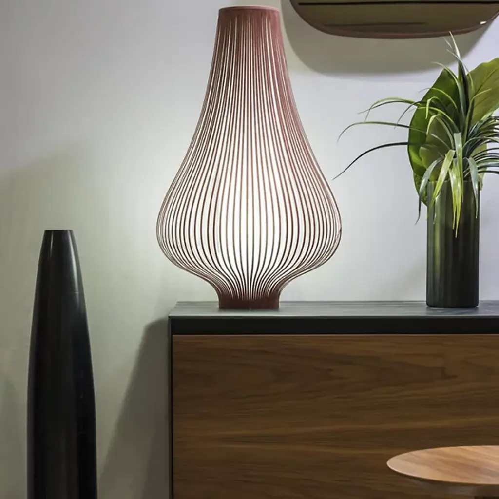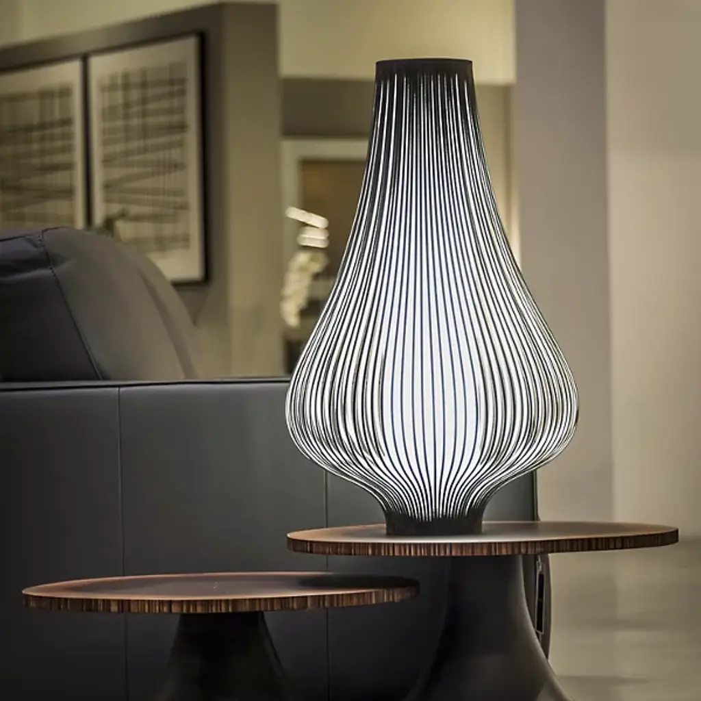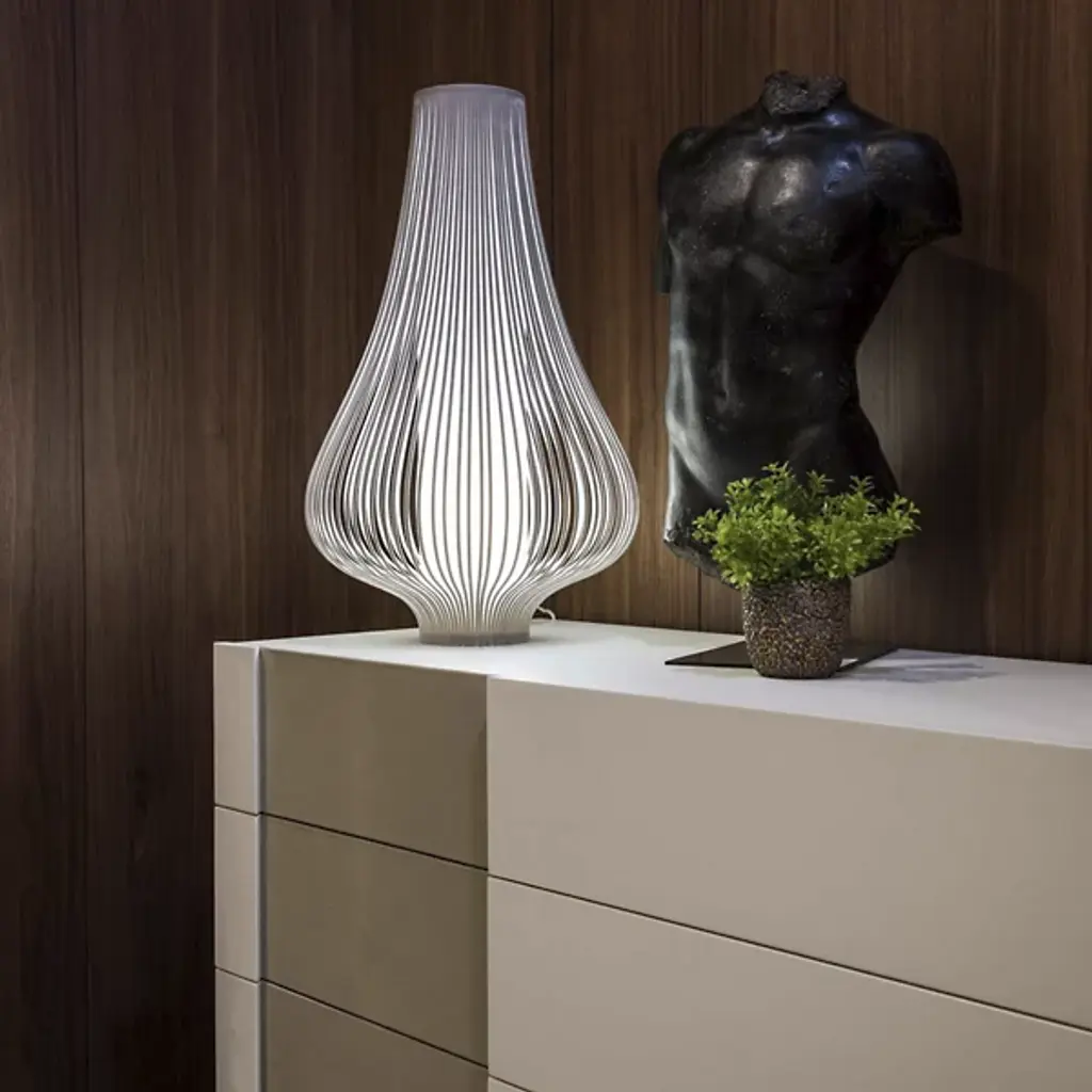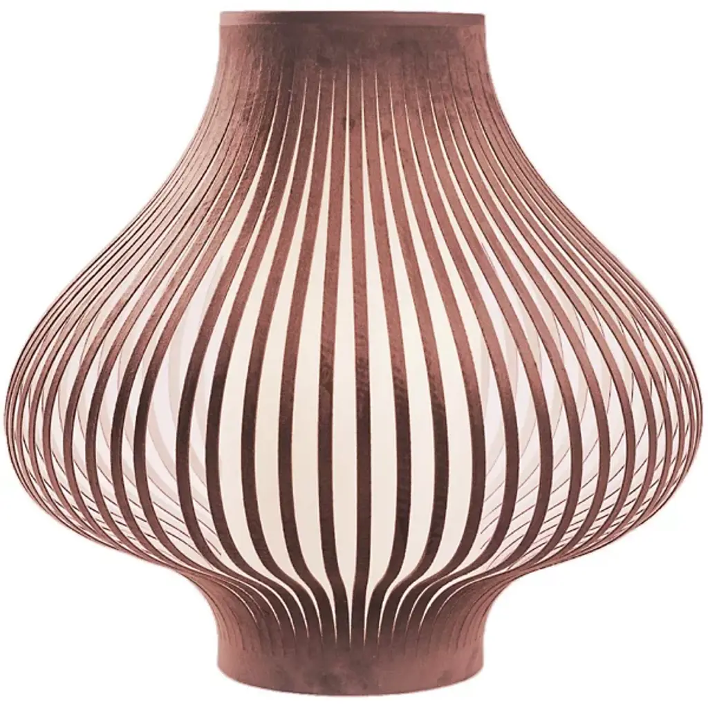 Handmade by artisans in Spain from high-quality materials, the Blossom Table Lamp is a piece of contemporary design presented by Uplight Group Essentials. It is equal parts artwork to interior lighting application, as the curved lines of the lamp’s silhouette are sculptural in feel, and each ridge of the bodice has been lined with French velvet. Light flows through each opening in the lamp to provide a pleasant ambient glow.