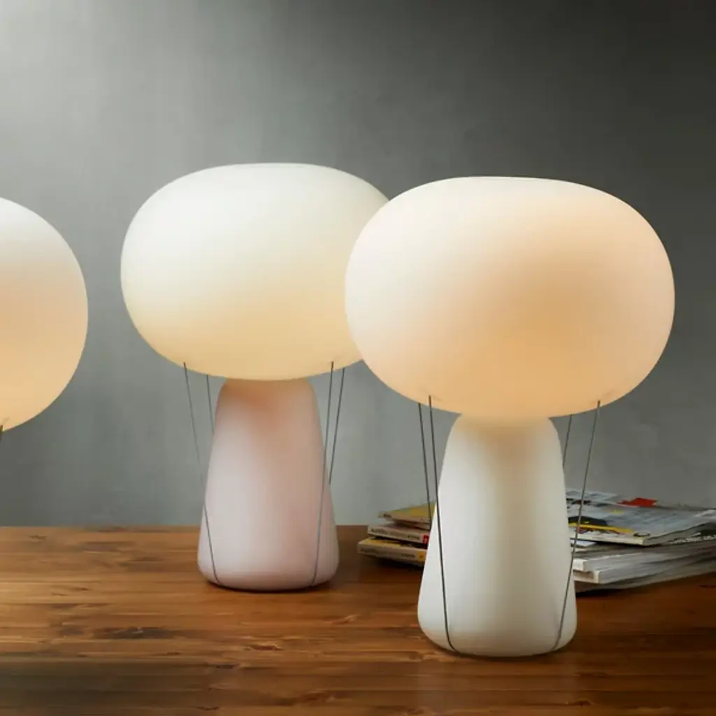 A balanced design inspired by the floating form of a hot air balloon, the Blow Table Lamp by Nude is a beautiful piece from Switzerland-born designer Tomas Kral. Equal parts functional and sculptural, the tapered, solid base of this table lamp is connected to a handmade, crystalline shade using simple rubber bands. The smooth, simple silhouette of this design is reminiscent of its inspiration with a minimal, whimsical feel that lends a soft, welcoming glow to surroundings.