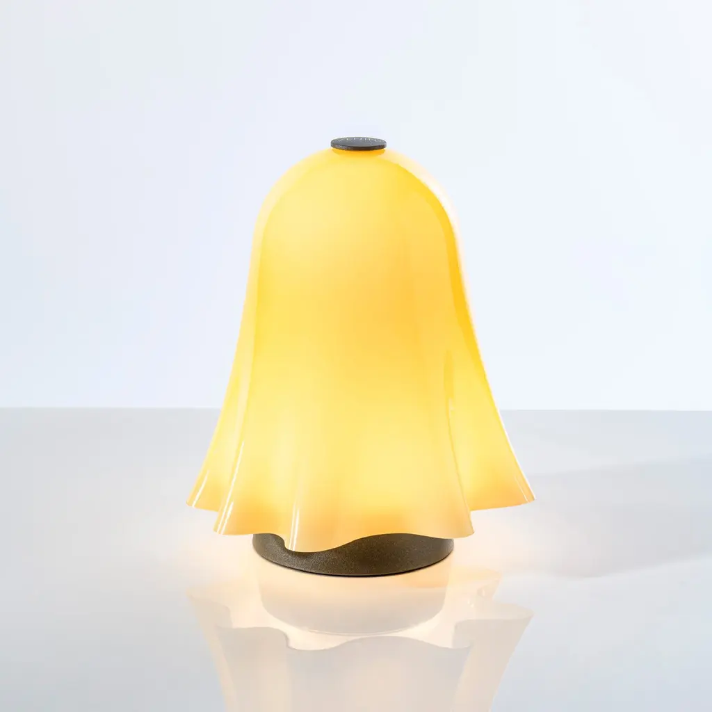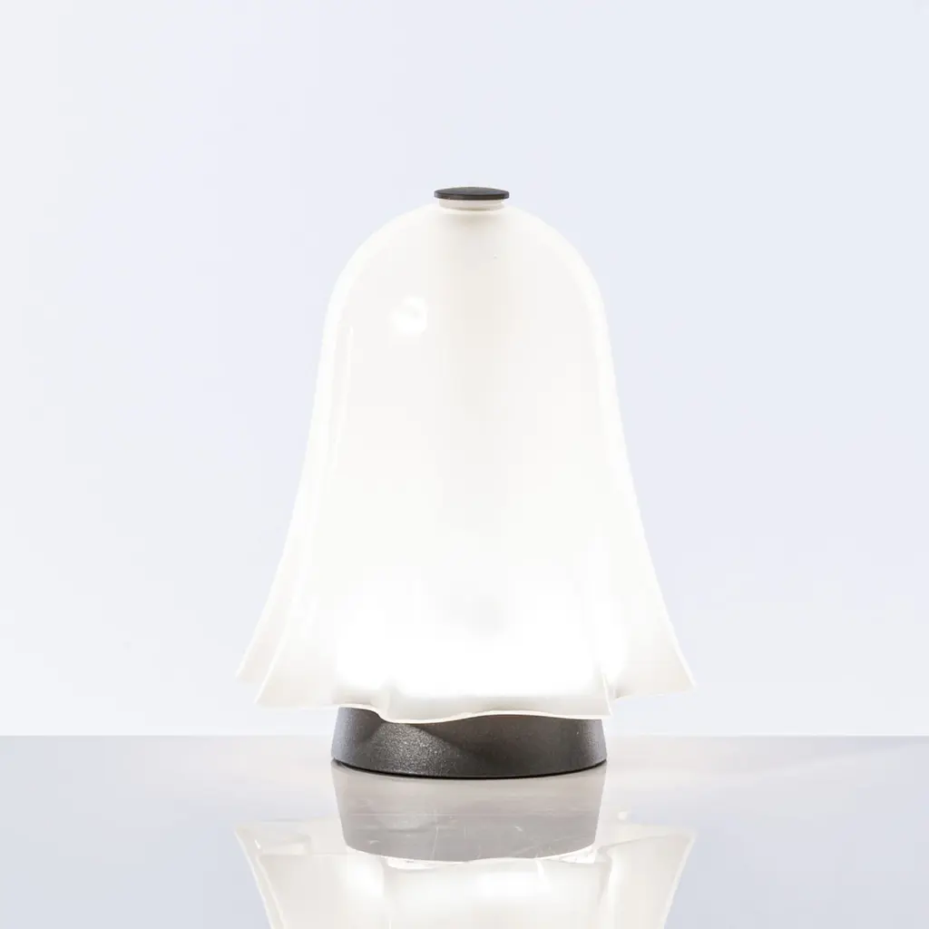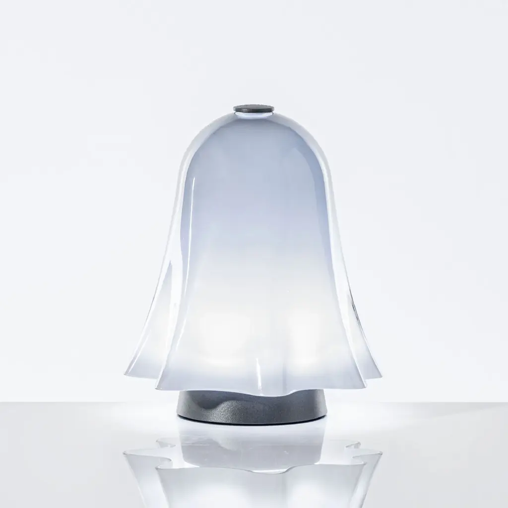 The expert glass processing gives this object a light movement, as if it were suspended in space; its iconic shape comes from an exclusive archive prototype and brings a playful touch to living spaces. The special relationship between light and matter that has always characterized VENINI glassworks returns in this lighting line, with table and floor proposals that suggestively rework the Opalini technique dating back to the 15th century. The shape recalls the iconic Fazzoletto vase by VENINI, designed in 1948, but is animated with a contemporary touch thanks to its portable use.