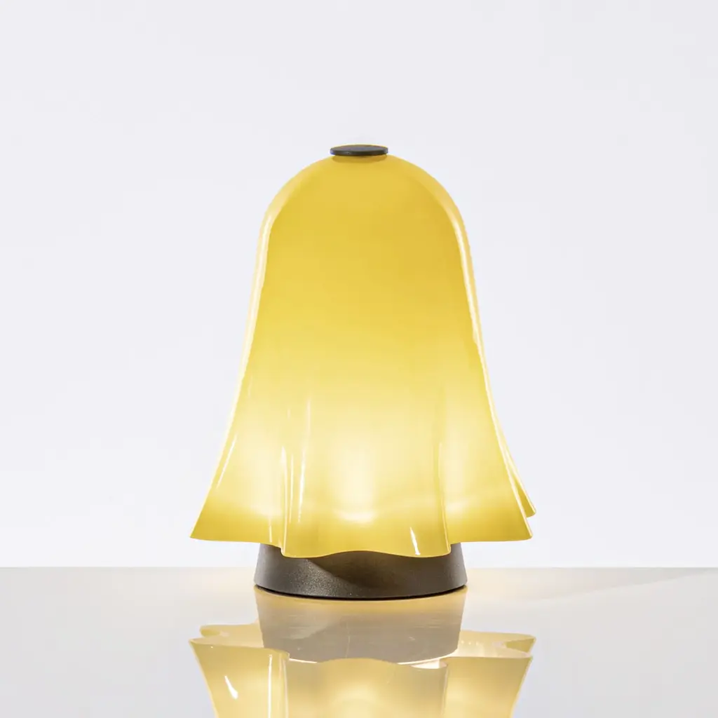 The expert glass processing gives this object a light movement, as if it were suspended in space; its iconic shape comes from an exclusive archive prototype and brings a playful touch to living spaces. The special relationship between light and matter that has always characterized VENINI glassworks returns in this lighting line, with table and floor proposals that suggestively rework the Opalini technique dating back to the 15th century. The shape recalls the iconic Fazzoletto vase by VENINI, designed in 1948, but is animated with a contemporary touch thanks to its portable use.