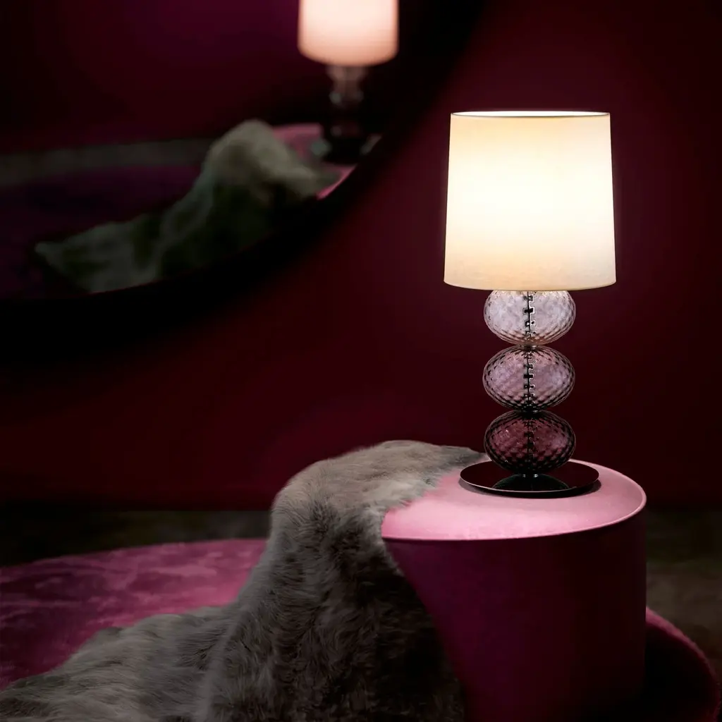 Illuminate your space with elegance and sophistication using our Venini Abat-Jour Table Lamp. The Murano-inspired design features hand-blown "balloton" glass elements that capture light in a timeless and unique way. The stem is available in multiple colors, while the sleek chromeplated or black nichel metal base adds a touch of luxury. Transform your space into a work of art with this exclusive table lamp.