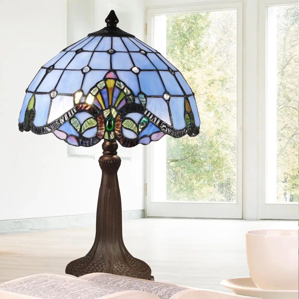 The shade of the Blue Baroque Table Lamp is hand made using the traditional copper foil technique. The colors and shape of individual Hand Rolled Art Glass (Tiffany) of the Blue Baroque Table Lamp will not just illuminate but decorate any space in your home. It would be perfect for a desk, and or smaller end tables and or nightstands._ This lamp will provide your family with generations of stylish lighting._