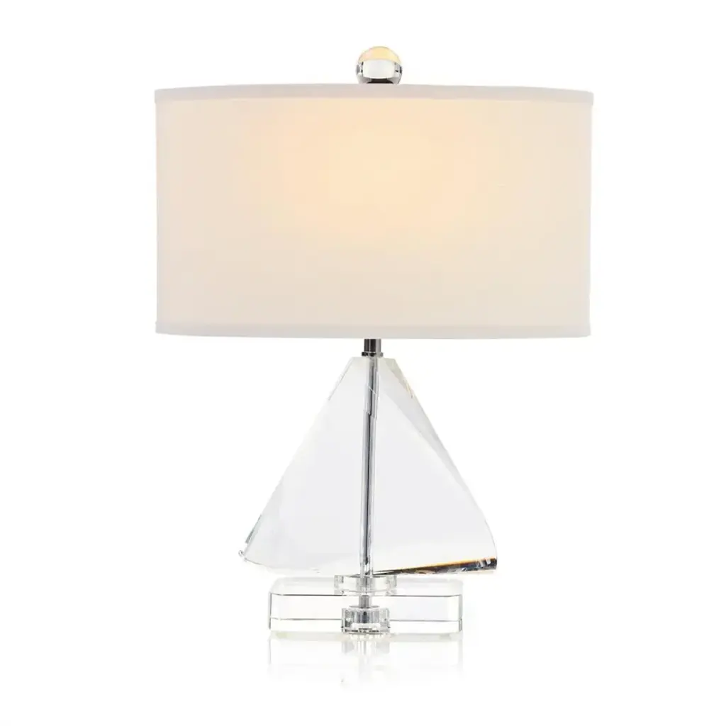 This abstract oval shape table lamp in a polished silver is finished on the inside with blue glass nuggets and sits on a large cylinder acrylic base.