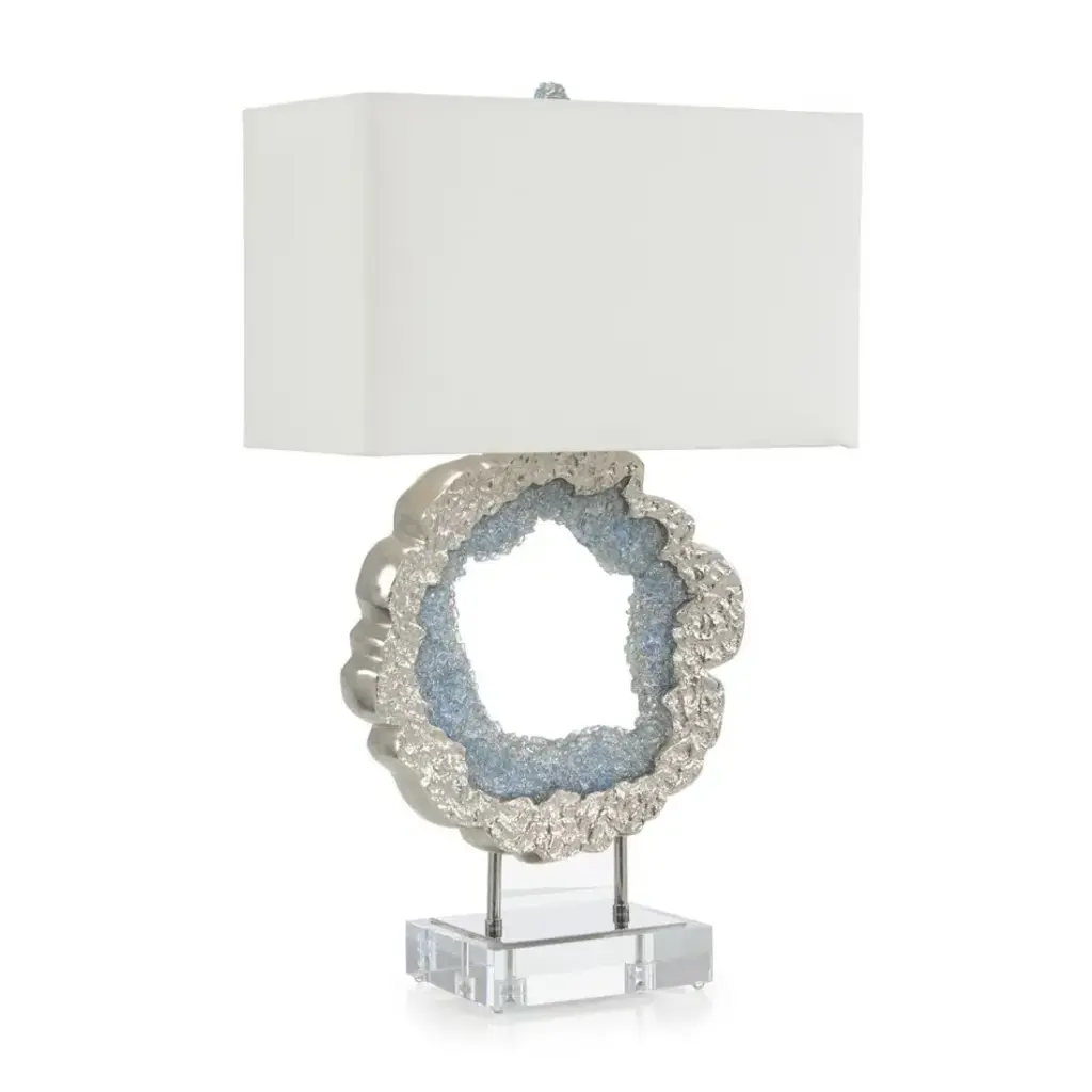 This hammered nickel table lamp is organically sculpted with inlaid geodes of sea blue glass atop an acrylic base.