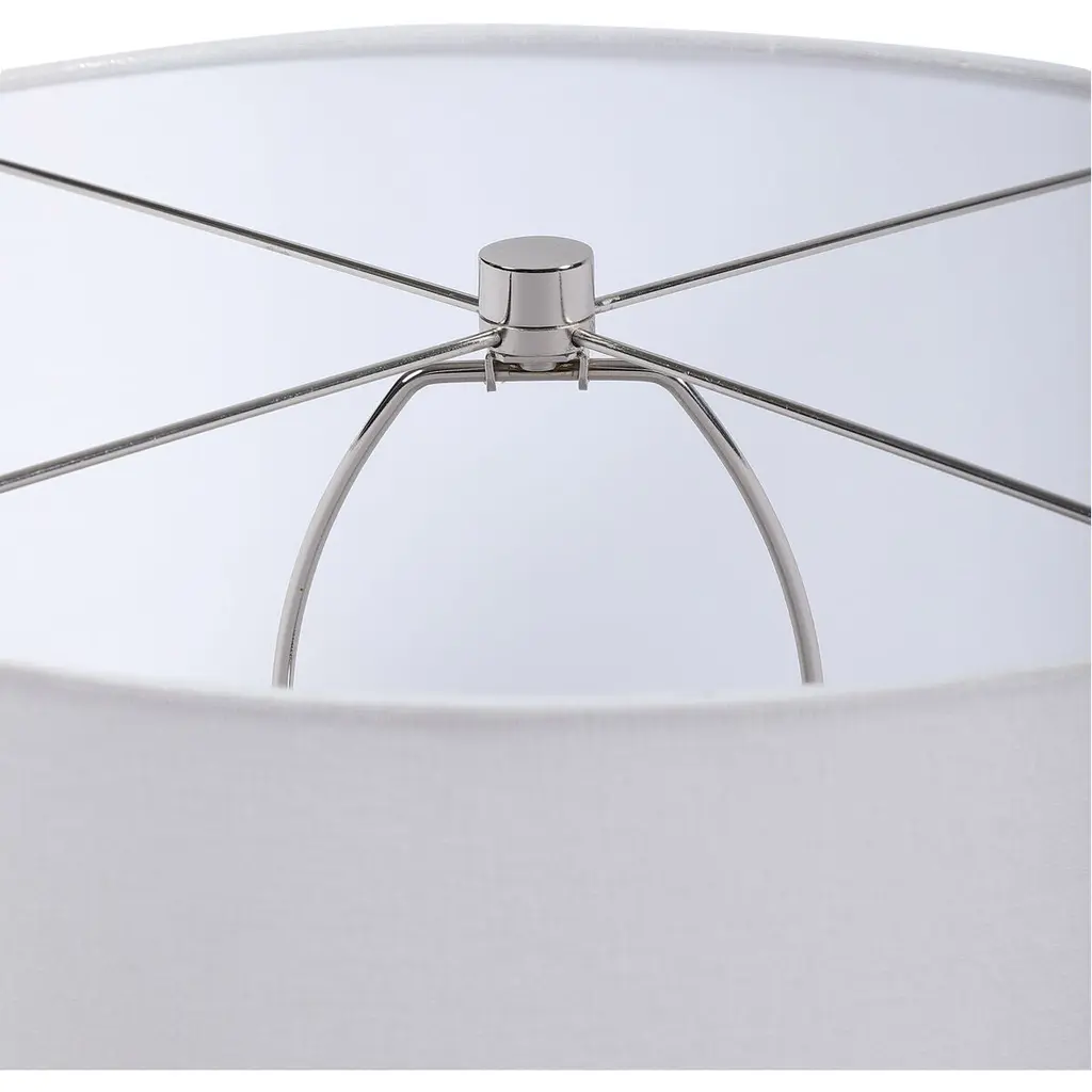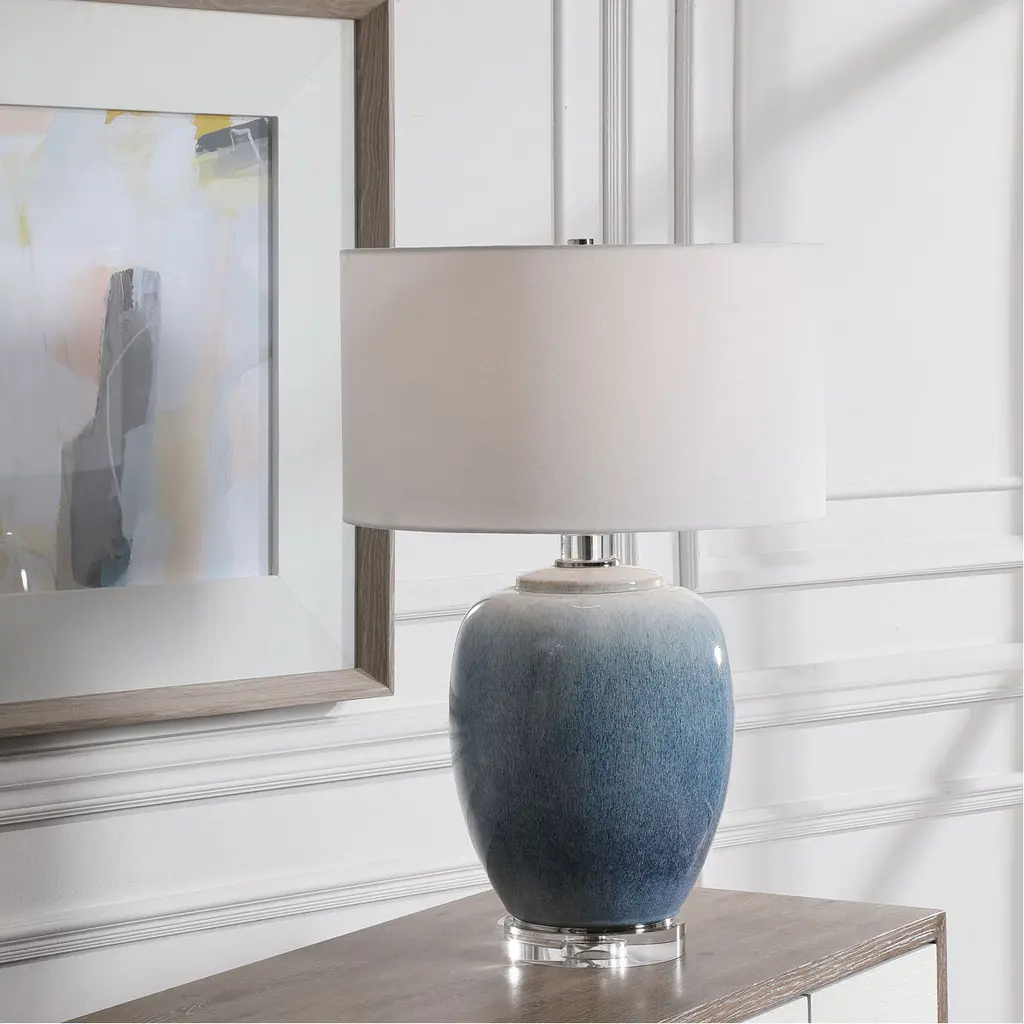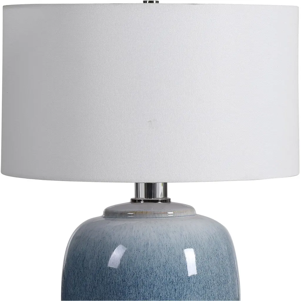 Ceramic Table Lamp Showcases Vibrant Shades Of Cobalt And Aqua That Transition Into A Subtle Ombre Toned Light Blue. Polished Nickel Details And Crystal Accents Create An Elegant And Sophisticated Look. A Crisp White Linen Drum Shade Accents The Piece.