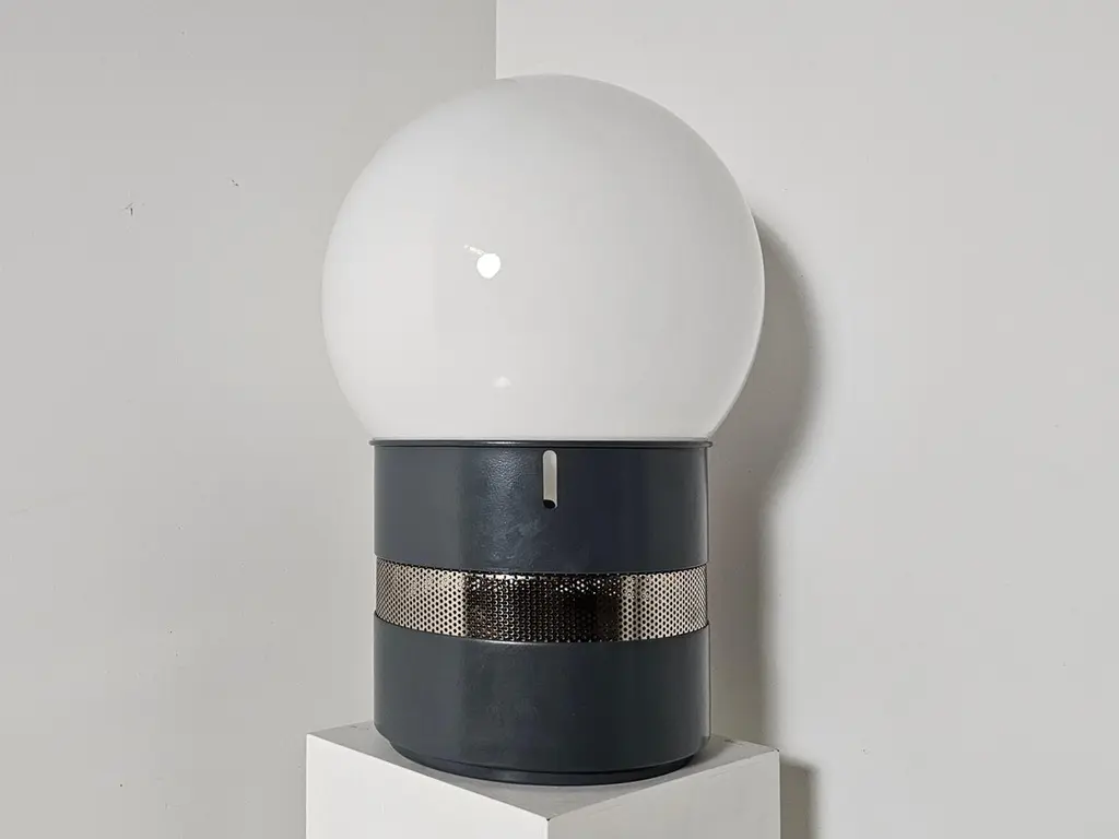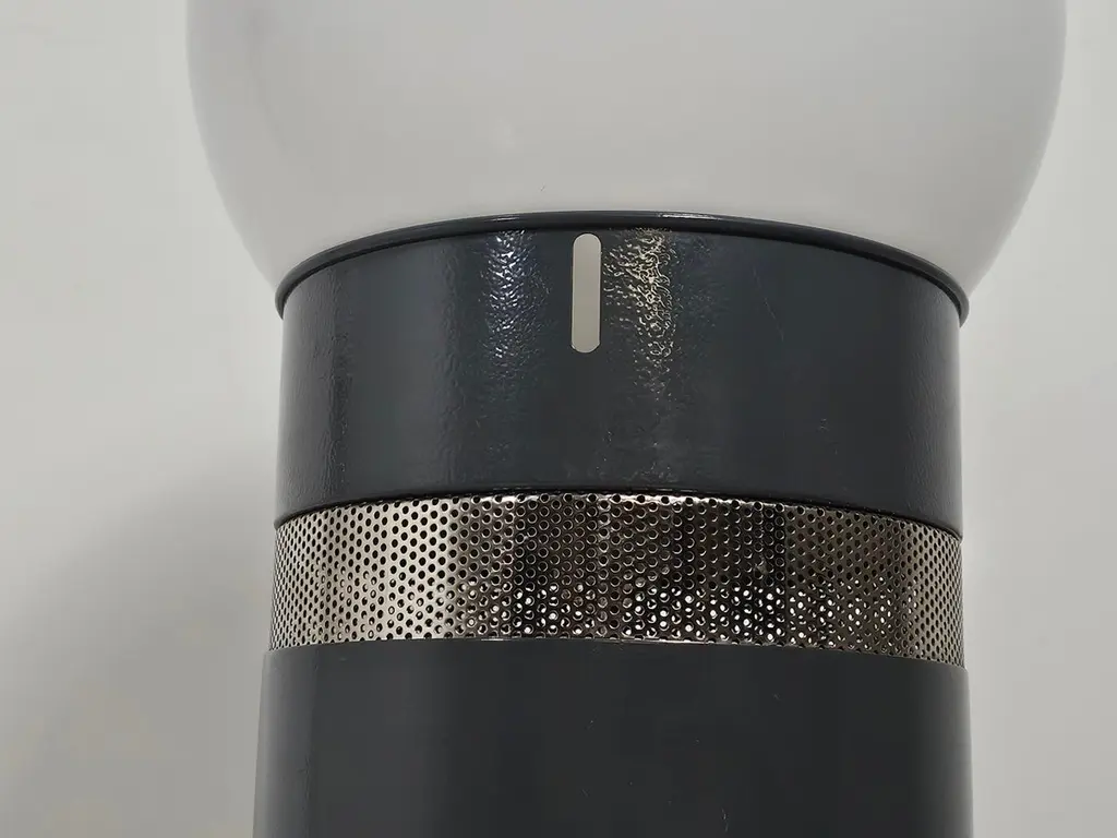Mezzo Oracolo table lamp by Gae Aulenti for Artemide. A both sculpture and light source. Originally designed in the 1960s, this striking piece reflects Aulenti’s visionary approach, where function and form meet in bold, architectural elegance.This particular example features the rare blue-grey finish, a subtle yet sophisticated tone that elevates its presence in any interior. The lamp’s distinctive cylindrical base and oversized glowing diffuser create an atmospheric light that is at once modern and timeless.We have 2 lamps available.