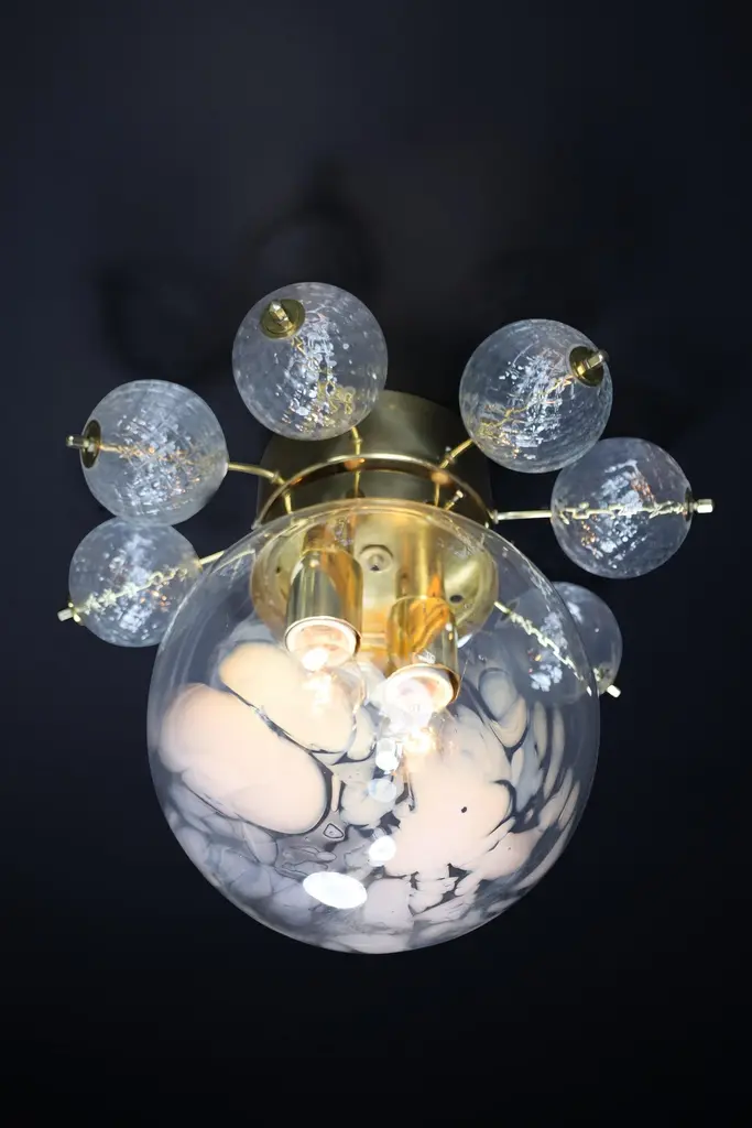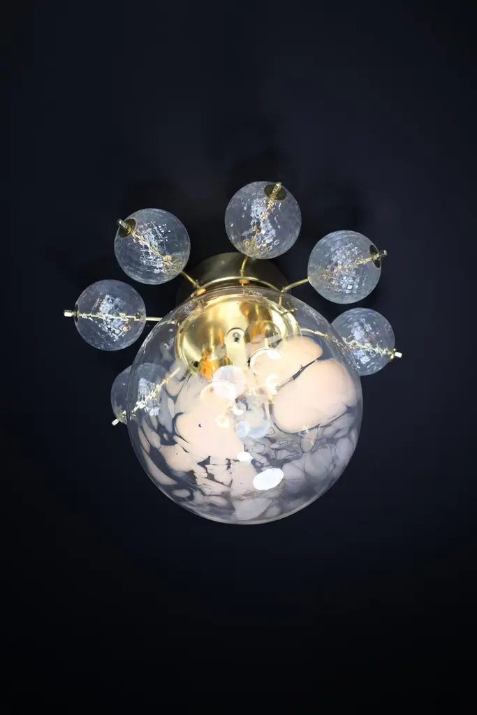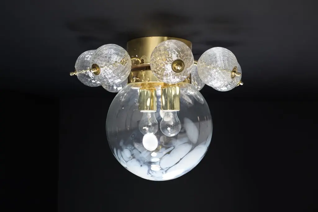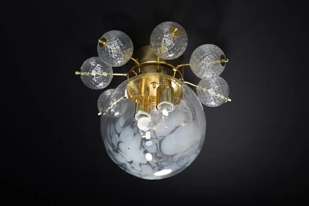 Bohemian Glass Flush Mount Ceiling Lamp, Prague, 1960s — 4 Available, Priced Per LightThis striking Bohemian flush mount ceiling lamp hails from 1960s Prague and exemplifies the elegance of Czech mid-century lighting design. Each fixture blends sculptural form with masterful craftsmanship, making it a standout piece for any interior.The lamp features a large, hand-blown central globe with swirling white patterns, evoking a dreamlike, ethereal effect. Surrounding it are eight smaller, textured cut-glass spheres arranged in a precise radial design, all supported by a polished brass frame. The combination of materials creates a beautiful interplay of light, texture, and reflection.Each pendant has been professionally restored and thoroughly cleaned. The lights are newly rewired to meet US, UK, EU, and Asia electrical safety standards and are fitted with E27 sockets, making them compatible with both LED and incandescent bulbs. This ensures they are not only visually stunning but also safe and ready for immediate use worldwide.Ideal as a single statement piece or in a coordinated series, these flush mounts work beautifully in entryways, dining areas, hallways, or bedrooms. Their low profile also makes them suitable for rooms with lower ceilings.Details:Origin: Prague, CzechoslovakiaPeriod: 1960sStyle: Mid-Century Modern / BohemianMaterials: Hand-blown and cut glass, polished brassDiameter: 47 cmDepth: 36 cmCondition: Excellent vintage condition; fully restoredElectrical: Rewired to meet international standards (US, UK, EU, Asia); E27 socketsQuantity Available: 4Price: Listed price is per lightThese rare vintage pieces celebrate the golden age of Czech glass artistry and offer both form and function in a timeless design.