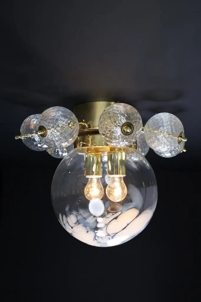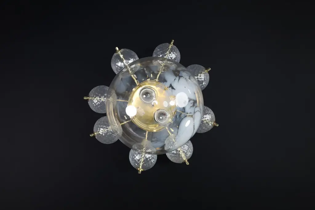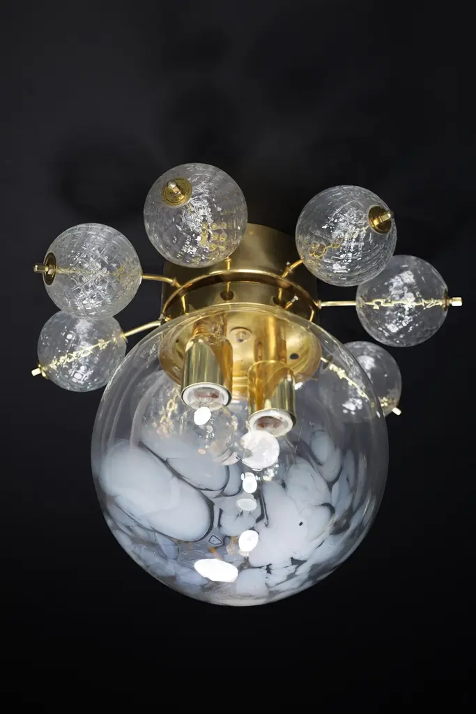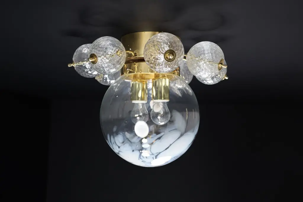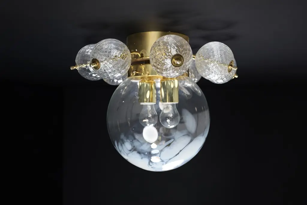 Bohemian Glass Flush Mount Ceiling Lamp, Prague, 1960s — 4 Available, Priced Per LightThis striking Bohemian flush mount ceiling lamp hails from 1960s Prague and exemplifies the elegance of Czech mid-century lighting design. Each fixture blends sculptural form with masterful craftsmanship, making it a standout piece for any interior.The lamp features a large, hand-blown central globe with swirling white patterns, evoking a dreamlike, ethereal effect. Surrounding it are eight smaller, textured cut-glass spheres arranged in a precise radial design, all supported by a polished brass frame. The combination of materials creates a beautiful interplay of light, texture, and reflection.Each pendant has been professionally restored and thoroughly cleaned. The lights are newly rewired to meet US, UK, EU, and Asia electrical safety standards and are fitted with E27 sockets, making them compatible with both LED and incandescent bulbs. This ensures they are not only visually stunning but also safe and ready for immediate use worldwide.Ideal as a single statement piece or in a coordinated series, these flush mounts work beautifully in entryways, dining areas, hallways, or bedrooms. Their low profile also makes them suitable for rooms with lower ceilings.Details:Origin: Prague, CzechoslovakiaPeriod: 1960sStyle: Mid-Century Modern / BohemianMaterials: Hand-blown and cut glass, polished brassDiameter: 47 cmDepth: 36 cmCondition: Excellent vintage condition; fully restoredElectrical: Rewired to meet international standards (US, UK, EU, Asia); E27 socketsQuantity Available: 4Price: Listed price is per lightThese rare vintage pieces celebrate the golden age of Czech glass artistry and offer both form and function in a timeless design.