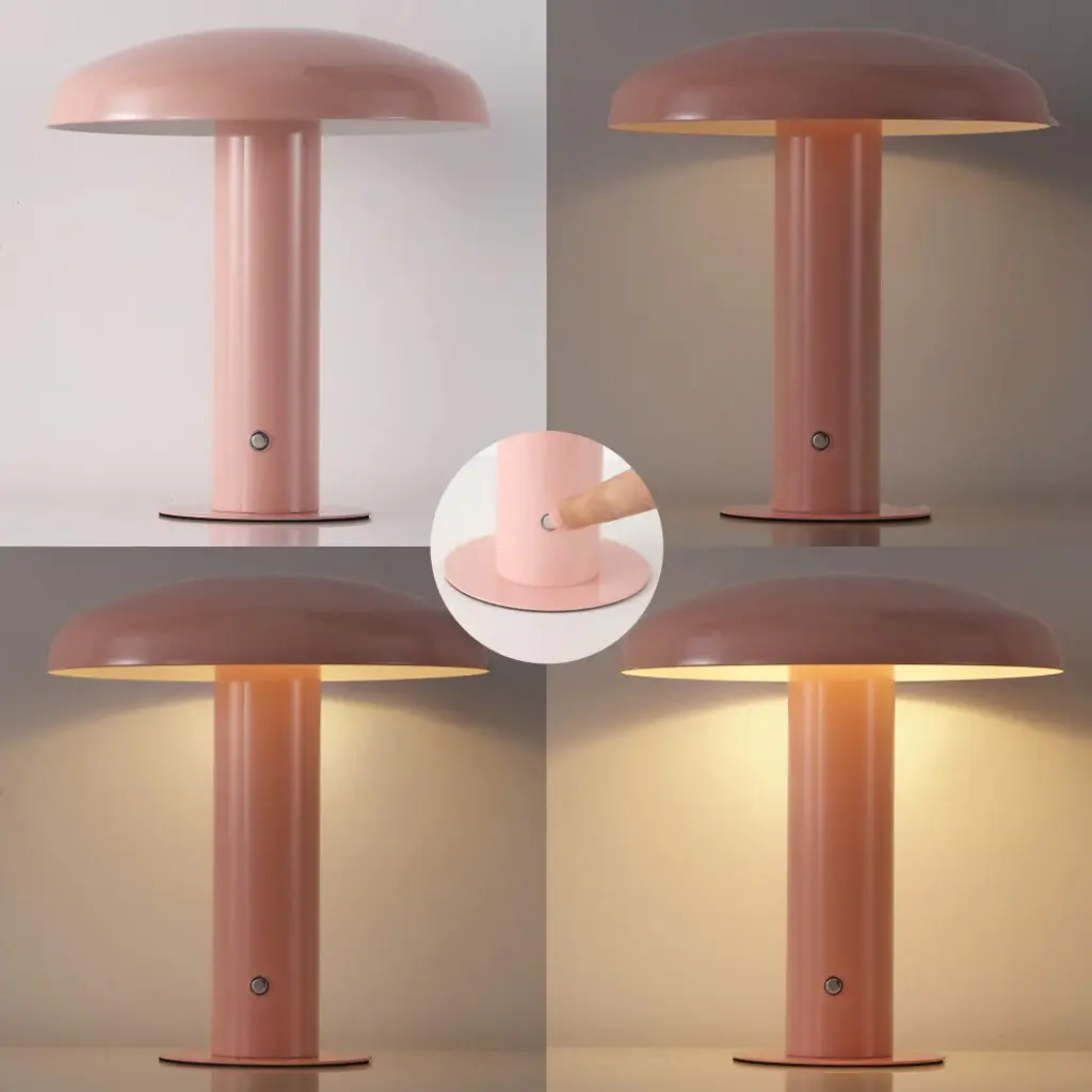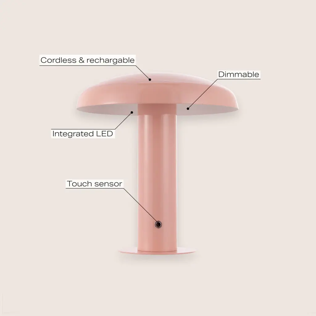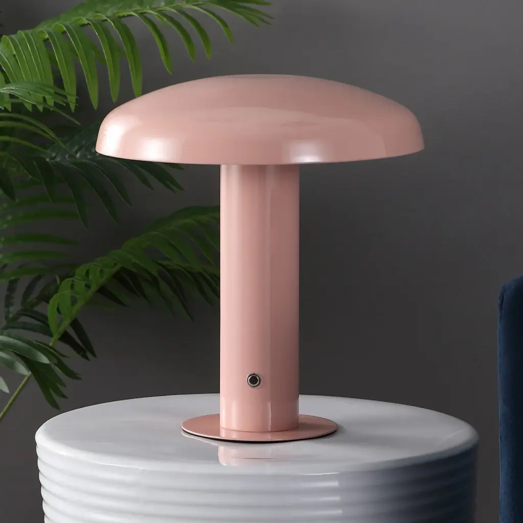Add mid-century modern flair to your bar, console, or vanity with our portable accent lamp. This cordless, rechargeable lamp provides dimmable mood lighting for your dining room, living room, bedroom, or entry. The durable metal design features integrated LED bulbs and a touch sensor control with three brightness settings.-The mushroom style shade and base are crafted from high-quality metal with a rich pink finish-Cordless, portable, dimmable lamp has a rechargeable battery for convenient accent lighting almost anywhere-Versatile 11" height is perfect for ambient lighting on a table, desk or console-Built-in LED lights, so no bulbs are required -Takes 0 bulbs and compatible with 2W-Color Temperature: 3000K-CRI: 80-Color: Pink-Body Material: Metal-Base Material: Metal----Includes: One (1) lamp-Assembly Required-Lamp: 11 inches high x 9.88 inches wide x 9.88 inches deep-Shade: 2.25 inches high x 9.88 inches wide x 9.88 inches deepYou see a lamp.We see a decorative work of art.A perfectly curved shade casts a dramatic shadow on a floor. Compatible with LED lightbulbs: as easy on the environment as they are on the eyes. The JONATHAN Y Lighting collection considers every detail from impeccably sourced materials to designer styling. And our prices are so attractive, weeve transformed a functional necessity into a fashion accessory.JONATHAN Y Lighting - a fashion revolution in home decor.