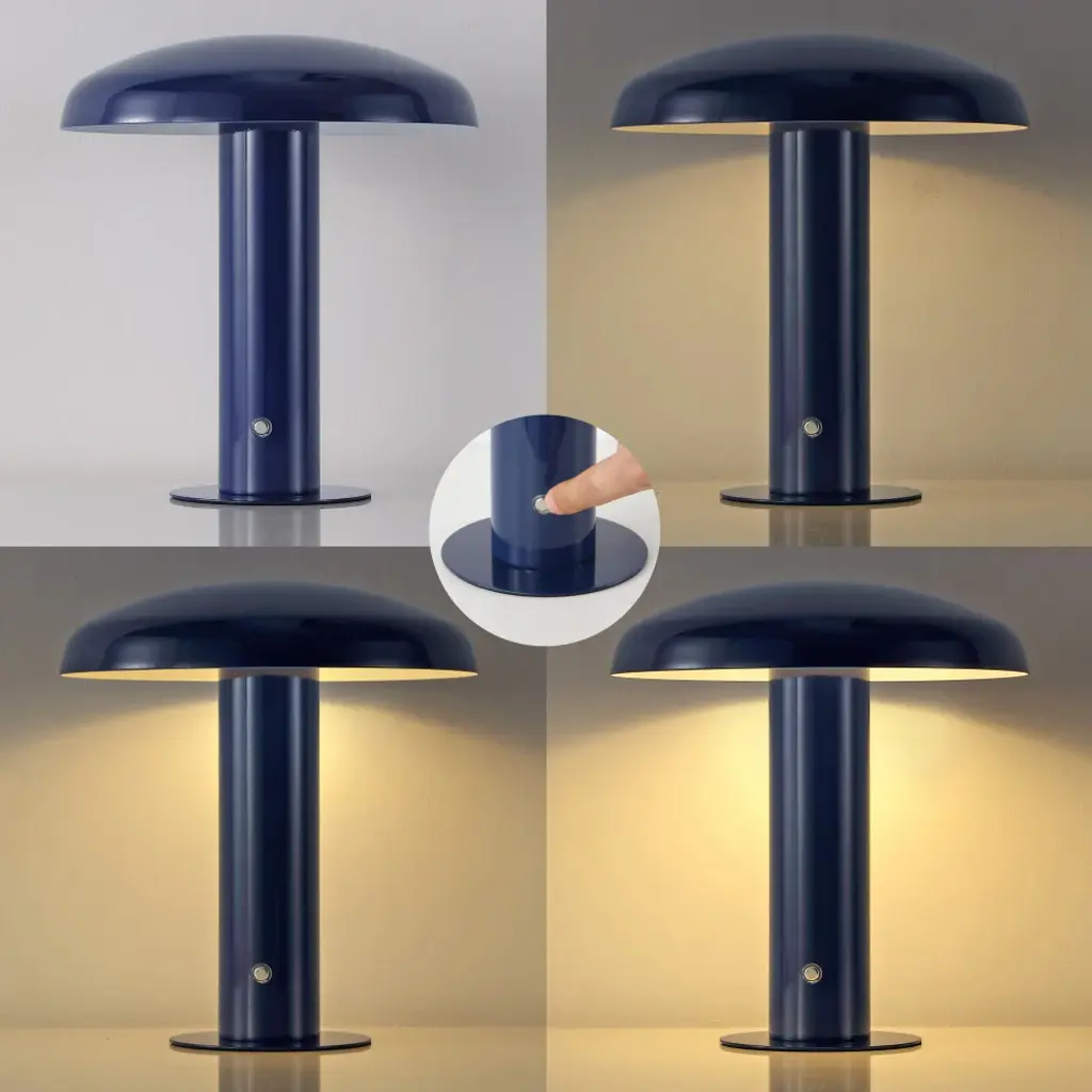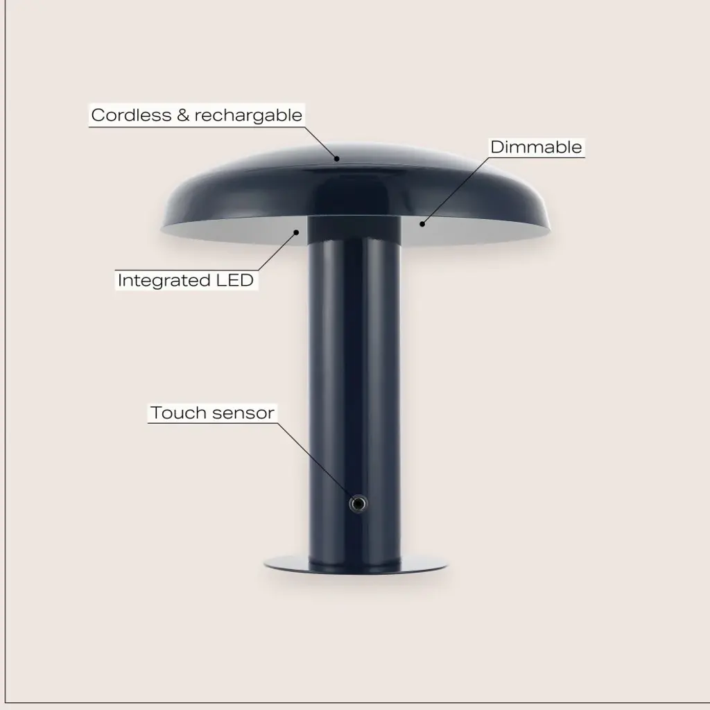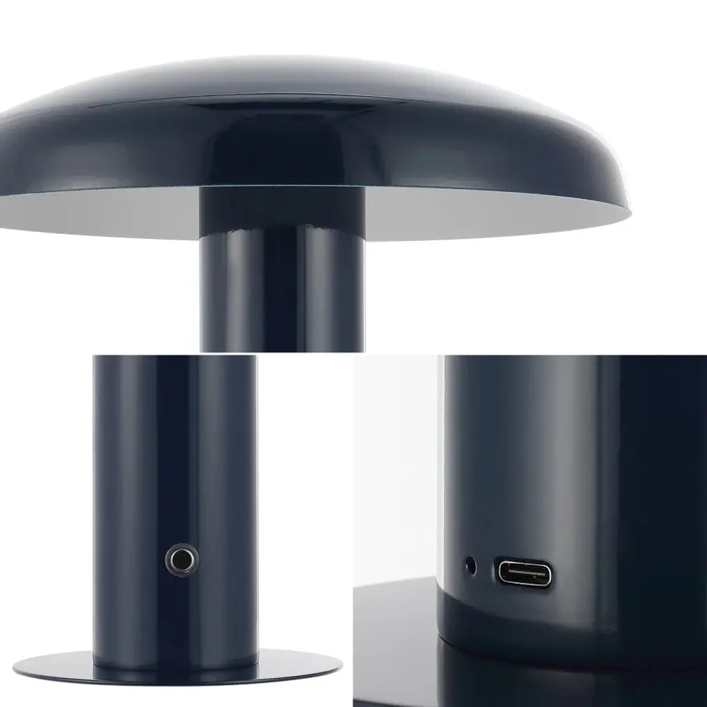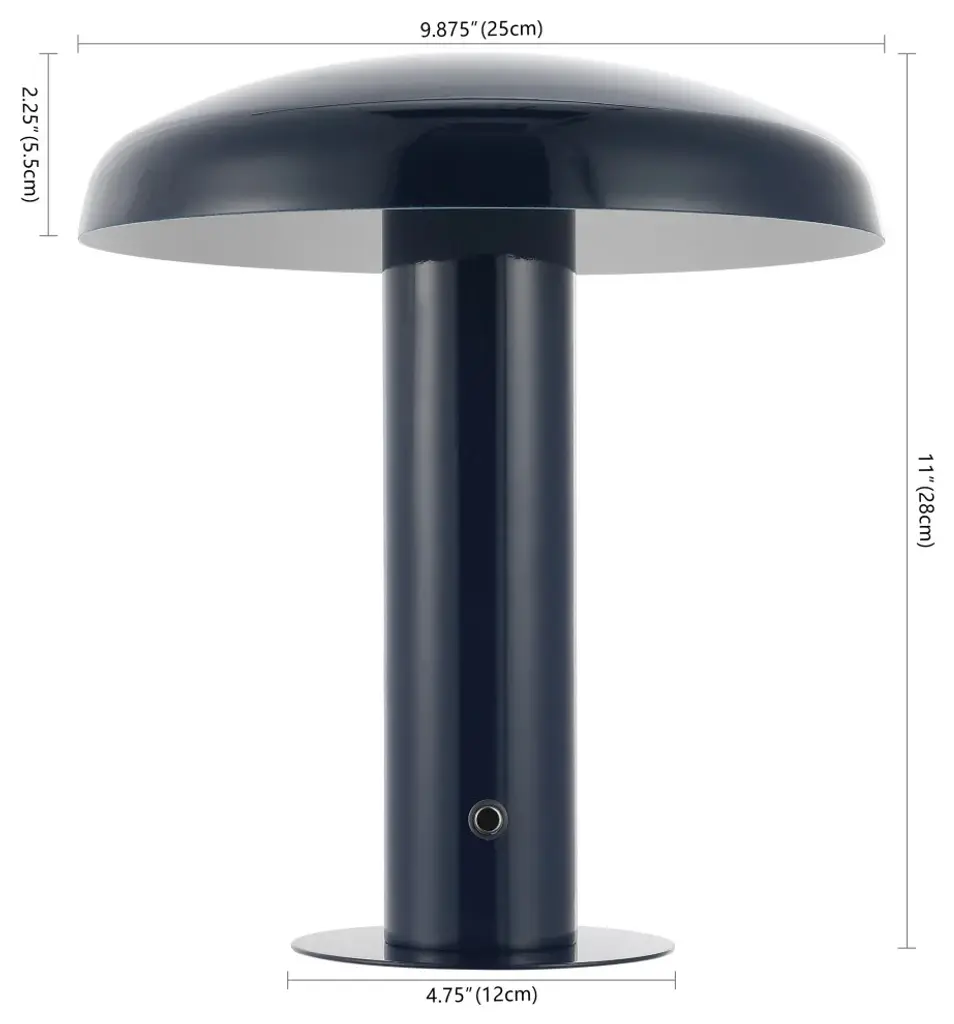 Add mid-century modern flair to your bar, console, or vanity with our portable accent lamp. This cordless, rechargeable lamp provides dimmable mood lighting for your dining room, living room, bedroom, or entry. The durable metal design features integrated LED bulbs and a touch sensor control with three brightness settings.-The mushroom style shade and base are crafted from high-quality metal with a rich navy finish-Cordless, portable, dimmable lamp has a rechargeable battery for convenient accent lighting almost anywhere-Versatile 11" height is perfect for ambient lighting on a table, desk or console-Built-in LED lights, so no bulbs are required -Takes 0 bulbs and compatible with 2W-Color Temperature: 3000K-CRI: 80-Color: Navy-Body Material: Metal-Base Material: Metal----Includes: One (1) lamp-Assembly Required-Lamp: 11 inches high x 9.88 inches wide x 9.88 inches deep-Shade: 2.25 inches high x 9.88 inches wide x 9.88 inches deepYou see a lamp.We see a decorative work of art.A perfectly curved shade casts a dramatic shadow on a floor. Compatible with LED lightbulbs: as easy on the environment as they are on the eyes. The JONATHAN Y Lighting collection considers every detail from impeccably sourced materials to designer styling. And our prices are so attractive, weeve transformed a functional necessity into a fashion accessory.JONATHAN Y Lighting - a fashion revolution in home decor.