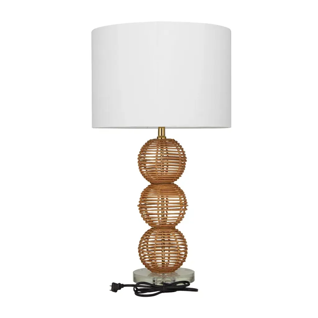 This eye catching lamp makes a charming and chic addition to your surface space and beautifully illuminate its surrounding area. Bring a finishing touch to your home with an inviting appeal with this accent table lamp. The round structure of this palm tree wooden lamp will surely add a natural vibe to any room and can blend a bohemian flair with your existing home style. Comes with 1 socket for medium-sized E26 bulbs. Bulbs included. This item ships in 1 carton. Cord length measures approximately 60". Suitable for indoor use only. An accent piece featuring a white drum-shaped shade. Power cord on/off toggle switch. Bohemian Setting.