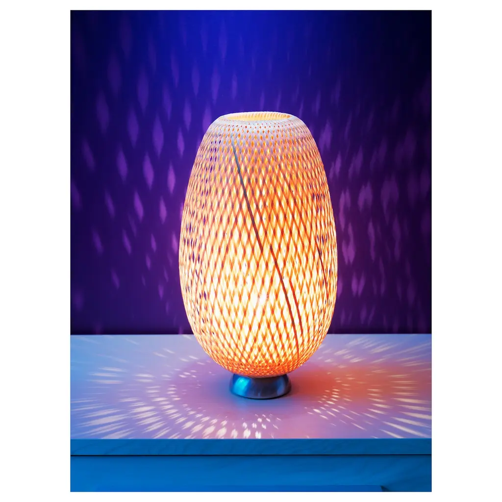 BÖJA Table lamp - bamboo/handmade. Each handmade shade is unique. Shade of braided bamboo creates decorative light patterns on the wall. Light bulb sold separately. IKEA recommends LED bulb E26 globe clear. May be completed with other lamps in the same series.