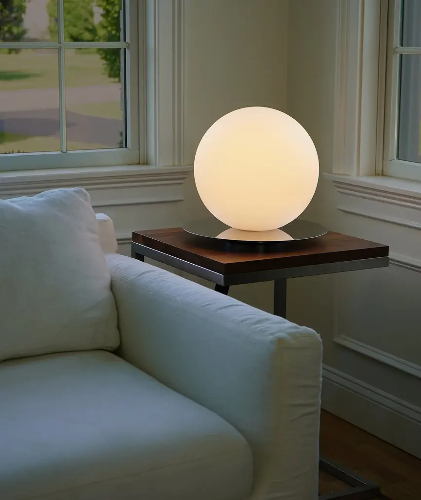 The Bola Sphere Table series fuses an elegant blown opal glass sphere with a mirrored disc reflector in polished stainless steel to give the illusion of a floating orb in space. Taking its cues from the Bola Family Collection, the new table version brings this magical combination to a table surface, allowing for full range dimming and is available in 3 distinct Globe sizes.