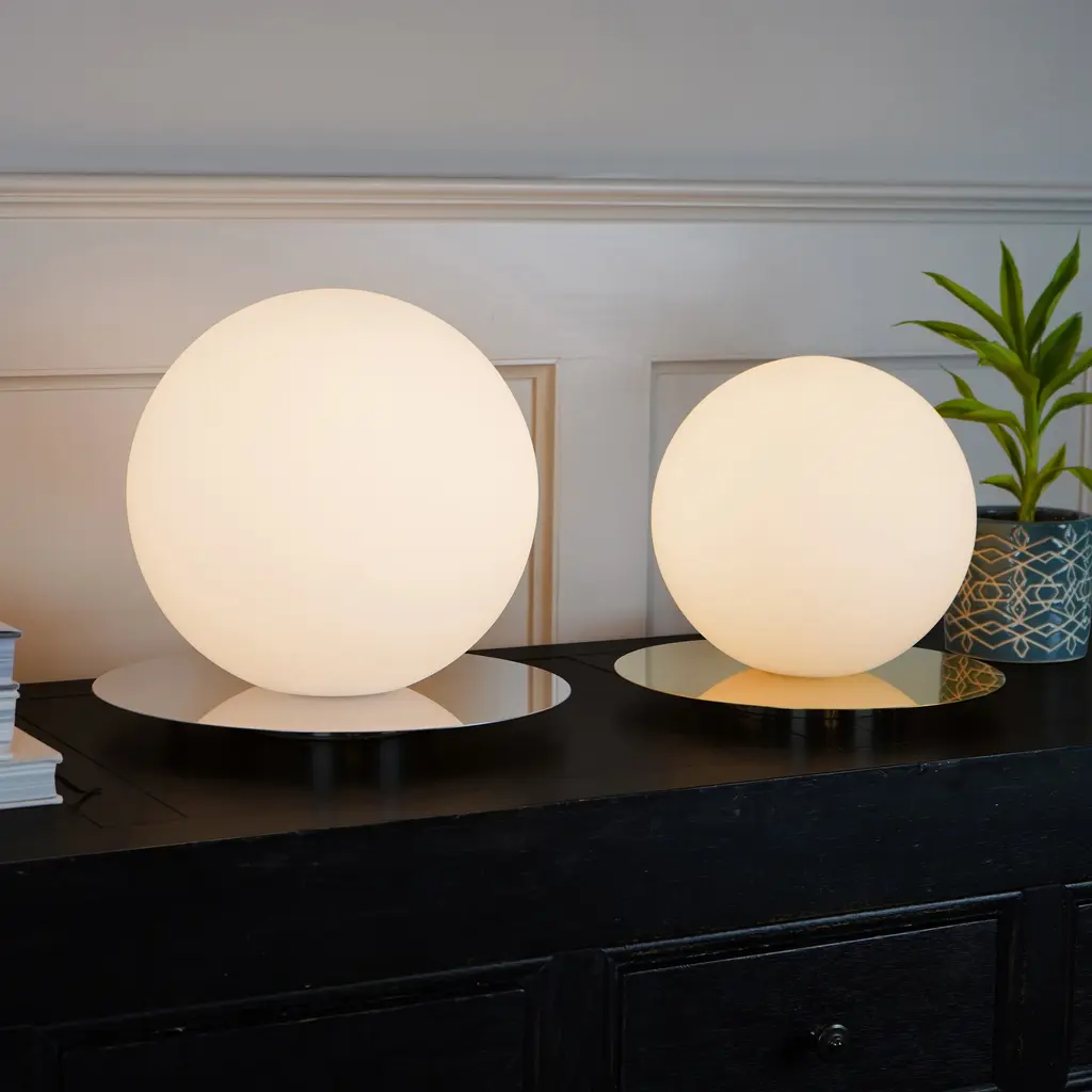 Evoking a floating orb in space, the Bola Sphere Table LED Table Lamp fuses elegant opal glass with a mirrored disc reflector in polished stainless steel. A captivating piece, perfect for understated contemporary spaces. Choose from a range of sizes and sophisticated hues.