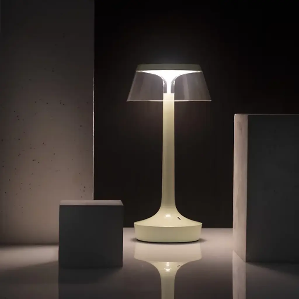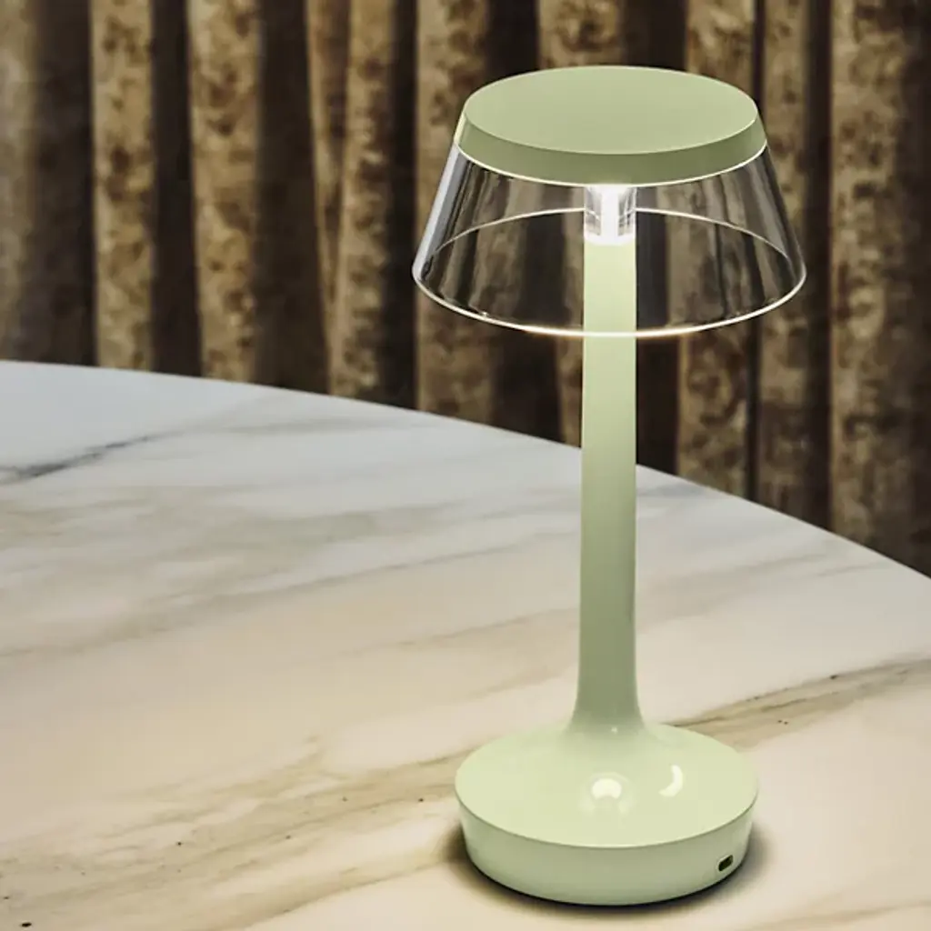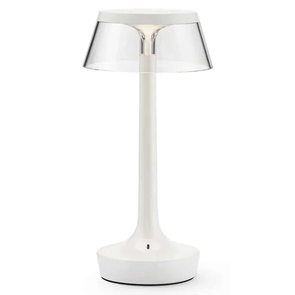 The Bon Jour Unplugged LED Table Lamp from FLOS provides portable illumination in a contemporary design. Designed by Philippe Stark, it has a straightforward silhouette with a transparent ABS shade. Through the shade, one can see the Edge Lighting source, which features a design reminiscent of a vortex in water, adding a touch of visual interest. An optical switch sensor on the base provides a four-step dimming function and color temperature control, allowing the light to adapt to new positions.