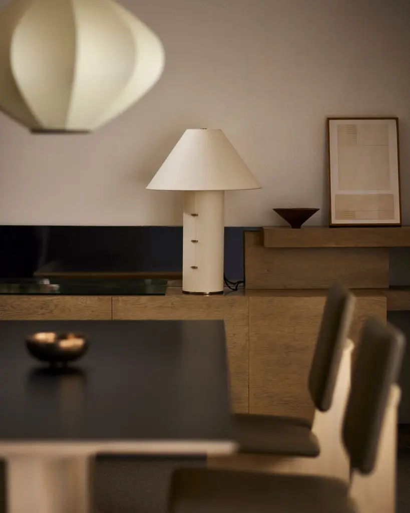 Characterized by its parchment-wrapped body, stitch detailing, and clasp-like Patina Brass accents, Bond is both relaxed and refined. Light filters through the tapered parchment shade, creating a warm, ambient glow that adds to the design's natural, organic feel. Bond is available in two sizes, delivering a clean, elevated aesthetic to a variety of spaces.