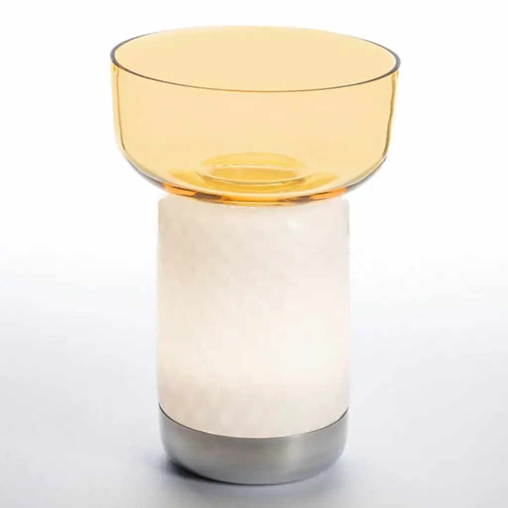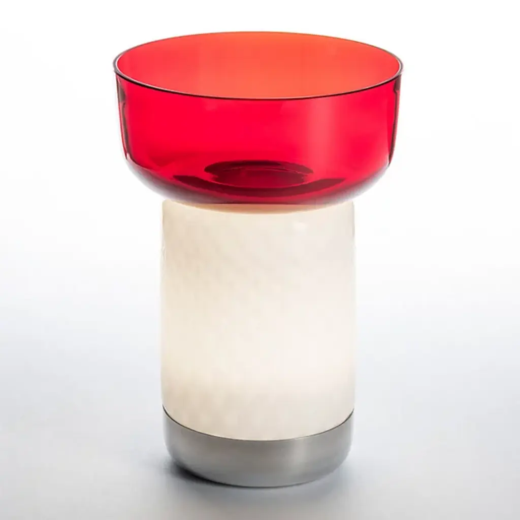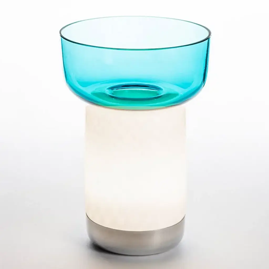 The Bonta Rechargeable LED Table Lamp from Artemide gives a lasting and portable accent ideal for dining or intimate gatherings. A simple, retro-styled design with enough contemporary flair to keep it endlessly relevant, it was designed by Davide Oldani and Attila Veress to provide a connection for those gatherings, able to easily interact with its surroundings while illuminating them. A cylinder diffuser in Venitian milk glass ascends from a short aluminum base, with the option of being capped by a hand-worked glass bowl, putting artistry on display and able to hold appetizers or snacks for sharing, cutting bright glare and transforming it into an even, layered glow.