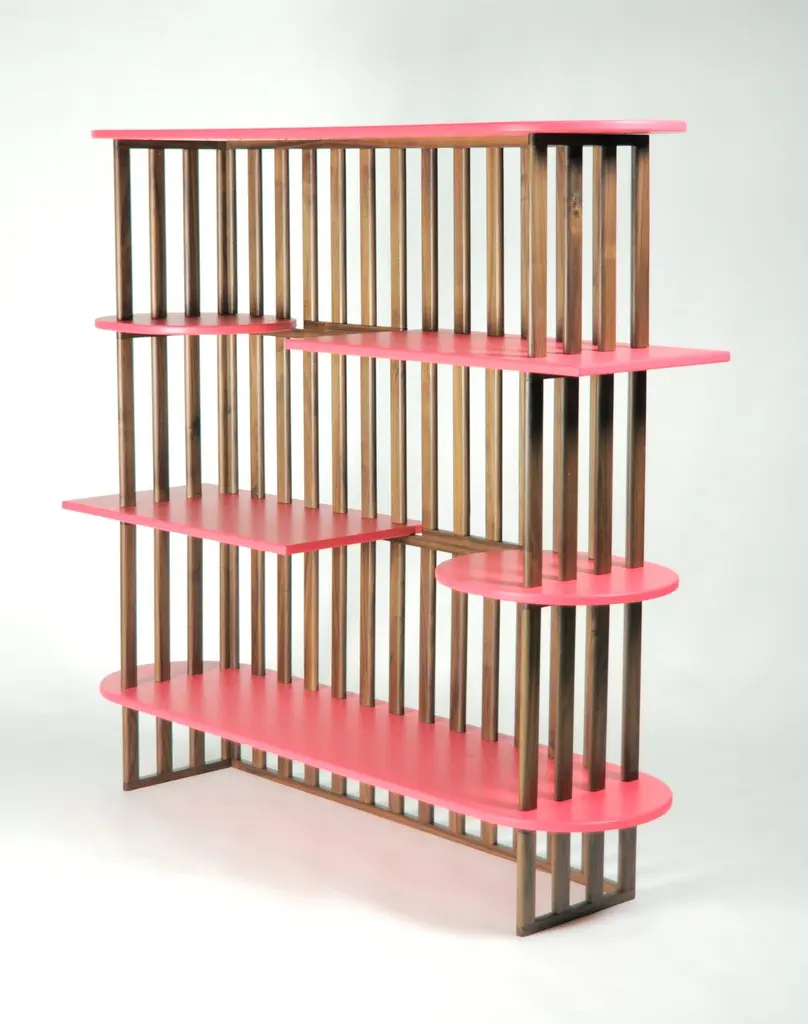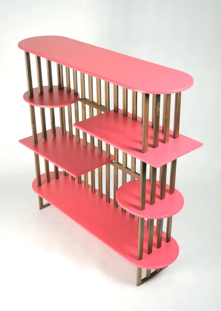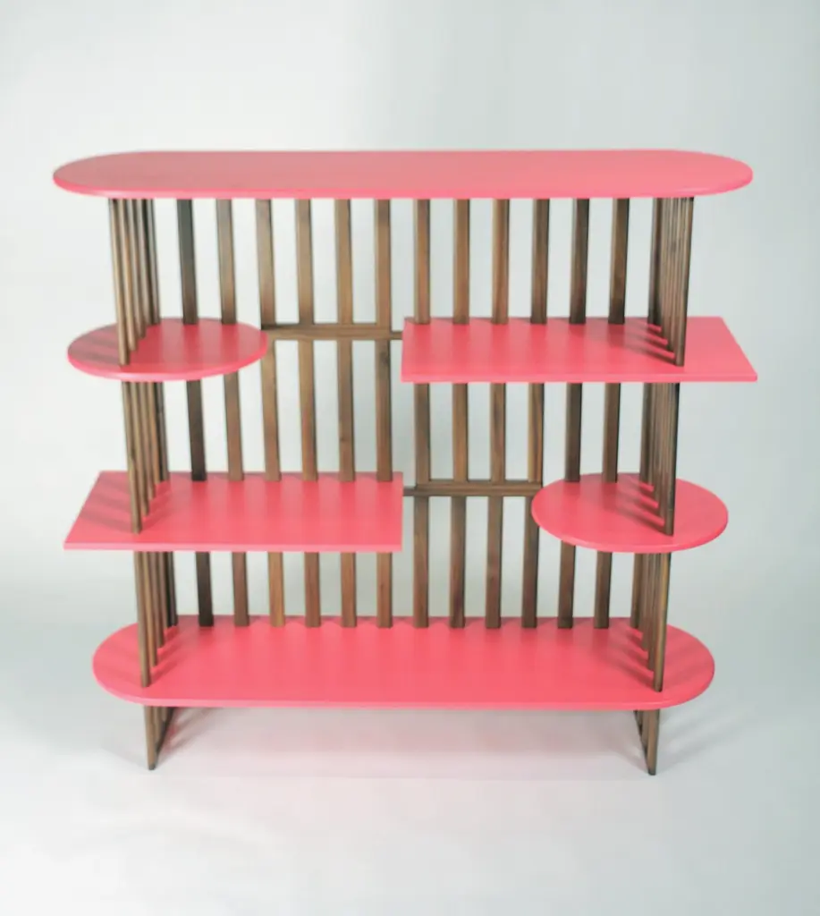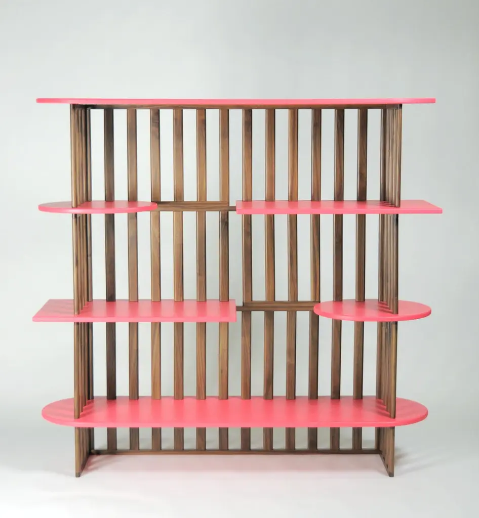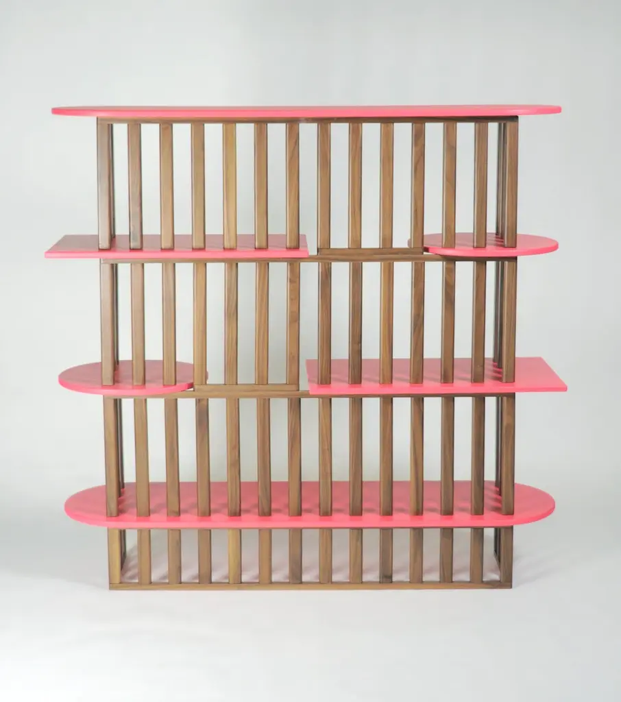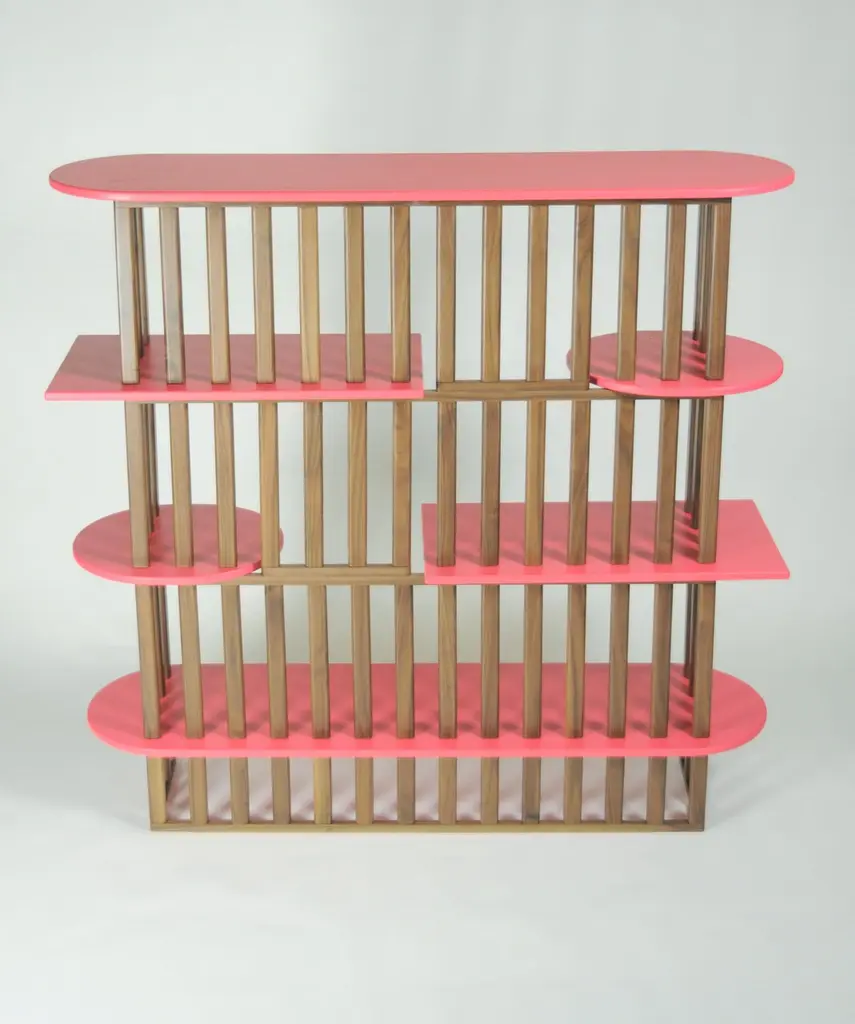 Lido collection bookcase. 4 oval and rectangular shelves made of scratch-resistant lacquered MDF 19mm (0.07inch) thick, solid walnut wood legs. Measurements H143xW150xD40cm.Available in a variety of combinations and sizes. Available lacquered in different colors and model with oak, lacquered ash and lacquered wood legs.Lido is a collection of furniture accessories inspired by the Lido of Venice, an island between the sea and the lagoon, a symbolic location of aristocratic vacationing in the early 20th century and the setting for famous films.The Art Nouveau style of eclectic buildings, balustrades, lampposts, and seaside furnishings is translated into formal and chromatic archetypes that give rise to a range of furnishings that are as evocative as they are functional.A system of vertical slats in various heights serves as support for a variety of projecting shelves that differ in shape and color, designed to give value to the wood and its fastening systems. The palette draws on the decorative seclusion of beach chairs, beach cabins, and early 20th century advertising graphics.Each of the components can be assembled as desired to define small domestic architectures that fulfill the function of a table, coffee table, console table and bookcase, united by a timeless look that can be adapted to a wide variety of environments.Designer_DebonaDemeo