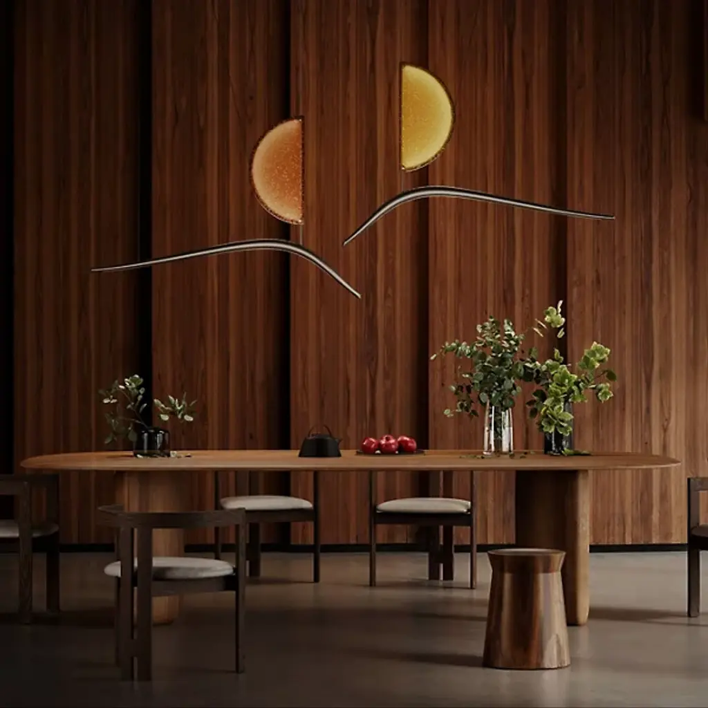 The Borealis LED Linear Suspension from Italamp transforms its surroundings with an airy, expressive quality. A rectangular canopy and small anchor use slim cables to suspend a curving mix of fluid steel curves, accented by a hemispherical frame for LED lamping behind twin panes of art glass. The fluid steel form, in a shiny midnight gray, contrasts easily with the textured glass, which obscures the bright glare from the lamp, casting a warm wash of light to the sides.