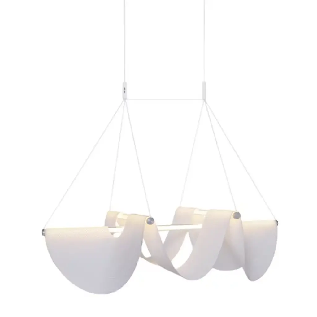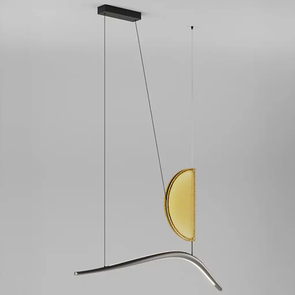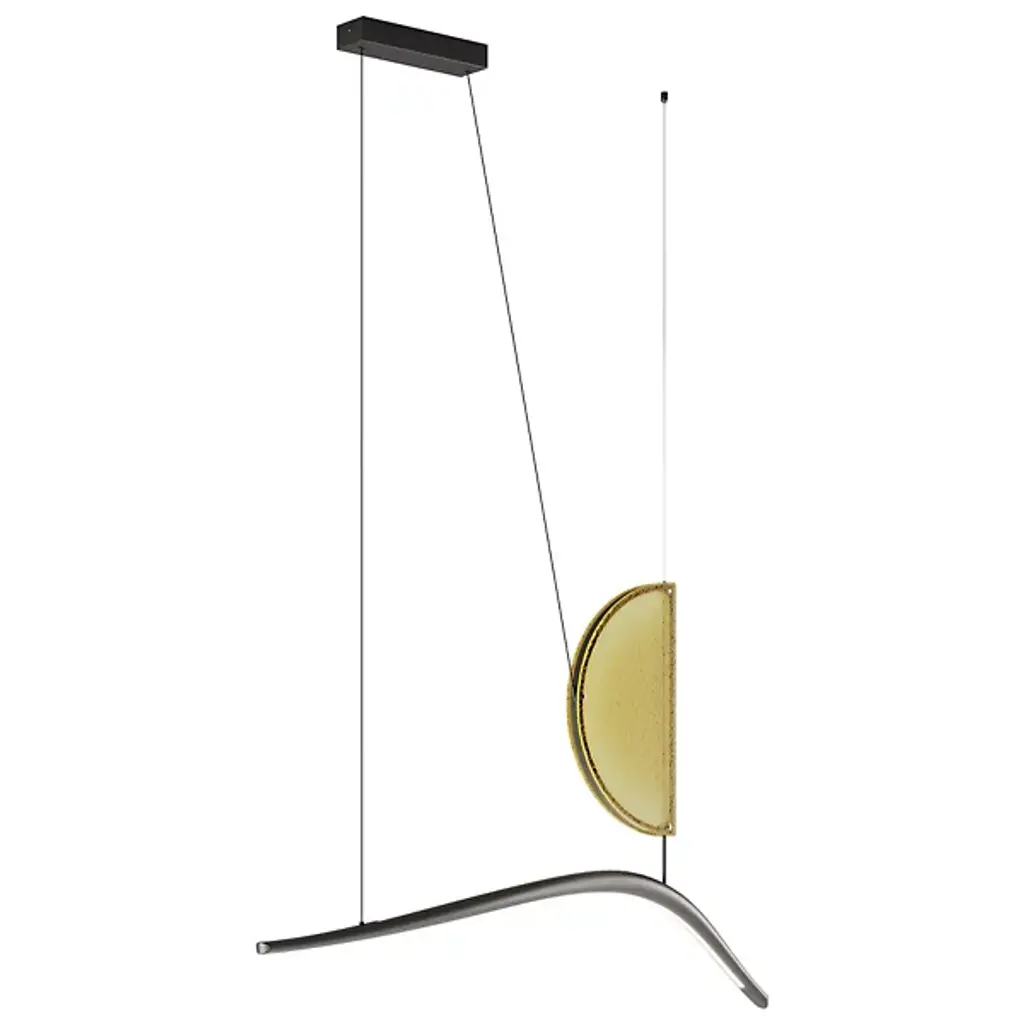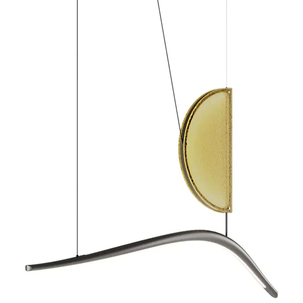 The Borealis LED Linear Suspension from Italamp transforms its surroundings with an airy, expressive quality. A rectangular canopy and small anchor use slim cables to suspend a curving mix of fluid steel curves, accented by a hemispherical frame for LED lamping behind twin panes of art glass. The fluid steel form, in a shiny midnight gray, contrasts easily with the textured glass, which obscures the bright glare from the lamp, casting a warm wash of light to the sides.