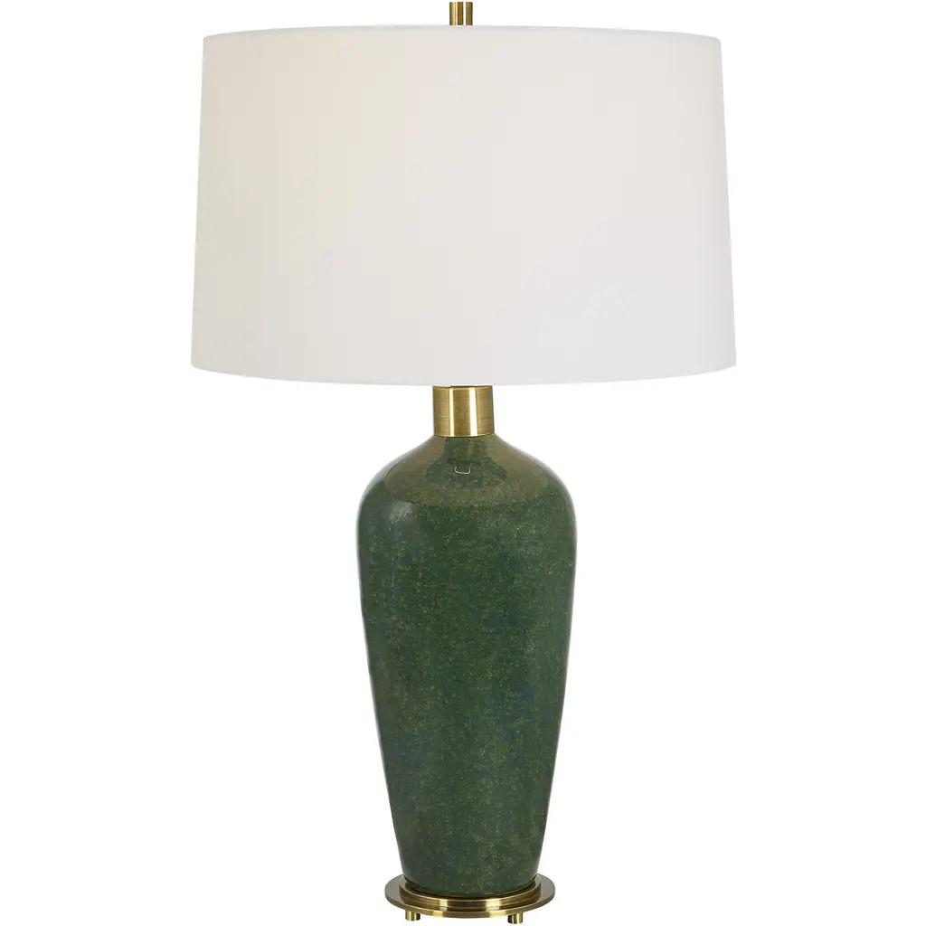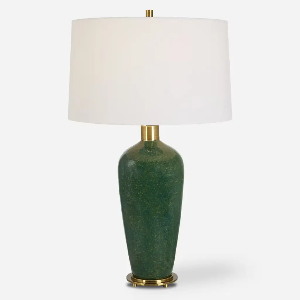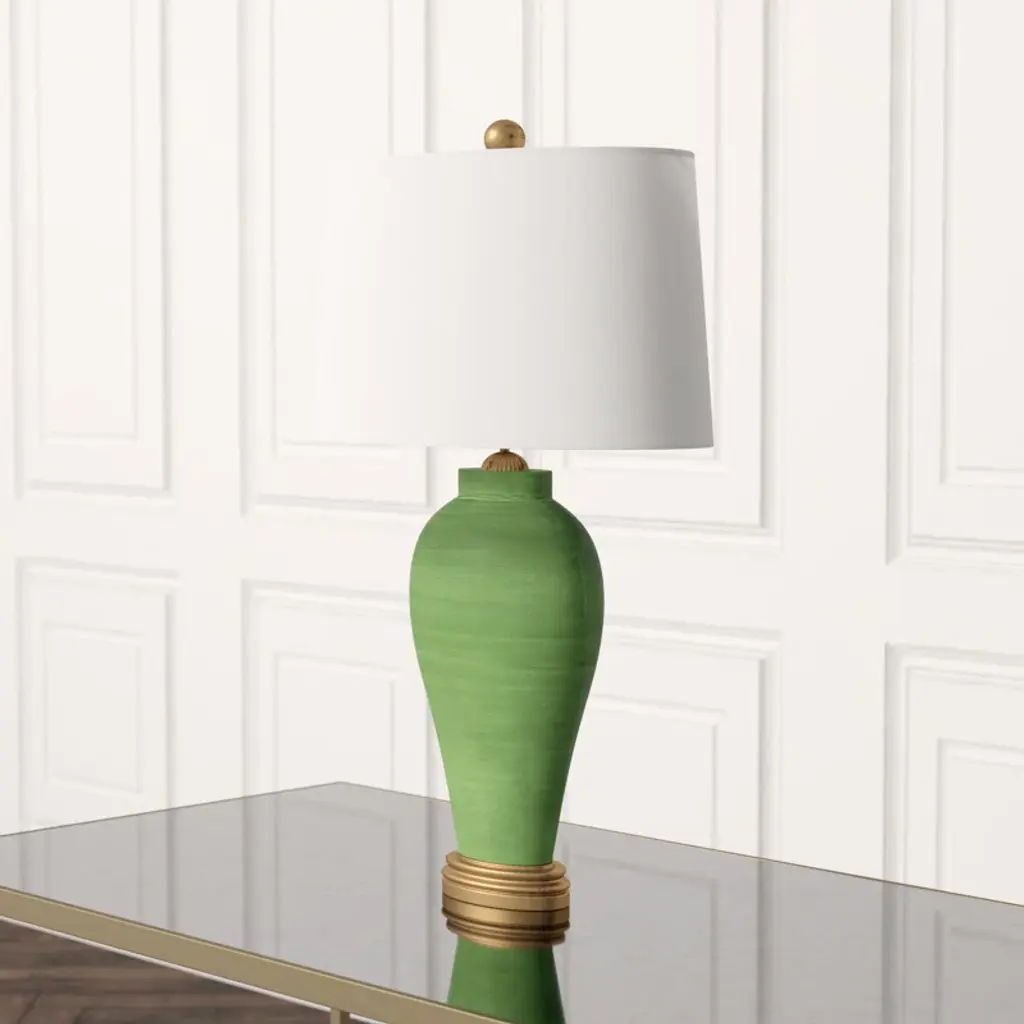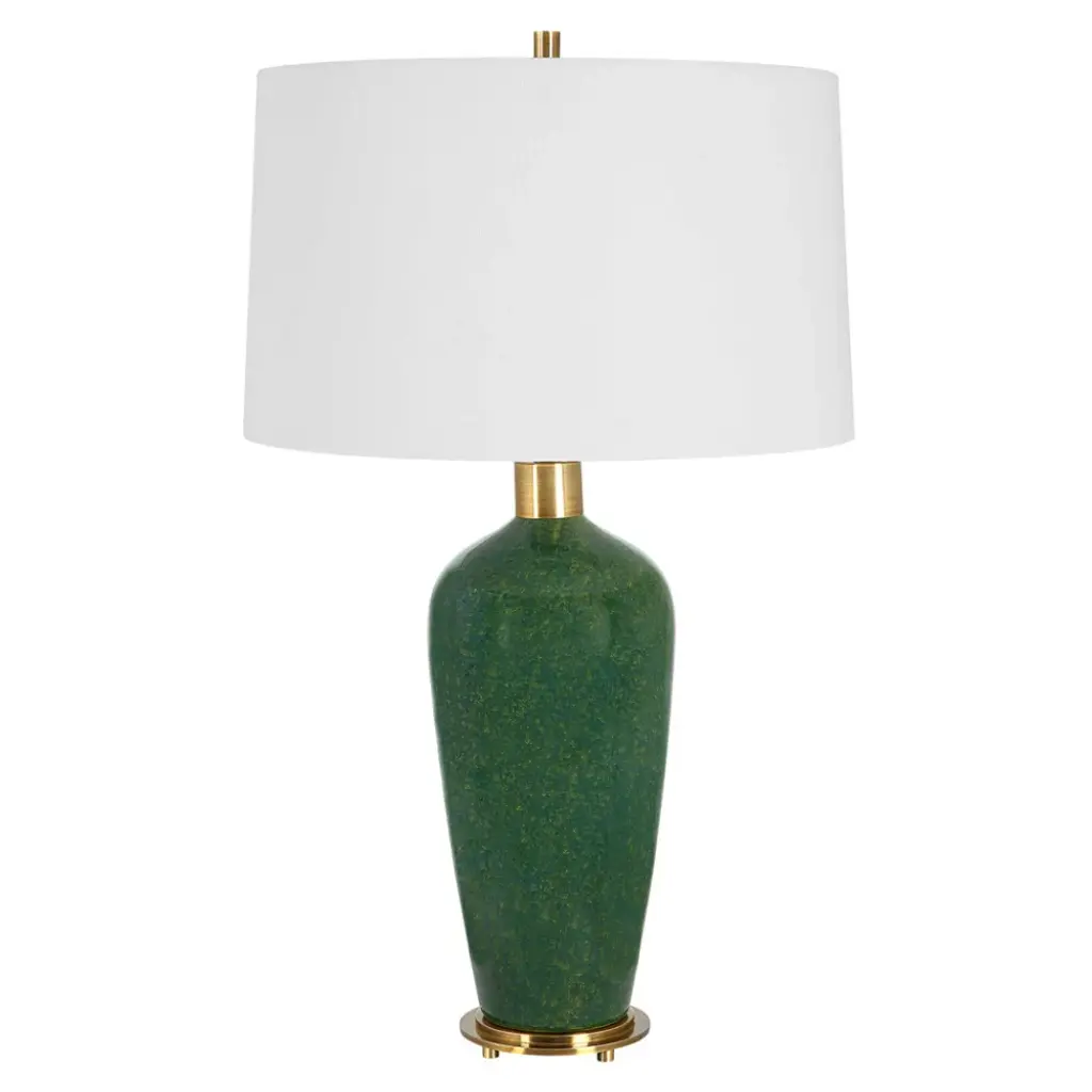Saturated in fresh color and given a sleek silhouette, this modern table lamp dabbles in mid-century modern style. Embrace a lush gradient finish over ceramic in a shapely body, as a brass metal base offers lavish embellishments. Topped with a linen empire shade, this exquisite lamp is perfect for emphasizing bold color in a bedroom or main living area.