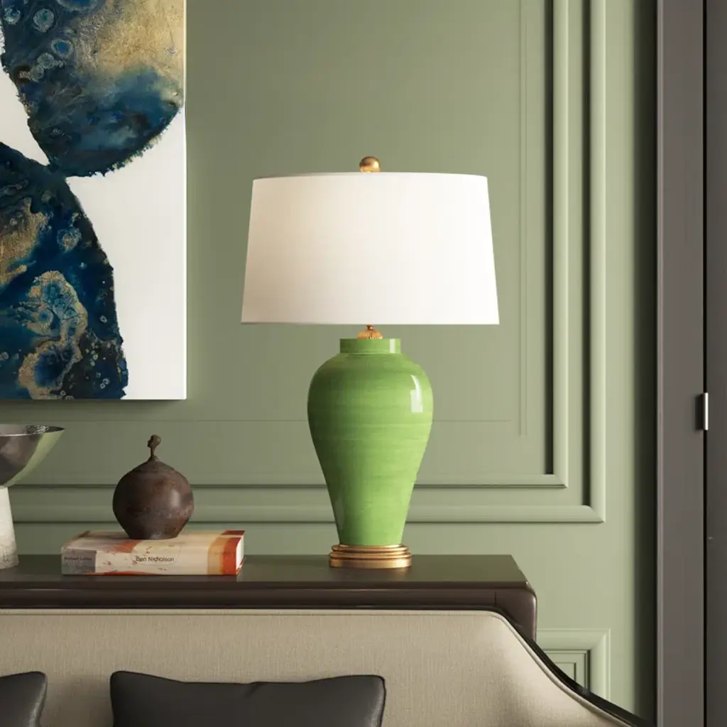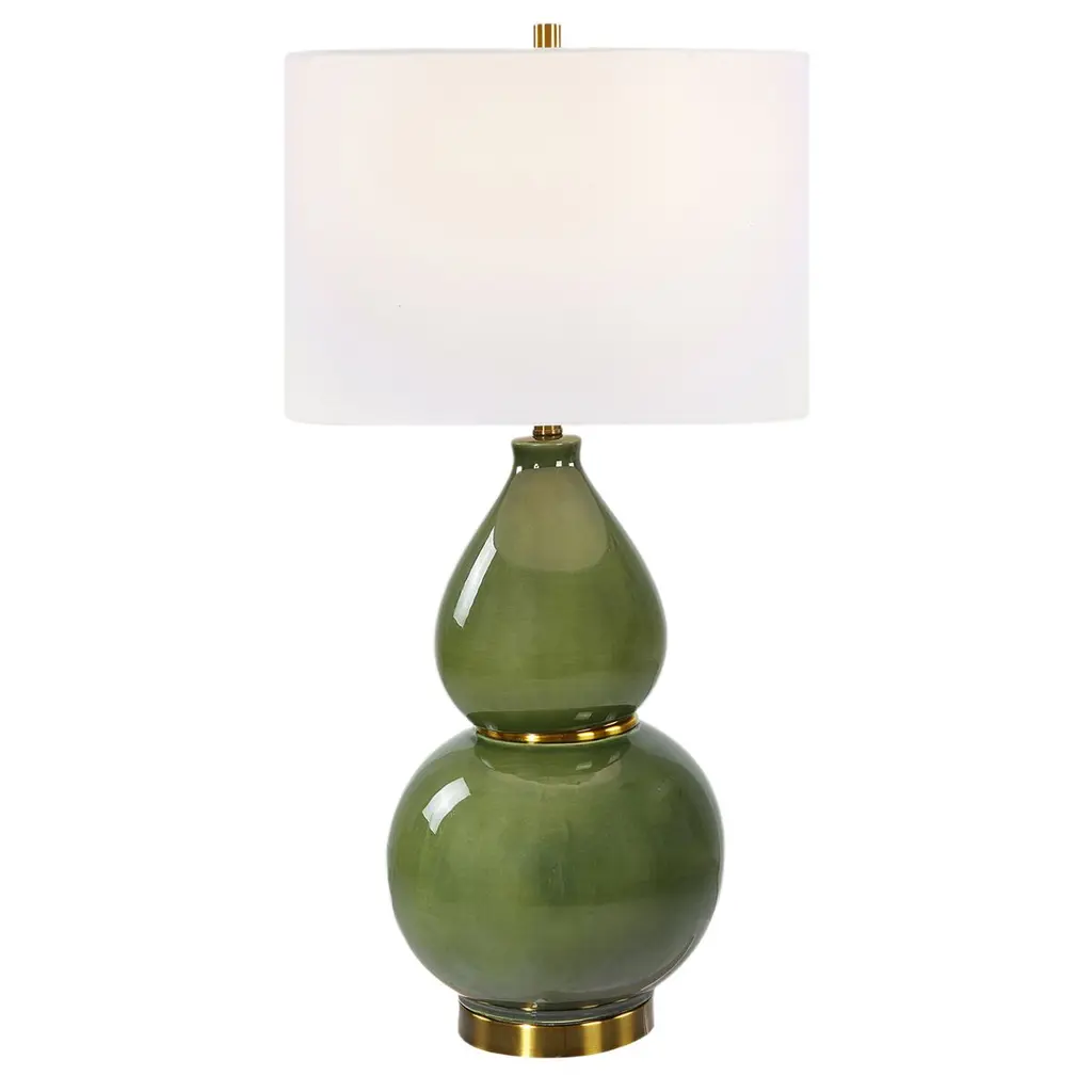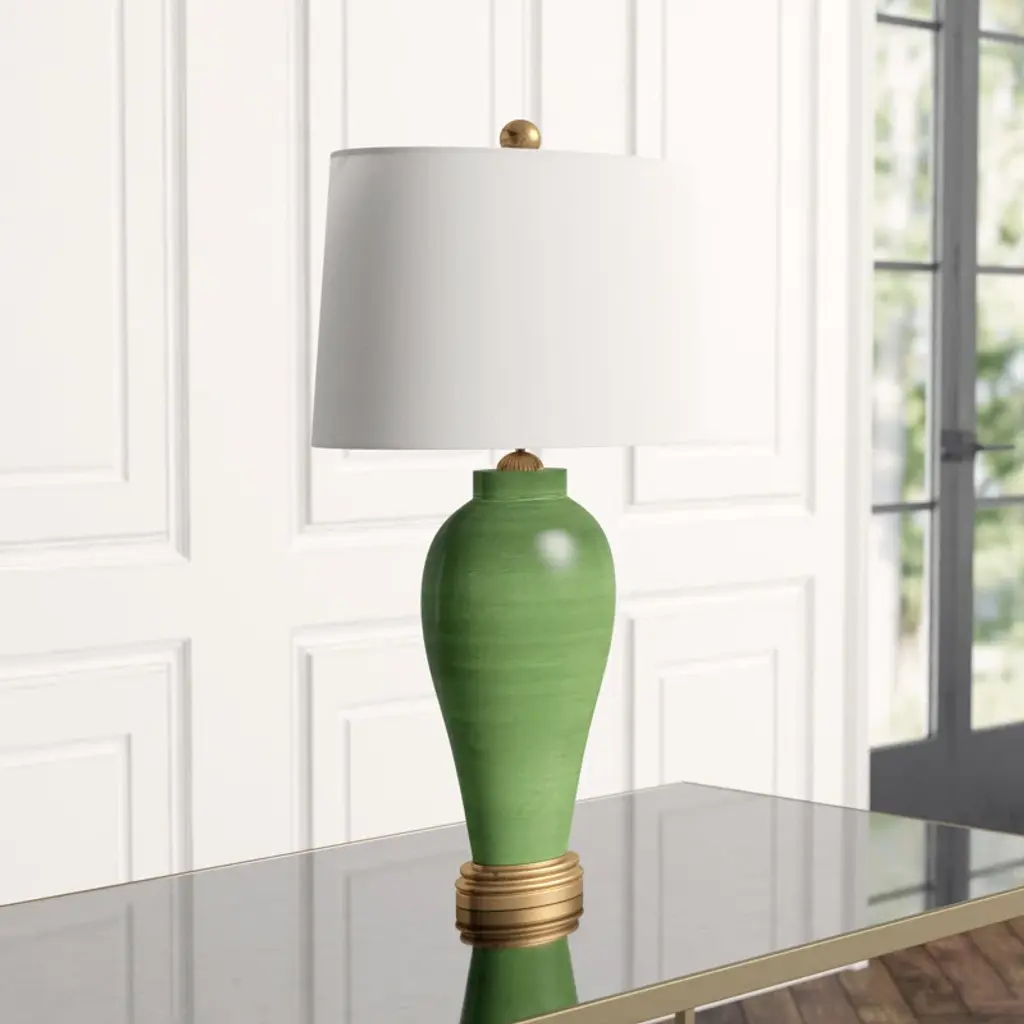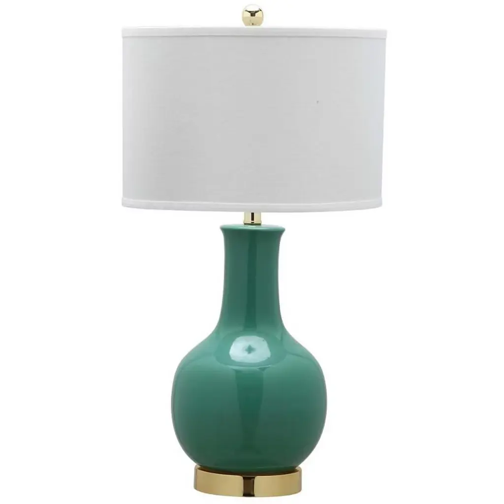 Saturated in fresh color and given a sleek silhouette, this modern table lamp dabbles in mid-century modern style. Embrace a lush gradient finish over ceramic in a shapely body, as a brass metal base offers lavish embellishments. Topped with a linen empire shade, this exquisite lamp is perfect for emphasizing bold color in a bedroom or main living area.