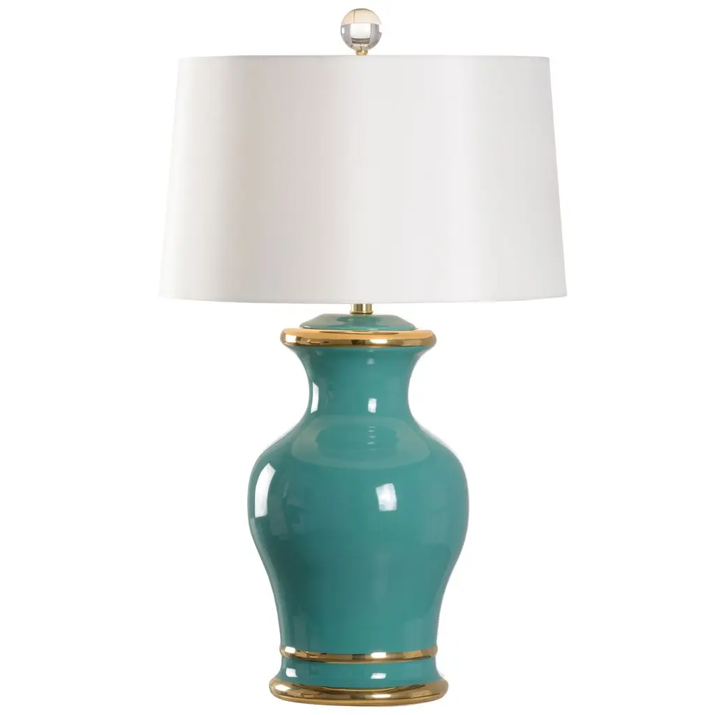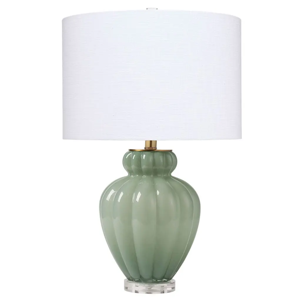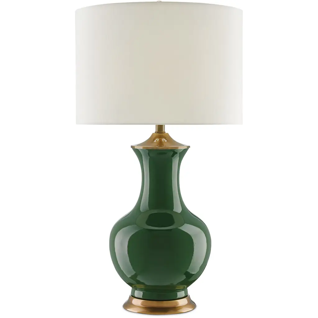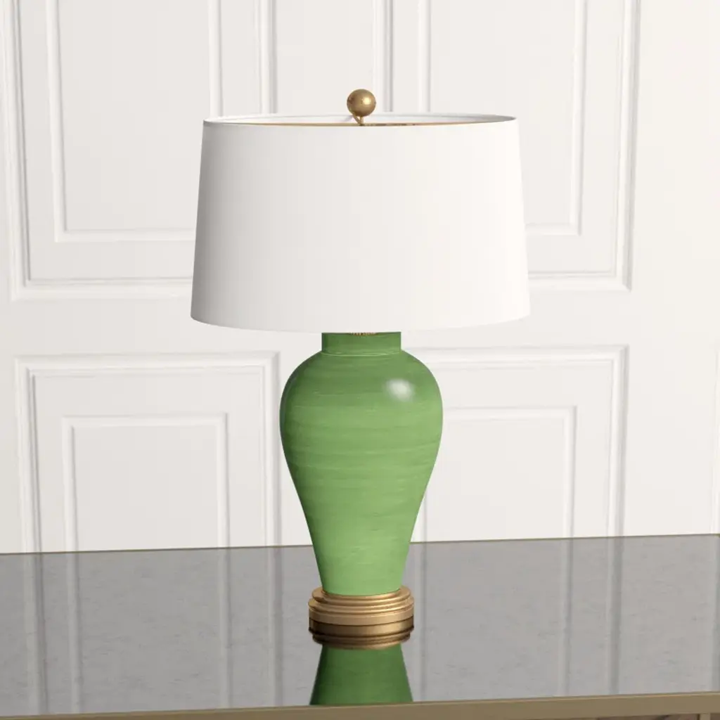 Saturated in fresh color and given a sleek silhouette, this modern table lamp dabbles in mid-century modern style. Embrace a lush gradient finish over ceramic in a shapely body, as a brass metal base offers lavish embellishments. Topped with a linen empire shade, this exquisite lamp is perfect for emphasizing bold color in a bedroom or main living area.