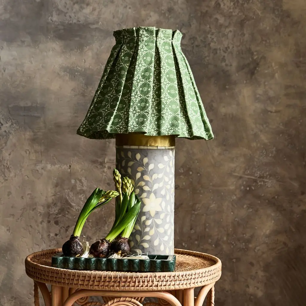 Artist made. Perfectly imperfect. Crafted by hand using by-product bone inlay, each lamp features slight variations in design for a one-of-a-kind piece. Finished with brass hardware and a fabric cord.