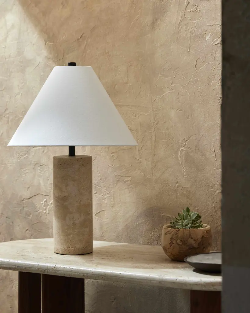 Collection: Botorrita Colors: Off White, Light Beige Material: Body: Travertine,Shade (Outside): Linen,Shade (Inside): Polystyrene,Finial: Iron Styles: Contemporary Made In: China Shade Material: LinenPolystyrene Shade Color: WhiteWhite Cord Length: 6' Switch Type: On/Off Number of Bulbs: 1 Socket Type: E-26 Bulb Wattage: 60W