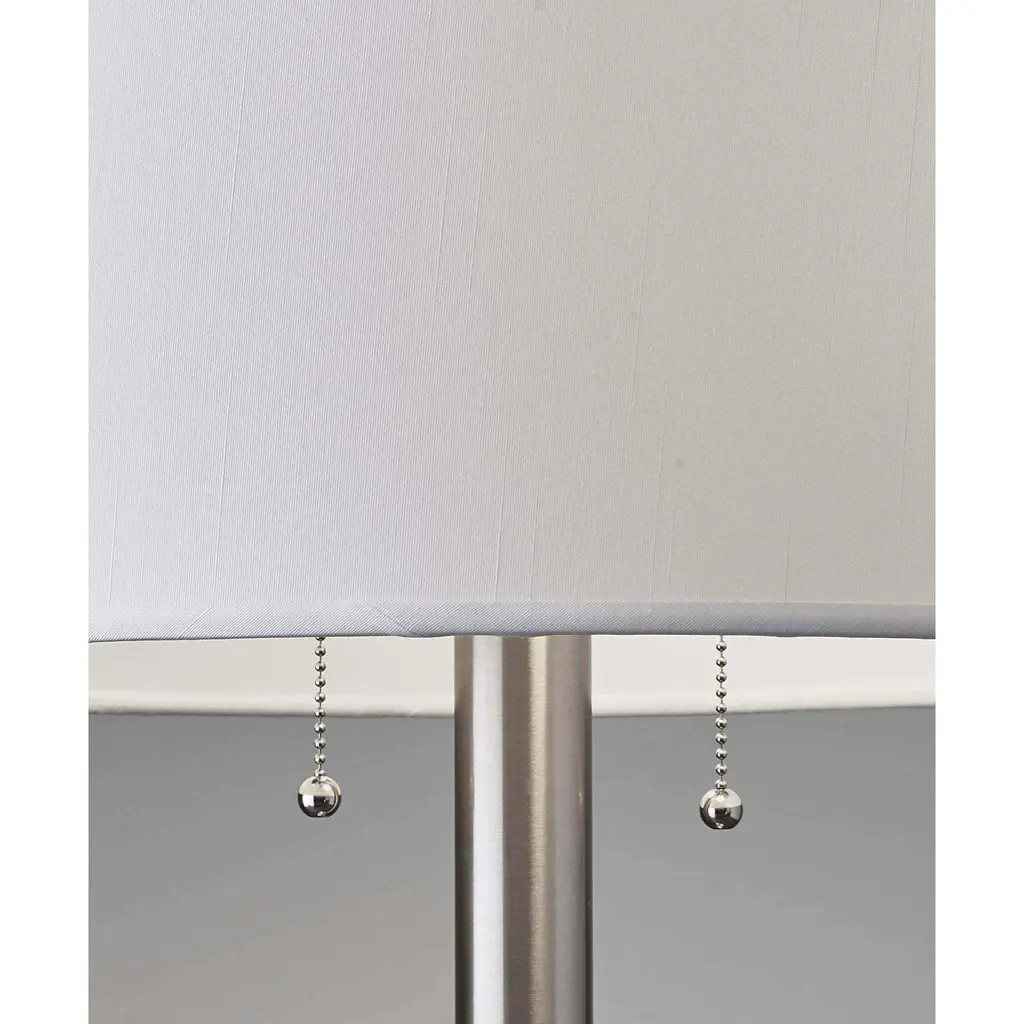 Each Boulevard lamp has a chunky satin steel pole and flat round base, with a white silk-like fabric drum shade and matching finial. Double sockets each have a ball-accented on/off pull chain switch. 2 x 100 Watt incandescent or 26 Watt CFL bulbs. 28” Height, 8” Base. Shade: 10” Height, 17” Diameter