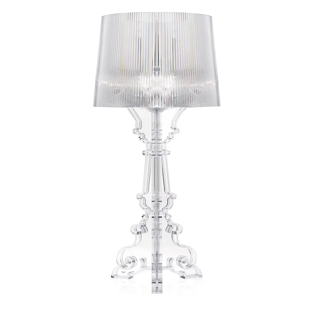 The Kartell Bourgie Lamp is a modern table lamp of unmistakable style and innovation. One of many Philippe Starck Kartell creations, this contemporary lamp assigns classic Baroque ornamentation to a lighting design comprised of signature Kartell plastic. Bourgie's three interconnecting elements form a decorative base, while its large 'pleated' lampshade projects dazzling reflections when illuminated. Highlights