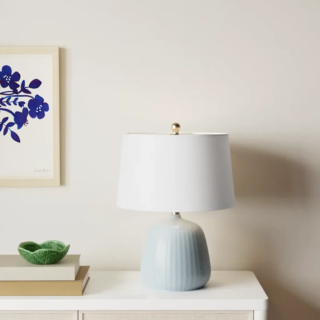 This table lamp will light up your country cottage-inspired decor and bring a touch of seaside charm to your home. The ceramic body is detailed with intricate designs, while the linen lampshade provides a classic finish. This lamp emits a soft, warm glow that will create an inviting atmosphere in any space. Its simple yet stylish design makes it perfect for any living room or bedroom. Plus, you can rest assured knowing its quality craftsmanship is built to last. Bring a piece of the ocean into your home today!