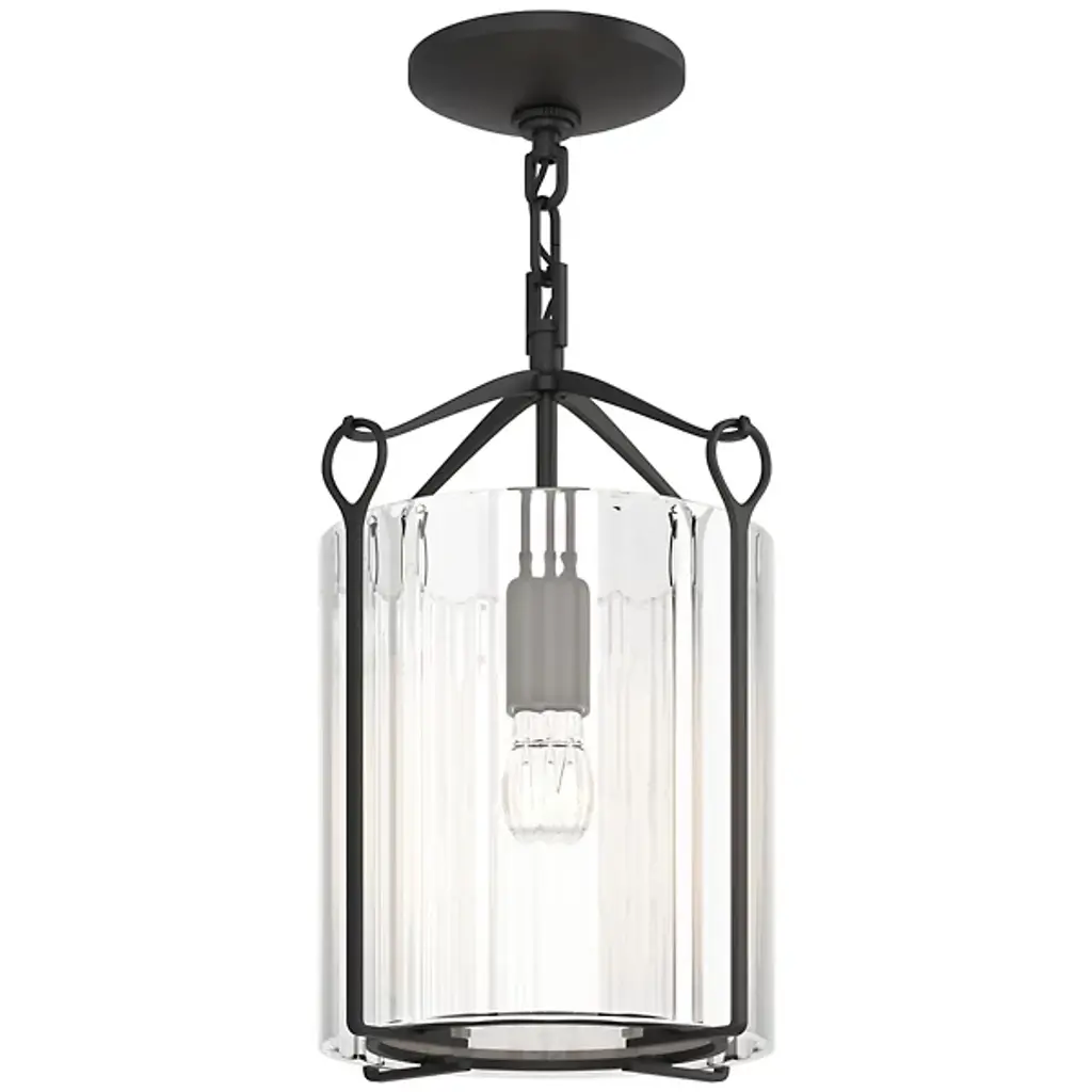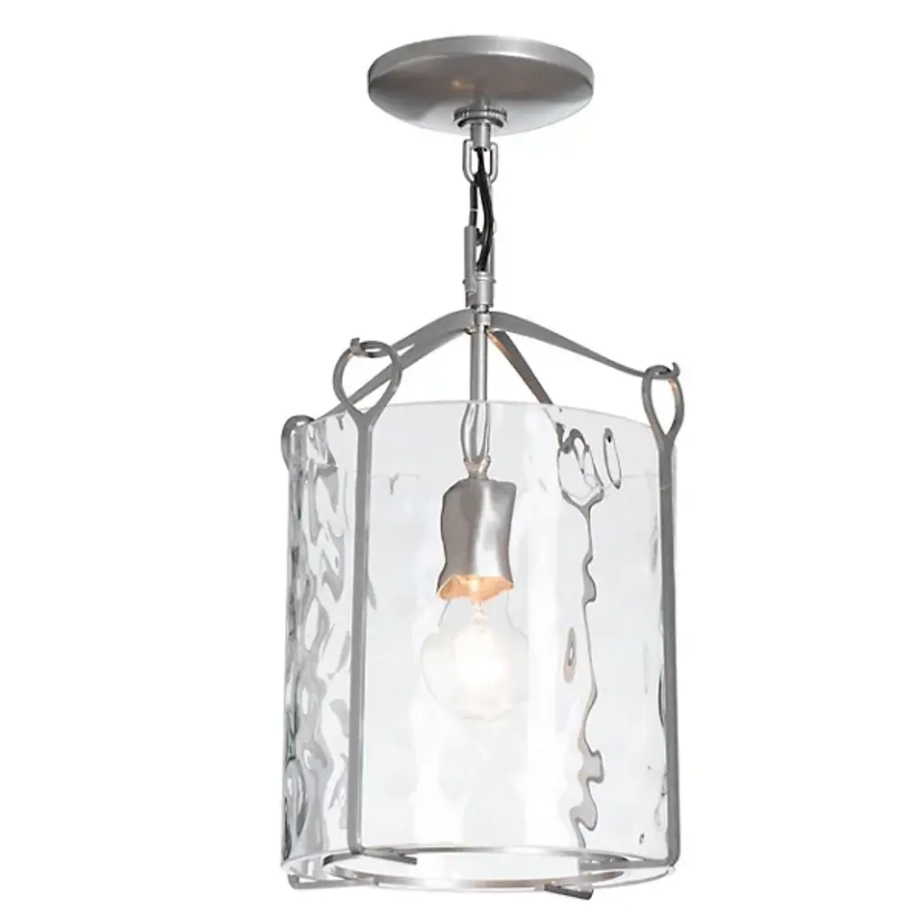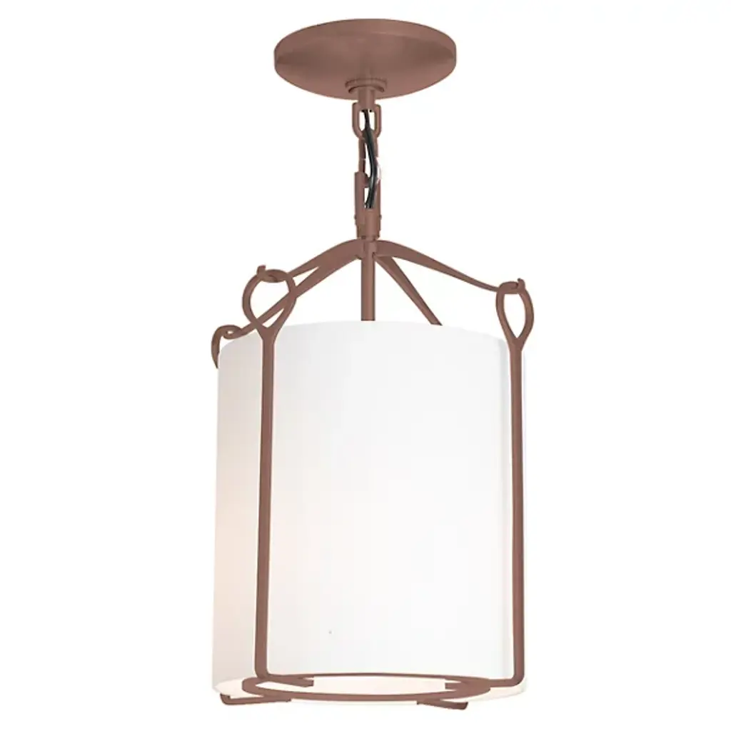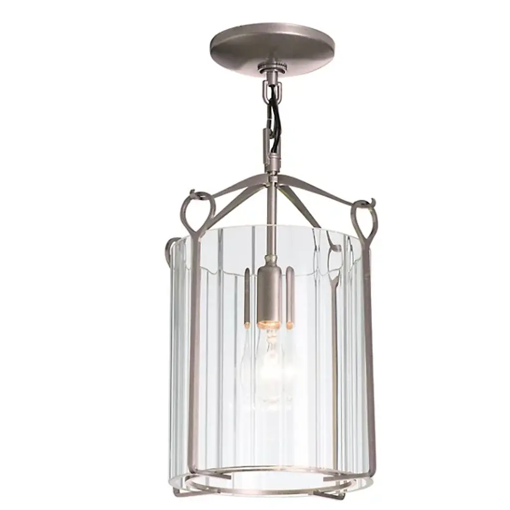 Bring a luminous accent to your home with the Bow Small Semi-Flushmount by Hubbardton Forge. This graceful fixture is supported by a circular canopy, with slender arms extending outward and forming gently curved hooks to catch looped metal bars. A cylindrical glass shade is set within the piece’s handcrafted framework, containing the fixture’s lamping softening its light. Simple and adaptable, this piece adds style to interiors as it emits a pleasant glow.