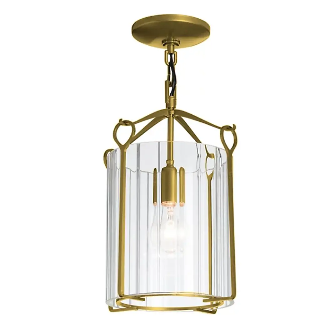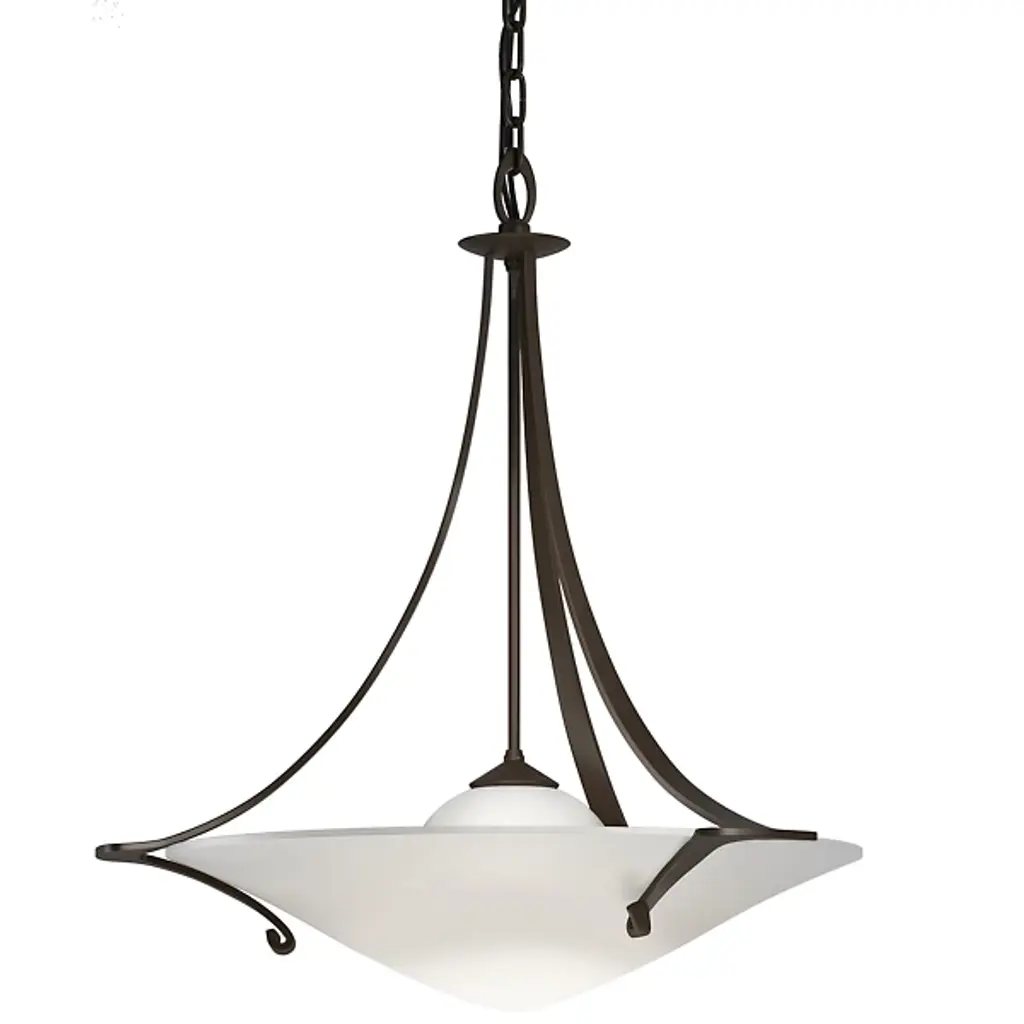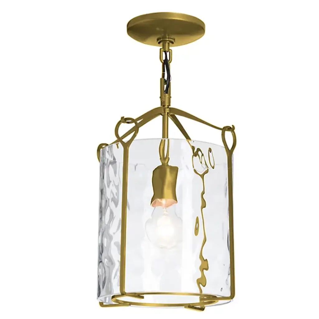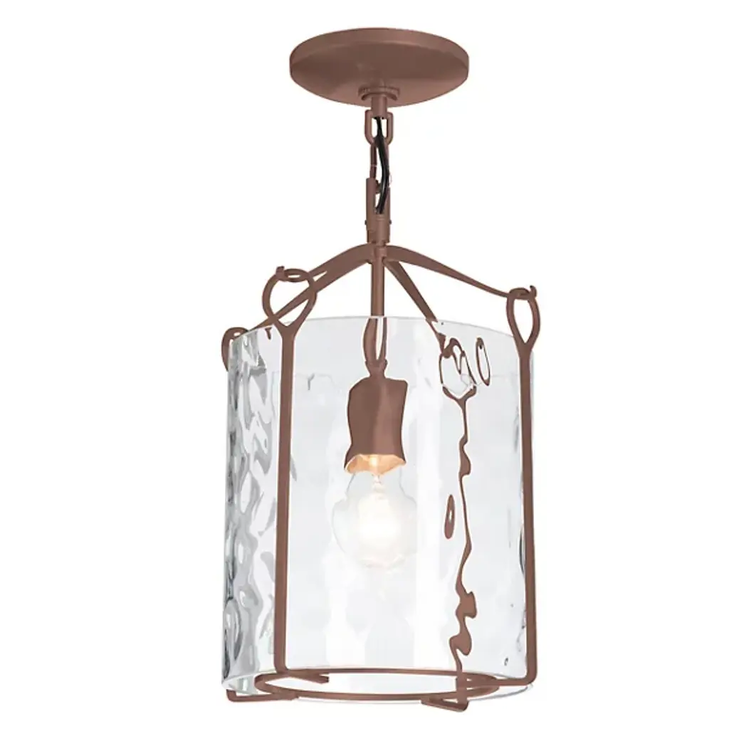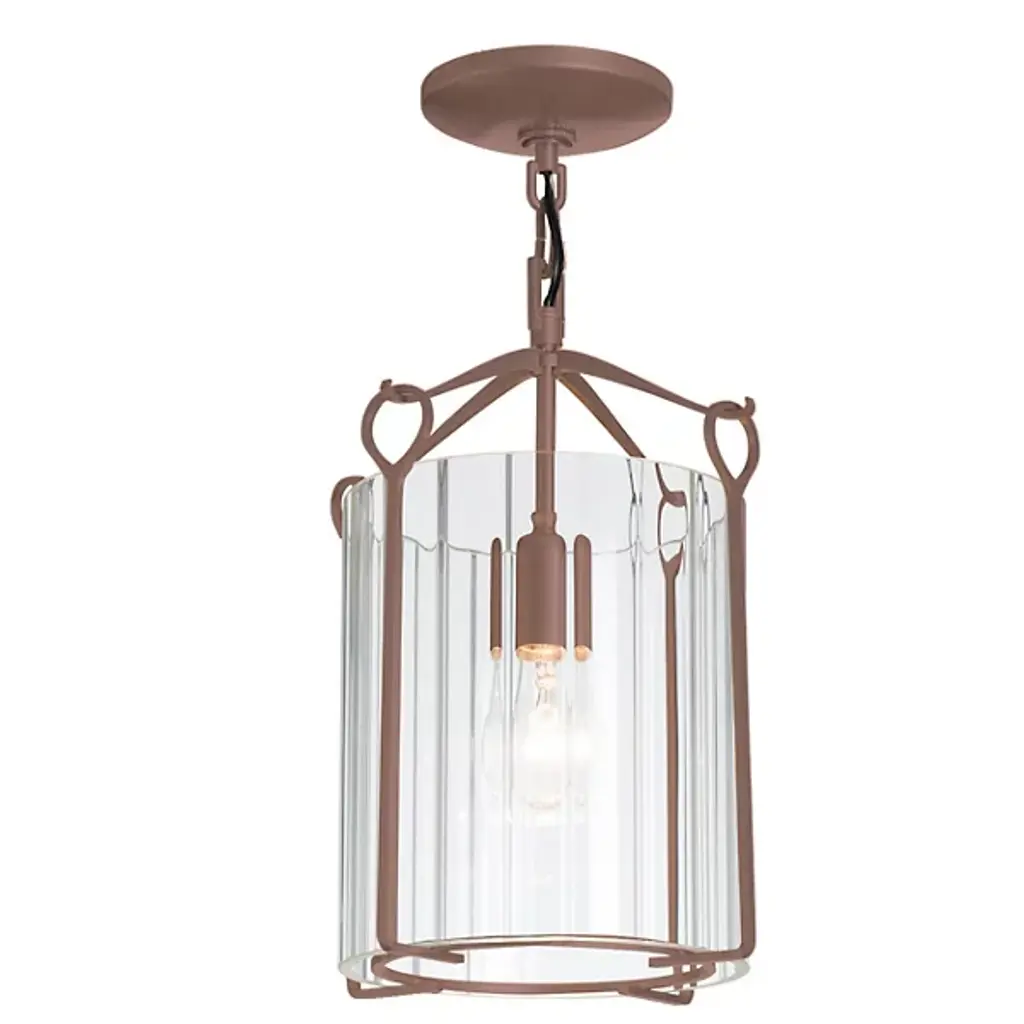 Bring a luminous accent to your home with the Bow Small Semi-Flushmount by Hubbardton Forge. This graceful fixture is supported by a circular canopy, with slender arms extending outward and forming gently curved hooks to catch looped metal bars. A cylindrical glass shade is set within the piece’s handcrafted framework, containing the fixture’s lamping softening its light. Simple and adaptable, this piece adds style to interiors as it emits a pleasant glow.