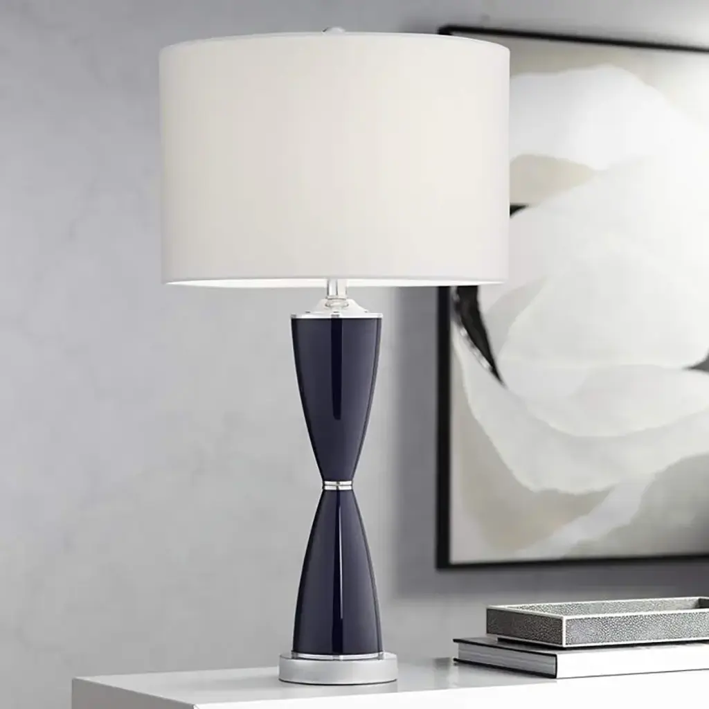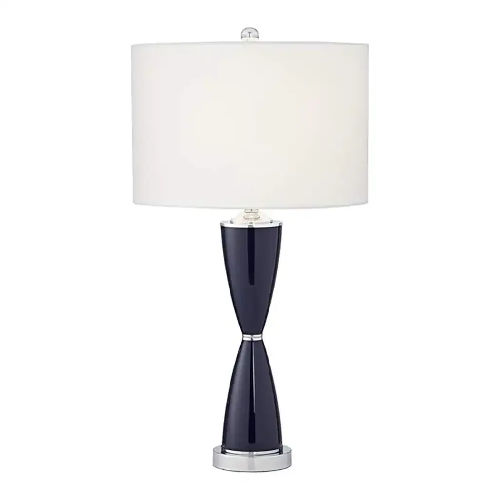 28 1/2" high overall. Drum shade is 15" wide across the top and bottom x 10" high. Uses one maximum 150 watt standard-medium base light bulb (not included). On-off socket switch. Bow-Tie modern table lamp Blue glass base with silver metal and clear glass accents. White cotton-poly blend fabric drum lamp shade. 8-foot long clear-silver cord. Brighten your modern decor with this graceful lamp design. The lamp features an eye-catching bow-tie profile in blue glass with silver metal and clear glass accents. A white cotton-blend fabric lamp shade offers final touch on top.