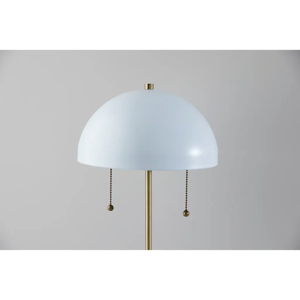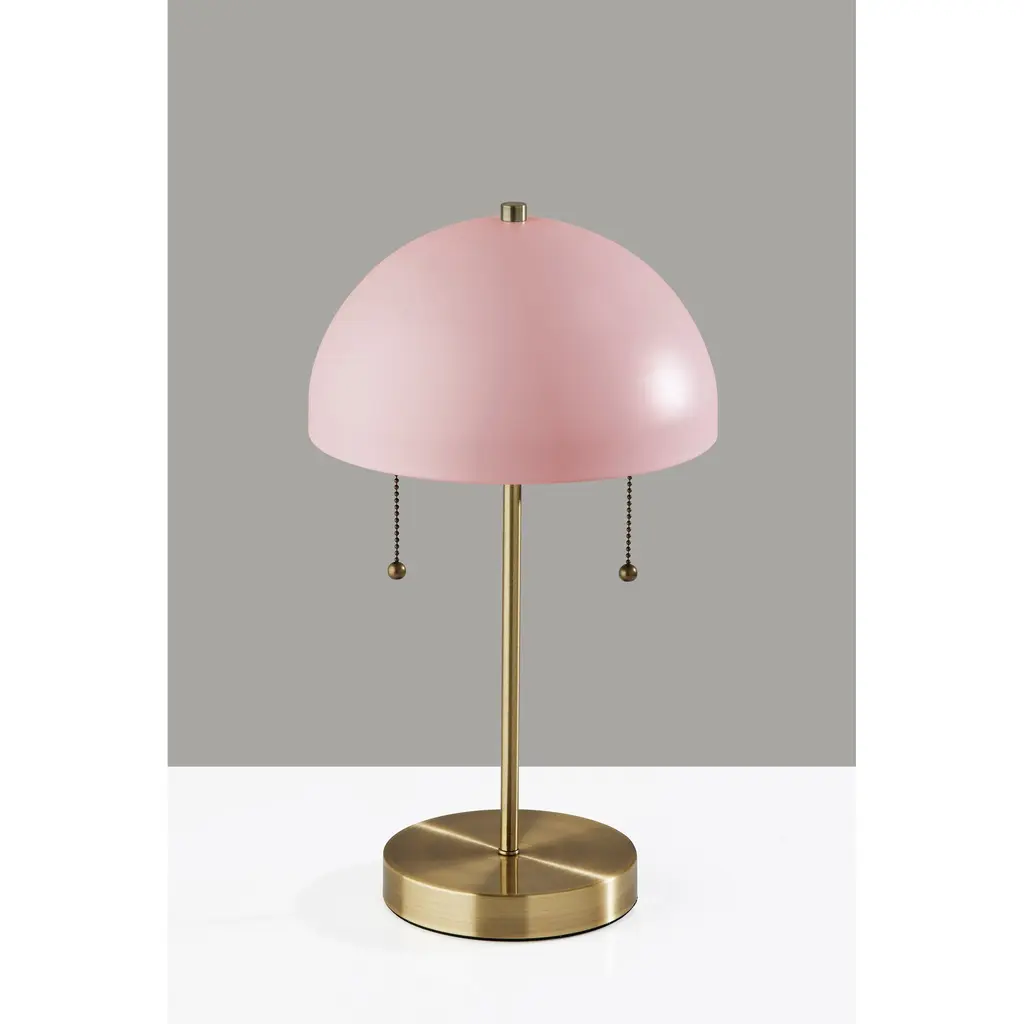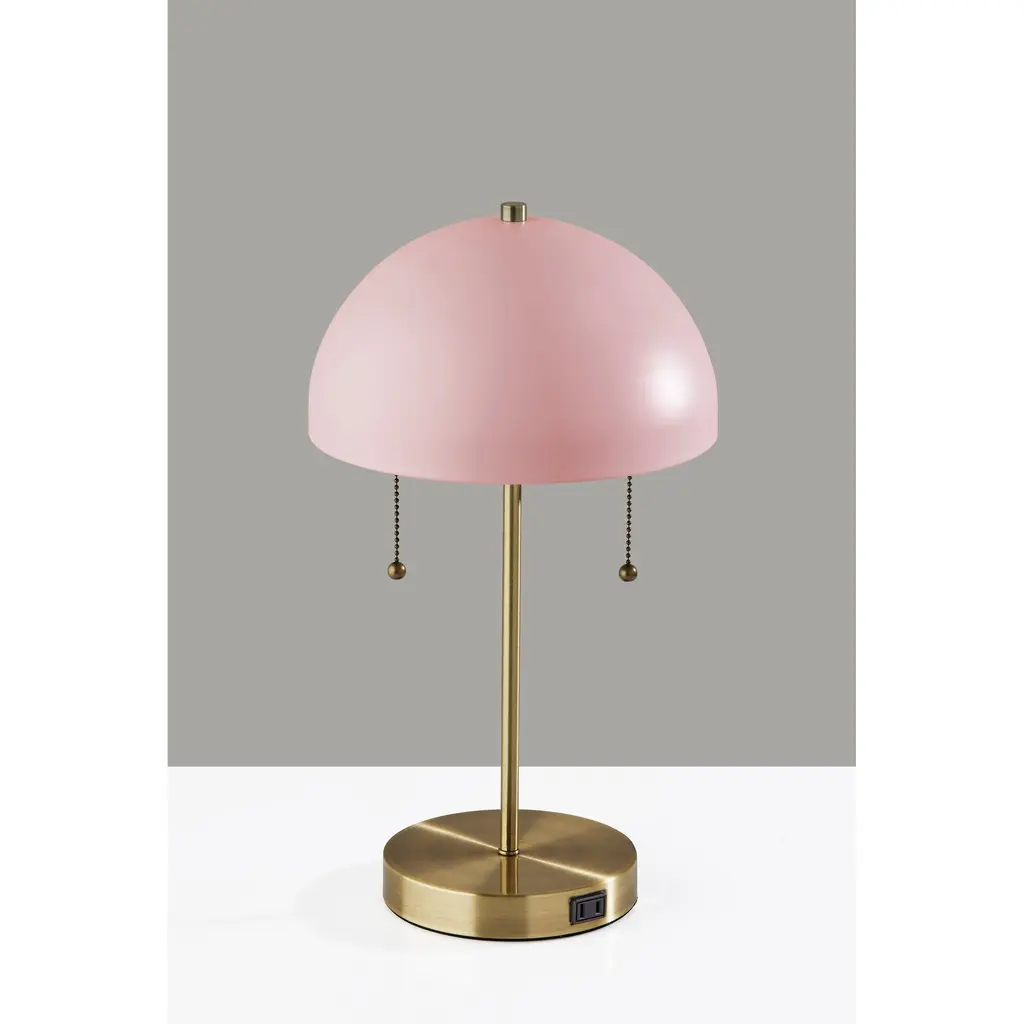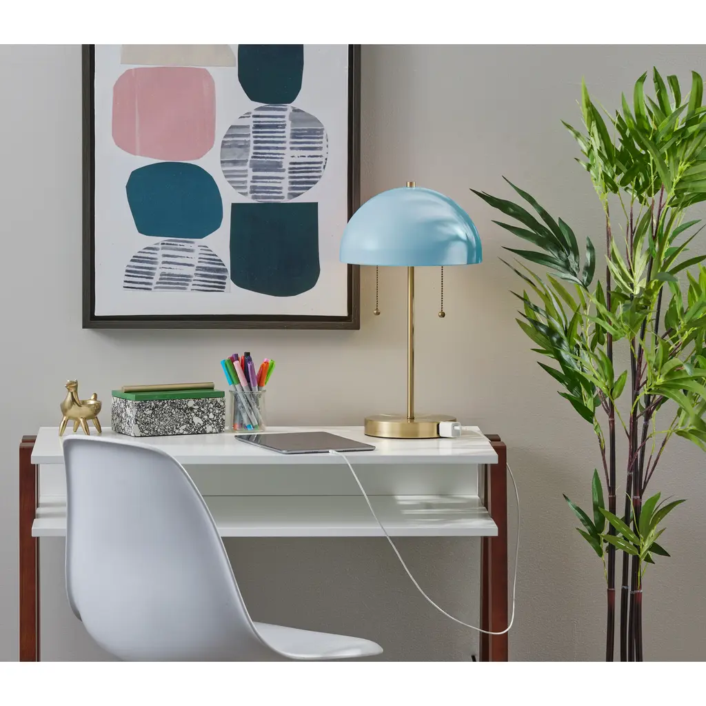 The 18" tall Bowie table lamp shines a light on vintage-inspired design in a mix of antique brass and black finishes. With its geometric symmetry and art deco flair, it is the perfect statement piece for desks, side tables, or nightstands. It features a sleek metal dome shade in black finish that curves like a canopy over the lamp's slender pedestal and round base, both featuring an antique brass finish. For convenient access to power right from your desk or table, the 6.5" diameter base features an AC outlet. Whether the lamp is turned on or off, the AC outlet will keep working normally. Operated by dual pull chains in antique brass finish to easily turn it on or off, the lamp powers two 40W bulbs (not included) and features a 5' clear cord. The Bowie table lamp is also available with a white, pale blue, or pale pink finish on the shade. Features: Blend of antique brass and black, white, pale blue or pale pink finishes and simple design complement mid-century modern decor Requires 2 x 40.00 watts E26 bulbs (Not Included) Compatible with 16W LED bulb) 2 Pull Chain Switches 60-inch Cord 1-Year Limited Manufacturer Warranty Measurements: Height is 18 inches Width is 10-inches Extension/Depth is 10-inches Shade measures 10" Dia. X 5.325"H Base Measures 6.5" Dia Weight: 3.60 lbs
