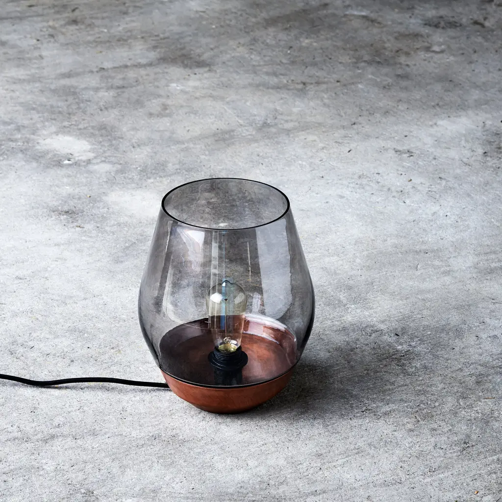 A copper "bowl" is the base for this substantial table lamp, with a raw or verdigris patina and topped with a smoky or green-tinted shade. The pull of a campfire is recalled in the glowing reflection through the tinted shades, a sumptuous reimagining on traditional lantern lights. Pair with an Edison Antique E27 bulb for optimum effect. Copenhagen-based New Work's creative director Knut Bendik Humlevik embraces the unvarnished character of the materials in this statement piece for a living area or salon.