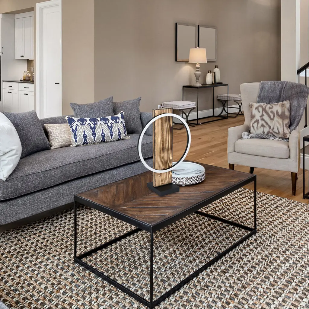 The Boyal LED table lamp by Eglo has a rustic yet refined appearance. This table lamp light features a brushed pine wood finish. Its integrated LED light source emanates from the single black circular ring creating a look that’s both rustic and modern