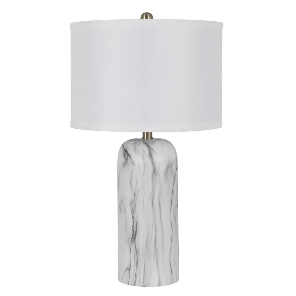 Contemporary charm characterizes the conical base of this modern table lamp. A radiant mix of chromed metal components and white faux marble yields an elegant geometric effect with an artful influence. A chrome finial and linen drum shade complete the look.-Faux marble resin base-100% cotton hardback tapered drum shade-60" silk cord with standard USA 2-prong plug -On-off switch on socket-Takes one maximum 100 watt or equivalent bulb -Eco-friendly 9W LED bulb included-UL Listed-Color: White/black with white shade-Body Material: Resin-Base Material: NA-Finial Material: Plastic-Finial Color: Chrome-Harp Color: Silver-Includes: One (1) lamp(s)-Minor Assembly Required-Lamp: 29 inches high x 14 inches wide x 14 inches deep-Shade: 10 inches high x 14 inches wide x 14 inches deepYou see a lamp.We see a decorative work of art.A perfectly curved shade casts a dramatic shadow on a floor. A silk cord you never want to hide. LED lightbulbs: as easy on the environment as they are on the eyes. The JONTHAN Y Lighting collection considers every detail from impeccably sourced materials to designer styling. And our prices are so attractive, we''ve transformed a functional necessity into a fashion accessory.JONATHAN Y Lighting a fashion revolution in home dcor.