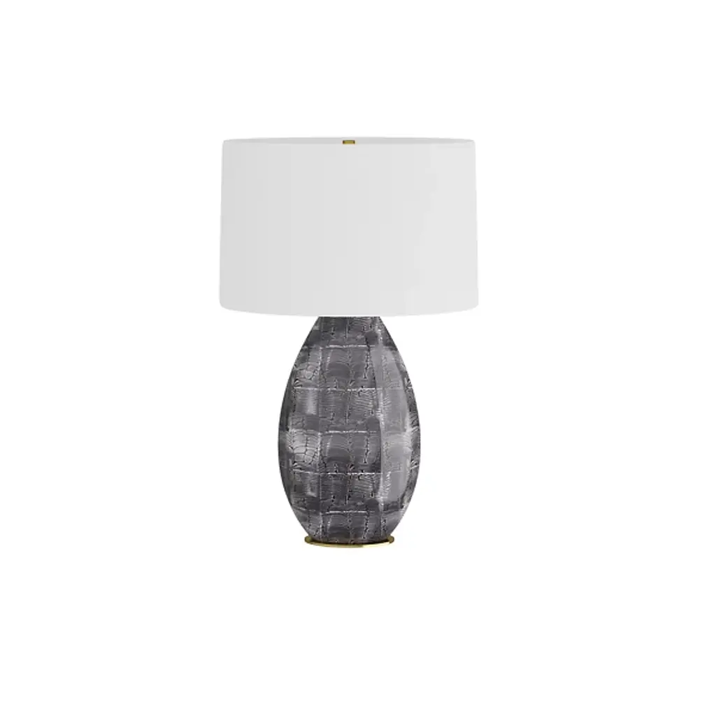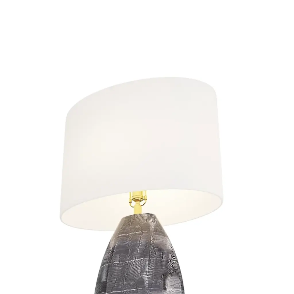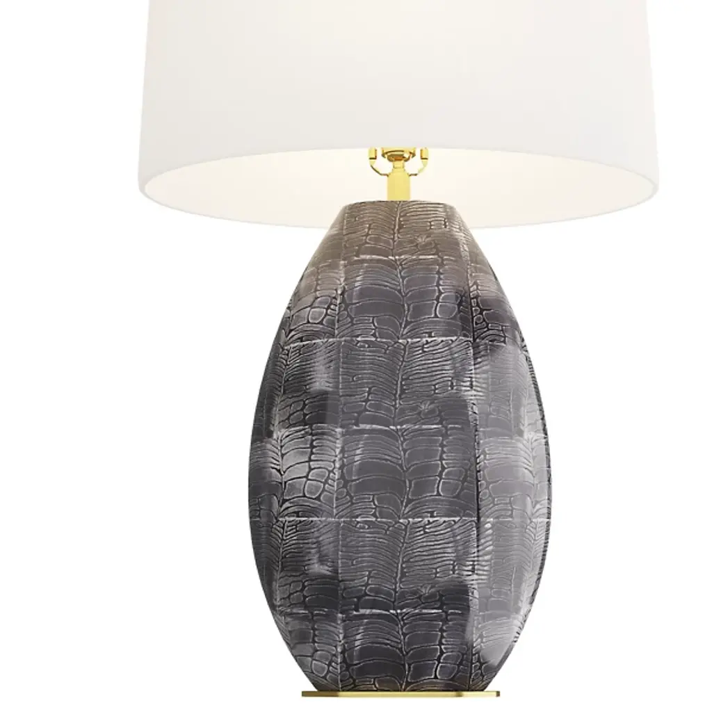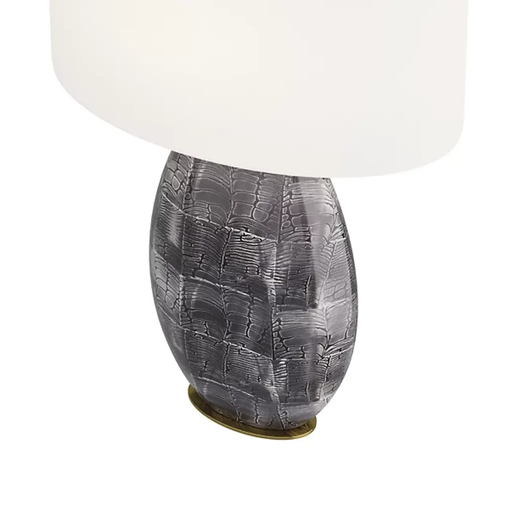 The Brando Table Lamp from Arteriors features a sleek porcelain form, capturing the allure of reptilian scales. The gentle undulations highlight a mesmerizing blend of gray, black, and white patterns, elegantly perched on an oval base finished in antique brass. Topped with an oval drum shade in white microfiber lined with cotton, the lamp offers a neutral accent. Complemented by a taupe cloth cord and a three-way rotary switch, it's an exquisite addition to your decor.