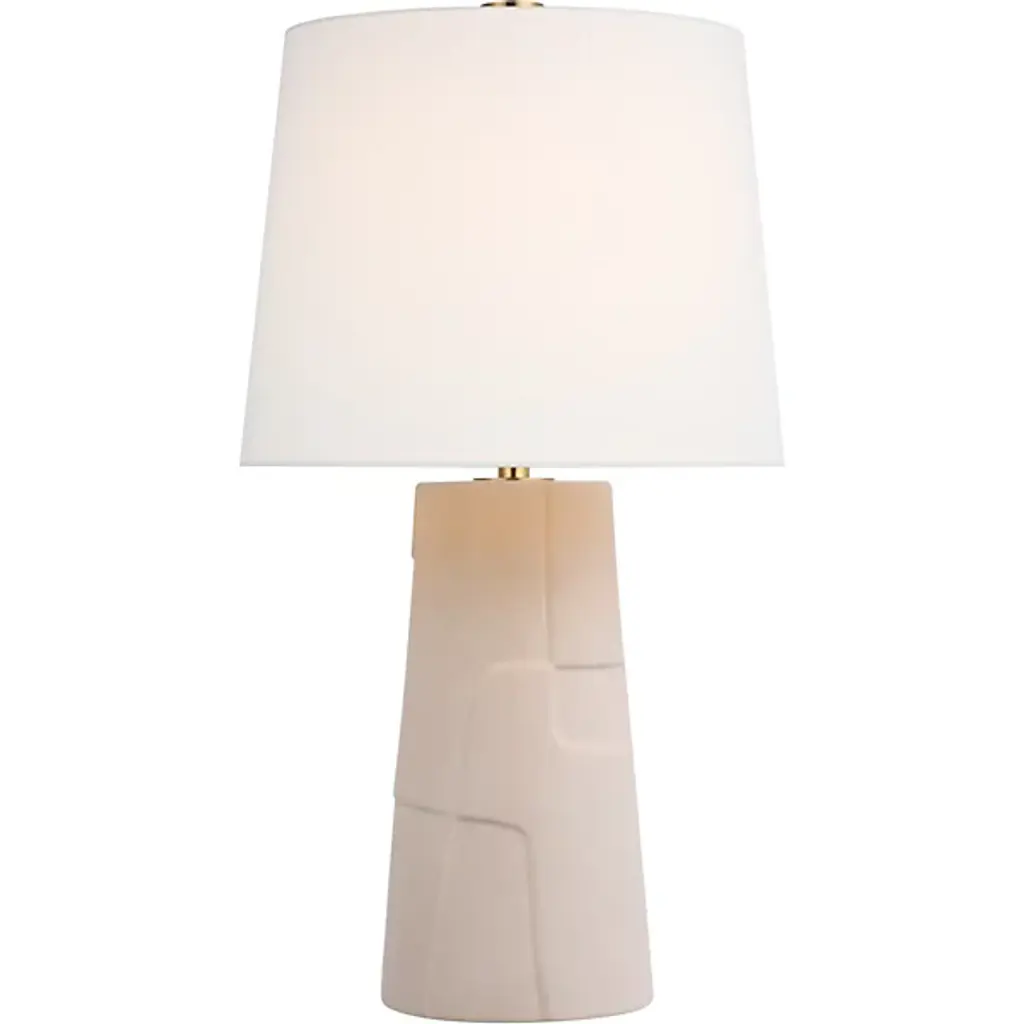 The Braque Debossed Table Lamp by Visual Comfort Signature, formerly known as Visual Comfort, has a cool, geometric feel as it supports a crisp, classically styled shade above a tapered body with a minimal, modern pattern shaped into it. The reactive glaze coating that dresses up the base adds an elevated, elegant touch to this lamp and is complemented with a simple, metal finial that peeks out above the shade, completing the look of this fun yet functional design.